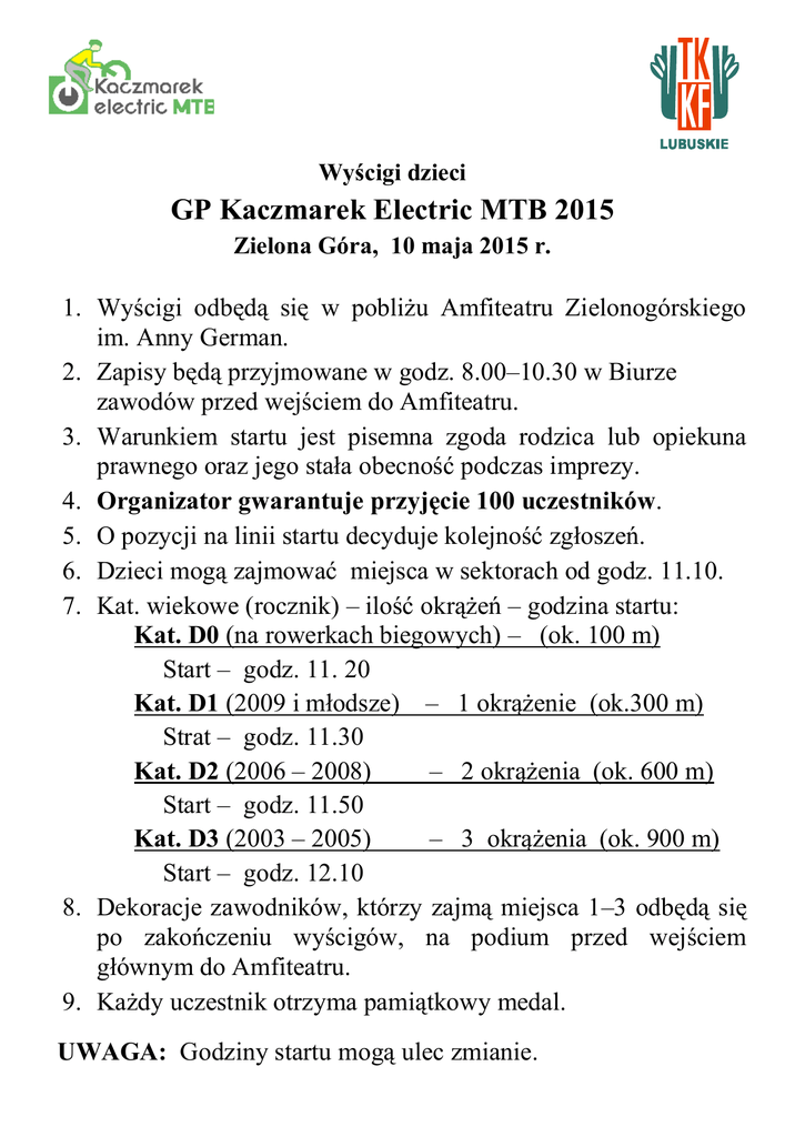 Wyścigi dzieci GP Kaczmarek Electric MTB 2015 Zielona Góra, 10 maja 2015 r. 1. Wyścigi odbędą się w pobliżu Amfiteatru Zielonogórskiego im. Anny German. 2. Zapisy będą przyjmowane w godz. 8.00–10.30 w Biurze zawodów przed wejściem do Amfiteatru. 3. Warunkiem startu jest pisemna zgoda rodzica lub opiekuna prawnego oraz jego stała obecność podczas imprezy. 4. Organizator gwarantuje przyjęcie 100 uczestników. 5. O pozycji na linii startu decyduje kolejność zgłoszeń. 6. Dzieci mogą zajmować miejsca w sektorach od godz. 11.10. 7. Kat. wiekowe (rocznik) – ilość okrążeń – godzina startu: Kat. D0 (na rowerkach biegowych) – (ok. 100 m) Start – godz. 11. 20 Kat. D1 (2009 i młodsze) – 1 okrążenie (ok.300 m) Strat – godz. 11.30 Kat. D2 (2006 – 2008) – 2 okrążenia (ok. 600 m) Start – godz. 11.50 Kat. D3 (2003 – 2005) – 3 okrążenia (ok. 900 m) Start – godz. 12.10 8. Dekoracje zawodników, którzy zajmą miejsca 1–3 odbędą się po zakończeniu wyścigów, na podium przed wejściem głównym do Amfiteatru. 9. Każdy uczestnik otrzyma pamiątkowy medal. UWAGA: Godziny startu mogą ulec zmianie.
