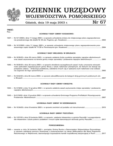 DZIENNIK URZÊDOWY WOJEWÓDZTWA POMORSKIEGO Gdañsk, dnia 19 maja 2003 r. Nr 67 TREÆ: Poz.: UCHWA£Y RADY GMINY KOSAKOWO: 1037 Nr IV/1/2003 z dnia 11 lutego 2003 r. w sprawie uchwalenia zmiany do miejscowego planu zagospodarowania przestrzennego dla dzia³ki Nr 29 obr. Pogórze, gm. Kosakowo ....................................................................... 2903 1038 Nr IV/2/2003 z dnia 11 lutego 2003 r. w sprawie uchwalenia miejscowego planu zagospodarowania przestrzennego czêci dzia³ki Nr 71/39 w Pierwoszynie gm. Kosakowo ...................................................................... 2904 UCHWA£Y RADY MIEJSKIEJ W BRUSACH: 1039 Nr III/26/03 z dnia 26 marca 2003 r. w sprawie ustalenia liczby punktów sprzeda¿y napojów alkoholowych oraz zasad usytuowania na terenie gminy miejsc sprzeda¿y i podawania napojów alkoholowych ................... 2905 1040 Nr III/35/03 z dnia 26 marca 2003 r. w sprawie okrelenia szczegó³owych zasad i trybu umarzania wierzytelnoci jednostek organizacyjnych gminy Brusy z tytu³u nale¿noci pieniê¿nych, do których nie stosuje siê przepisów ustawy Ordynacja podatkowa, udzielania innych ulg w sp³acaniu tych nale¿noci oraz wskazania organów do tego uprawnionych ....................................................................................................................... 2905 1041 Nr III/42/03 z dnia 26 marca 2003 r. w sprawie zakwalifikowania do kategorii dróg gminnych publicznych ulic w Brusach .................................................................................................................................................................. 2907 UCHWA£Y RADY GMINY KWIDZYN: 1042 Nr II/18/02 z dnia 12 grudnia 2002 r. w sprawie ustalenia zasad usytuowania miejsc sprzeda¿y i podawania napojów alkoholowych ............................................................................................................................................. 2907 1043 Nr II/19/02 z dnia 12 grudnia 2002 r. w sprawie uchwalenia Gminnego Programu Profilaktyki i Rozwi¹zywania Problemów Alkoholowych ....................................................................................................................................... 2907 UCHWA£A RADY GMINY W DZIEMIANACH: 1044 Nr VI/34/03 z dnia 9 kwietnia 2003 r. w sprawie zwolnieñ od podatku od nieruchomoci .................................. 2915 UCHWA£A RADY GMINY PSZCZÓ£KI: 1045 Nr V/57/03 z dnia 23 kwietnia 2003 r. w sprawie: ustalania inkasentów w gminie Pszczó³ki i wynagrodzenia dla inkasentów z tytu³u poboru podatków i innych op³at stanowi¹cych dochody gminy Pszczó³ki ................... 2917 POROZUMIENIA: 1046 zawarte w dniu 24 kwietnia 2003 r. pomiêdzy Gmin¹ Rumia a Samorz¹dem Województwa Pomorskiego w sprawie udzielenia pomocy finansowej z przeznaczeniem na zakup defibrylatora dla Stacji Pogotowia Ratunkowego w Wejherowie, stanowi¹cego wyposa¿enie karetki wypadkowej stacjonuj¹cej w Rumi ............ 2917 Dziennik Urzêdowy Województwa Pomorskiego 2902 1047 zawarte w dniu 30 kwietnia 2003 r. pomiêdzy Gmin¹ Miasta Rumia a Gmin¹ Wejherowo w sprawie wspólnego finansowania z Gmin¹ Wejherowo zakupu wiaty celem ustawienia jej na przystanku autobusowym zlokalizowanym w Rumi przy ul. Górniczej ..................................................................................................................... 2918 UCHWA£A RADY MIEJSKIEJ W KÊPICACH: 1048 Nr III/13/2002 z dnia 11 grudnia 2002 r. w sprawie op³at za sk³adowanie i utylizacjê odpadów komunalnych na wysypisku komunalnym w Ob³ê¿u w roku 2003 ............................................................................................... 2918 UCHWA£Y RADY MIEJSKIEJ W USTCE: 1049 Nr VIII/60/2003 z dnia 24 kwietnia 2003 r. w sprawie zwolnieñ w podatku od nieruchomoci ........................... 2919 1050 Nr VIII/61/2003 z dnia 24 kwietnia 2003 r. w sprawie zmiany uchwa³y Nr III/11/2002 z dnia 5 grudnia 2002 r. w sprawie stawek podatku od nieruchomoci na 2003 r. ...................................................................................... 2919 1051 Nr VIII/62/2003 z dnia 24 kwietnia 2003 r. w sprawie zmiany uchwa³y Nr I/2/2000 Rady Miejskiej w Ustce z dnia 27 stycznia 2000 r. w sprawie op³aty targowej ............................................................................................ 2920 UCHWA£A RADY GMINY DAMNICA: 1052 Nr II/4/02 z dnia 5 grudnia 2002 r. w sprawie Statutu Gminy Damnica ................................................................. 2920 UCHWA£A RADY GMINY LIPUSZ: 1053 Nr VII/35/2003 z dnia 28 kwietnia 2003 r. w sprawie zmiany uchwa³y Nr III/12/2002 Rady Gminy Lipusz z dnia 10 grudnia 2002 r. w sprawie okrelenia wysokoci stawek podatków i op³at lokalnych w Gminie Lipusz na rok 2003 ................................................................................................................................................................ 2931 ZARZ¥DZENIE PORZ¥DKOWE DYREKTORA URZÊDU MORSKIEGO W S£UPSKU: 1054 Nr 1 z dnia 10 maja 2003 r. w sprawie bezpieczeñstwa ¿eglugi statków udaj¹cych siê w podró¿e próbne ...... 2931 OG£OSZENIE STAROSTY KARTUSKIEGO: 1055 z dnia 12 maja 2003 r. w sprawie zg³aszania kandydatów do Powiatowej Spo³ecznej Rady do Spraw Osób Niepe³nosprawnych w Kartuzach ............................................................................................................................ 2935 OG£OSZENIE KOLEGIUM REGIONALNEJ IZBY OBRACHUNKOWEJ W GDAÑSKU: 1056 w sprawie og³oszenia konkursu na stanowisko cz³onka Kolegium Regionalnej Izby Obrachunkowej w Gdañsku ................................................................................................................................................................. 2936 2903 Poz. 1037 1037 UCHWA£A Nr IV/1/2003 Rady Gminy Kosakowo dnia 11 lutego 2003 r. w sprawie uchwalenia zmiany do miejscowego planu zagospodarowania przestrzennego dla dzia³ki nr 
