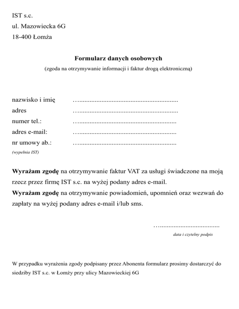 IST s.c. ul. Mazowiecka 6G 18-400 Łomża Formularz danych osobowych (zgoda na otrzymywanie informacji i faktur drogą elektroniczną) nazwisko i imię ….......................................................... adres ….......................................................... numer tel.: …......................................................... adres e-mail: …......................................................... nr umowy ab.: …......................................................... (wypełnia IST) Wyrażam zgodę na otrzymywanie faktur VAT za usługi świadczone na moją rzecz przez firmę IST s.c. na wyżej podany adres e-mail. Wyrażam zgodę na otrzymywanie powiadomień, upomnień oraz wezwań do zapłaty na wyżej podany adres e-mail i/lub sms. …................................... data i czytelny podpis W przypadku wyrażenia zgody podpisany przez Abonenta formularz prosimy dostarczyć do siedziby IST s.c. w Łomży przy ulicy Mazowieckiej 6G