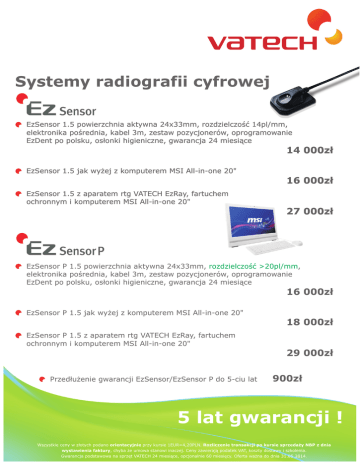 Systemy radiografii cyfrowej EzSensor 1.5 powierzchnia aktywna 24x33mm, rozdzielczoœæ 14pl/mm, elektronika poœrednia, kabel 3m, zestaw pozycjonerów, oprogramowanie EzDent po polsku, os³onki higieniczne, gwarancja 24 miesi¹ce 14 000z³ EzSensor 1.5 jak wy¿ej z komputerem MSI All-in-one 20" 16 000z³ EzSensor 1.5 z aparatem rtg VATECH EzRay, fartuchem ochronnym i komputerem MSI All-in-one 20" 27 000z³ EzSensor P 1.5 powierzchnia aktywna 24x33mm, rozdzielczoœæ >20pl/mm, elektronika poœrednia, kabel 3m, zestaw pozycjonerów, oprogramowanie EzDent po polsku, os³onki higieniczne, gwarancja 24 miesi¹ce 16 000z³ EzSensor P 1.5 jak wy¿ej z komputerem MSI All-in-one 20" 18 000z³ EzSensor P 1.5 z aparatem rtg VATECH EzRay, fartuchem ochronnym i komputerem MSI All-in-one 20" 29 000z³ Przed³u¿enie gwarancji EzSensor/EzSensor P do 5-ciu lat 900z³ 5 lat gwarancji ! Wszystkie ceny w z³otych podano orientacyjnie przy kursie 1EUR=4,20PLN. Rozliczenie transakcji po kursie sprzeda¿y NBP z dnia wystawienia faktury, chyba ¿e umowa stanowi inaczej. Ceny zawieraj¹ podatek VAT, koszty dostawy i szkolenia. Gwarancja podstawowa na sprzêt VATECH 24 miesi¹ce, opcjonalnie 60 miesiêcy. Oferta wa¿na do dnia 31.05.2014. Po³udniowokoreañska firma Vatech zosta³a za³o¿ona w 1992 roku, od pocz¹tku specjalizuj¹c siê w urz¹dzeniach do rentgenodiagnostyki. Wykorzystuj¹c potencja³ innowacyjnej gospodarki rozwija³a siê nies³ychanie szybko i w 2005 r. wprowadzi³a jako pierwsza na œwiecie hybrydowy system pantomografii, cefalometrii i tomografii CBCT (3-in-one) Picasso Trio. Kolejne lata owocowa³y kolejnymi innowacyjnymi produktami takimi jak seria pantomografów Pax, przenoœne systemy rtg AnyRay czy systemy radiografii EzSensor. Produkty te by³y wielokrotnie nagradzane na ca³ym œwiecie (reddot Award, Medical Design Excellence, iF product design, MDEA, Japan GD etc.). Obecnie grupa Vatech sk³ada siê z kilku osobnych dzia³ów zajmuj¹cych siê m.in. produkcj¹ stomatologicznych urz¹dzeñ rtg, produkcj¹ mechanicznych podzespo³ów, konstrukcji i obudów, oprogramowania (Ewoo Soft), systemów rtg medycznych i weterynaryjnych oraz, co szczególnie istotne, opracowaniem i produkcj¹ paneli obrazowych. O innowacyjnoœci Vatech mog¹ œwiadczyæ liczne rozwi¹zania wprowadzane jako pierwsze na rynku globalnym: pierwszy system 3-in-one w 2005r, pierwszy system z automatycznym prze³¹czaniem PAN/CBCT w 2007r, pierwszy aparat z funkcj¹ wielowarstwowej pantomografii Multifocus/Autofocus w 2009r, najszybszy cefalostat skanuj¹cy, czy te¿ pierwszy system zrównuj¹cy dawkê pantomografii i tomografii CBCT obejmuj¹cej oba ³uki zêbowe. Od 2009 roku udzia³ Vatech w rynku globalnym lokuje firmê wœród 5-ciu najwiêkszych producentów, z siln¹ tendencj¹ wzrostow¹. W roku 2012 Vatech Europe wybra³ na swojego nowego partnera w Polsce GENT s.c. uznaj¹c nasze doœwiadczenie i wyniki sprzeda¿y, a przede wszystkim zaanga¿owanie w profesjonalne wsparcie Klienta. Rozpoczynaj¹c w 1999r. dystrybucjê produktów Gendex, osi¹gnêliœmy w ci¹gu kilku nastêpnych lat status lidera rynku radiologii stomatologicznej z mark¹, która wczeœniej nie by³a obecna w kraju. Doœwiadczenie, profesjonalizm w rozumieniu potrzeb Klienta, otwartoœæ na potrzeby szkoleniowe naszych Klientów i wyposa¿enie w najnowoczeœniejsze urz¹dzenia pomiarowe i serwisowe pozwalaj¹ na uzyskanie akredytacji PCA w zakresie laboratorium pomiarowego rtg. Innowacyjnoœæ VATECH i doœwiadczenie GENT to gwarancja najlepszych wyników w radiodiagnostyce. Systemy radiografii VATECH s¹ klas¹ Premium w obrazowaniu wewn¹trzustnym. Dostêpne w dwóch zakresach rozdzielczoœci rzeczywistej, testowanej fantomem - 14pl/mm dla EzSensor, oraz ponad 20pl/mm dla EzSensor Premium. Systemy EzSensor charakteryzuj¹ siê szczególnie korzystnym wspó³czynnikiem SNR (Signal-to-Noise Ratio) wynosz¹cym ponad 37dB. Dziêki temu uzyskiwany jest szczególnie czytelny, krystaliczny obraz. Radiografia VATECH ma szeroki zakres tolerancji na naœwietlanie, utrzymuj¹c niezwykle wysok¹ dynamikê kontrastu i sta³e zaczernienie. Jednoczeœnie ziarnistoœæ obrazu utrzymywana jest na niskim poziomie. Standardowy zasiêg przewodu wynosi 3m, mo¿e on jednak byæ zwiêkszony do ponad 10m. D³ugoœæ przewodu nie ma wp³ywu na jakoœæ obrazu. Optymalna wielkoœæ aktywnej powierzchni w po³¹czeniu z zaokr¹glonymi naro¿nikami gwarantuj¹ z jednej strony objêcie obrazem wszystkich po¿¹danych struktur anatomicznych, z drugiej wysoki komfort pacjenta. Aluminiowa obudowa wewn¹trz sensora zabezpiecza go dodatkowo przed przypadkowymi uszkodzeniami i wzmacnia po³¹czenie z kablem. Sam przewód posiada tak¿e specjalny element chroni¹cy go przed za³amaniem. Oprogramowanie EzDent jest wyj¹tkowo intuicyjne w obs³udze i posiada wszelkie niezbêdne narzêdzia obróbki obrazu oraz pomiarów i planowania. Wyj¹tkowy modu³ konsultacji to dziesi¹tki animacji 3D ilustruj¹cych pacjentowi przypadek. Podstawowa gwarancja 24 miesi¹ce mo¿e zostaæ przed³u¿ona do 5-ciu lat. 5 lat gwarancji !