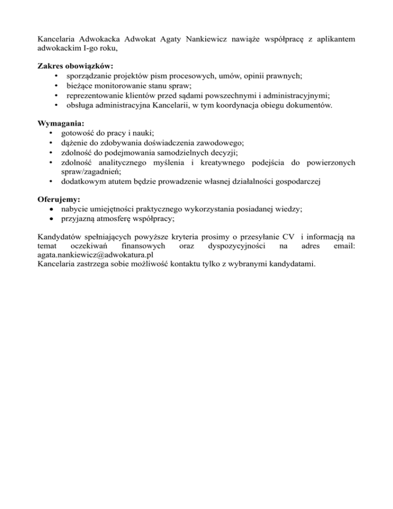 Kancelaria Adwokacka Adwokat Agaty Nankiewicz nawiąże współpracę z aplikantem adwokackim I-go roku, Zakres obowiązków: • sporządzanie projektów pism procesowych, umów, opinii prawnych; • bieżące monitorowanie stanu spraw; • reprezentowanie klientów przed sądami powszechnymi i administracyjnymi; • obsługa administracyjna Kancelarii, w tym koordynacja obiegu dokumentów. Wymagania: • gotowość do pracy i nauki; • dążenie do zdobywania doświadczenia zawodowego; • zdolność do podejmowania samodzielnych decyzji; • zdolność analitycznego myślenia i kreatywnego podejścia do powierzonych spraw/zagadnień; • dodatkowym atutem będzie prowadzenie własnej działalności gospodarczej Oferujemy: nabycie umiejętności praktycznego wykorzystania posiadanej wiedzy; przyjazną atmosferę współpracy; Kandydatów spełniających powyższe kryteria prosimy o przesyłanie CV i informacją na temat oczekiwań finansowych oraz dyspozycyjności na adres email: [email protected] Kancelaria zastrzega sobie możliwość kontaktu tylko z wybranymi kandydatami.