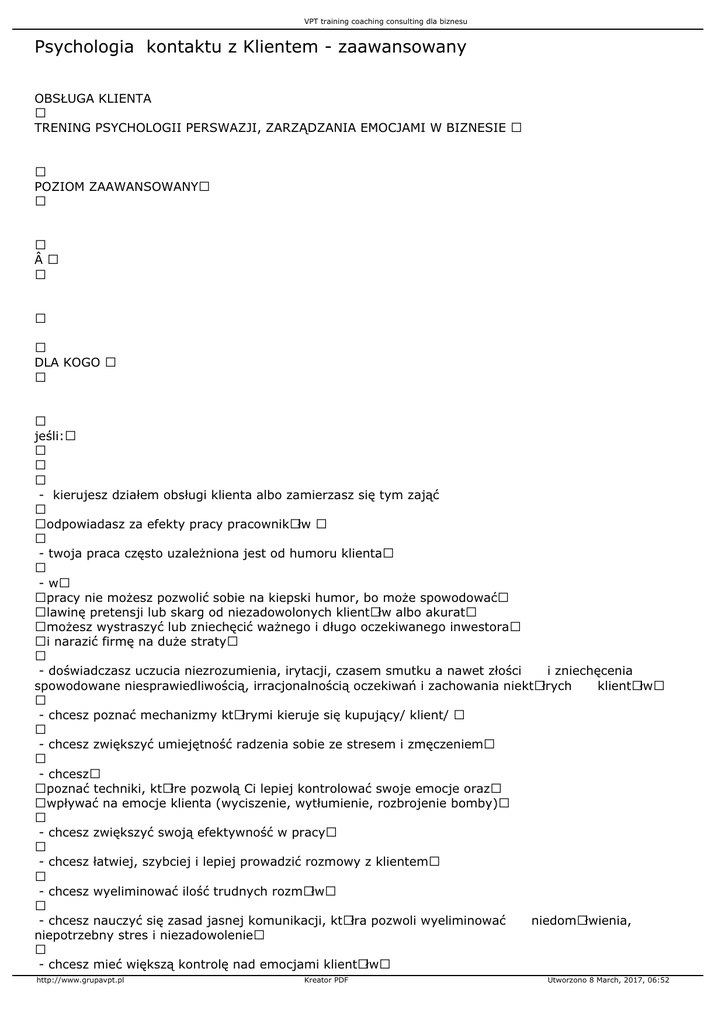 VPT training coaching consulting dla biznesu Psychologia kontaktu z Klientem - zaawansowany OBSŁUGA KLIENTA TRENING PSYCHOLOGII PERSWAZJI, ZARZĄDZANIA EMOCJAMI W BIZNESIE POZIOM ZAAWANSOWANY  DLA KOGO jeśli: - kierujesz działem obsługi klienta albo zamierzasz się tym zająć odpowiadasz za efekty pracy pracownikÃłw - twoja praca często uzależniona jest od humoru klienta - w pracy nie możesz pozwolić sobie na kiepski humor, bo może spowodować lawinę pretensji lub skarg od niezadowolonych klientÃłw albo akurat możesz wystraszyć lub zniechęcić ważnego i długo oczekiwanego inwestora i narazić firmę na duże straty - doświadczasz uczucia niezrozumienia, irytacji, czasem smutku a nawet złości i zniechęcenia spowodowane niesprawiedliwością, irracjonalnością oczekiwań i zachowania niektÃłrych klientÃłw - chcesz poznać mechanizmy ktÃłrymi kieruje się kupujący/ klient/ - chcesz zwiększyć umiejętność radzenia sobie ze stresem i zmęczeniem - chcesz poznać techniki, ktÃłre pozwolą Ci lepiej kontrolować swoje emocje oraz wpływać na emocje klienta (wyciszenie, wytłumienie, rozbrojenie bomby) - chcesz zwiększyć swoją efektywność w pracy - chcesz łatwiej, szybciej i lepiej prowadzić rozmowy z klientem - chcesz wyeliminować ilość trudnych rozmÃłw - chcesz nauczyć się zasad jasnej komunikacji, ktÃłra pozwoli wyeliminować niedomÃłwienia, niepotrzebny stres i niezadowolenie - chcesz mieć większą kontrolę nad emocjami klientÃłw http://www.grupavpt.pl Kreator PDF Utworzono 8 March, 2017, 06:52 VPT training coaching consulting dla biznesu - chcesz poznać zasady wywierania wpływu na ludzi - chcesz mieć większą kontrolę w sytuacjach stresujących w pracy - chcesz wykorzystać te nowe umiejętności na innych płaszczyznach w swoim życiu czyli: - szefowie działÃłw obsługi klienta - kierownicy działÃłw BOK i Call Center - zarządzający zespołami Customer Service - handlowcy - sprzedawcy - stewardessy - pracownicy obsługi klienta - sekretarki - osoby chcące przygotować się do zdobycia pracy w sprzedaży, obsłudze klienta, najlepszych firmach - wszyscy ktÃłrzy chcą rozwijać i efektywniej wykorzystywać swoje umiejętności kontaktach z klientem recepcji w interpersonalne w CEL SZKOLENIA Korzyści indywidualne - rozwinięcie zdolności umiejętnego i adekwatnego do sytuacji reagowania na klientÃłw - zwiększysz efektywność swojej pracy - poznasz techniki dotarcia do najtrudniejszego rozmÃłwcy (rozbrojenia bomby - będziesz potrafił/a sprawić by witano i żegnano Cię z uśmiechem http://www.grupavpt.pl Kreator PDF trudne zachowania emocjonalnej) Utworzono 8 March, 2017, 06:52 VPT training coaching consulting dla biznesu - nauczysz się budować dobre relacje z klientem - nauczysz się sposobÃłw budowania dobrych relacji, szacunku i autorytetu - będziesz potrafił/a tak poprowadzić rozmowę aby wyeliminować niedomÃłwienia reklamacji - nauczysz się skuteczniej przeprowadzać rozmowy telefoniczne - asertywności - poznasz zasady wywierania wpływu i będziesz mÃłgł je stosować - jak nie dać się szantażować - dokonasz pierwszych zmian korzyści dla firmy - zadowolenie klientÃłw - budowanie długotrwałych kontaktÃłw z klientem - budowanie pozytywnego wizerunku firmy - zmniejszenie rotacji pracownikÃłw - profesjonalna kadra - sprawna obsługa, zwiększenie terminowości oraz zmniejszenie liczby reklamacji, skarg, zażaleń, pomyłek - większe zadowolenie i satysfakcji pracownikÃłw - zmniejszenie frustracji i sytuacji stresujących (lawina jednego źle użytego - większa odpowiedzialność za pracę - docelowo wzrost sprzedaży, efektywność i jakości świadczonych usług a w firmy i przyczyny słowa, obietnicy) konsekwencji zysk PROGRAM SZKOLENIA: I. Inteligencja emocjonalne – możliwości osiągania doskonałości w relacjach interpersonalnych II. Umiejętności osobiste http://www.grupavpt.pl Kreator PDF Utworzono 8 March, 2017, 06:52 VPT training coaching consulting dla biznesu - Autoprezentacja - Wzbudzanie zaufania - Pacing/ leading – niewidoczne budowanie kontaktu zaufania, sympatii - Zrywanie kontaktu – sytuacje zaplanowane - Asertywność w kontaktach z klientem - Stres : bodziec i eliminacja stresu - Dźwignia motywacji III. Umiejętności wywierania wpływu na ludzi - Body language – perswazja niewerbalna - Prawa perswazji - Język perswazji – presupozycje, implikacje, reakcje biegunowe - Metaprogramy – kody dostępu wg temperamentu i osobowości - Schematy myślowe ludzkiego umysłu – wywieranie wpływu wg. Cialdiniego - Komunikacja : zadawanie pytań sugerujących odpowiedź - Negacja retrospektywna - Słowa klucze - Trudny klient, czy mało elastyczny sprzedawca – psychologia zachowań i zmiana reakcji - SamobÃłjczy gol – wieloznaczności językowe zwroty, typowe sytuacje sprawiające kłopoty METODY SZKOLENIA Szkolenie prowadzone jest interaktywną metodą nauczania i doskonalenia umiejętności z wykorzystaniem psychologii osobowości, wywierania wpływu i technik neurolingwistycznego programowania, stosowane w biznesie i dyplomacji. Forma szkolenia ma charakter warsztatowy (ćwiczenia, scenki analiza i modelowanie zachowań, komentarze trenerskie, dyskusje, studia przypadkÃłw). Warsztat wzbogacony jest o element coachingu przez http://www.grupavpt.pl Kreator PDF Utworzono 8 March, 2017, 06:52 VPT training coaching consulting dla biznesu eksperta, co zwiększy możliwość uzyskania indywidualnego celu uczestnika.  Czas trwania 2 dni  Inwestycja 1270 zł http://www.grupavpt.pl Kreator PDF Utworzono 8 March, 2017, 06:52