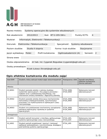 Nazwa modułu: Systemy operacyjne dla systemów wbudowanych Rok akademicki: Wydział: Kierunek: 2012/2013 Kod: IET-2-205-SW-s Punkty ECTS: 4 Informatyki, Elektroniki i Telekomunikacji Elektronika i Telekomunikacja Poziom studiów: Studia II stopnia Język wykładowy: Polski Specjalność: Systemy wbudowane Forma i tryb studiów: Profil kształcenia: Stacjonarne Ogólnoakademicki (A) Semestr: 2 Strona www: Osoba odpowiedzialna: dr hab. inż. Cyganek Bogusław ([email protected]) Osoby prowadzące: Krzak Łukasz ([email protected]) Opis efektów kształcenia dla modułu zajęć Kod EKM Student, który zaliczył moduł zajęć wie/umie/potrafi Powiązania z EKK Sposób weryfikacji efektów kształcenia (forma zaliczeń) M_W001 Student posiada wiedze z zakresu budowy systemów operacyjnych. Zna pojęcia procesów i wątków wraz z podstawową klasyfikacją, zna mechanizm zmiany kontekstu i algorytmy planisty. ET2A_W08, ET2A_W09 Wykonanie ćwiczeń laboratoryjnych M_W002 Student posiada wiedzę dotyczącą mechanizmów komunikacji międzyprocesowej, synchronizacji procesów i ich wykorzystania w aplikacjach czasu rzeczywistego. ET2A_W08, ET2A_W09 Wykonanie ćwiczeń laboratoryjnych M_W003 Student zna podstawowe mechanizmy zarządzania pamięcią operacyjną i dyskową w systemie operacyjnym ET2A_W08, ET2A_W09 Wykonanie ćwiczeń laboratoryjnych M_U001 Student potrafi korzystać z interfejsu aplikacyjnego systemu operacyjnego czasu rzeczywistego. ET2A_U05, ET1A_U24 Wykonanie ćwiczeń laboratoryjnych M_U002 Student potrafi projektować, tworzyć i testować aplikacje wielowątkowe z synchronizacją, działające pod kontrolą systemu operacyjnego ET2A_U05 Wykonanie ćwiczeń laboratoryjnych Wiedza Umiejętności 1/5 Karta modułu - Systemy operacyjne dla systemów wbudowanych M_U003 Student potrafi skonfigurować i uruchomić system operacyjny czasu rzeczywistego dedykowany dla systemów wbudowanych ET2A_U10 Wykonanie ćwiczeń laboratoryjnych Kompetencje społeczne M_K001 Student rozumie potrzebę i zna możliwości ciągłego dokształcania się oraz podnoszenia swoich kompetencji zawodowych ET2A_K01 M_K002 Student ma świadomość ważności i rozumie pozatechniczne aspekty i skutki działalności inżyniera – elektryka, w tym odpowiedzialności za podejmowane decyzje ET2A_K02 Matryca efektów kształcenia w odniesieniu do form zajęć Konwersatori um Zajęcia seminaryjne Zajęcia praktyczne Zajęcia terenowe Zajęcia warsztatowe Student posiada wiedze z zakresu budowy systemów operacyjnych. Zna pojęcia procesów i wątków wraz z podstawową klasyfikacją, zna mechanizm zmiany kontekstu i algorytmy planisty. + - - - - - - - - - - M_W002 Student posiada wiedzę dotyczącą mechanizmów komunikacji międzyprocesowej, synchronizacji procesów i ich wykorzystania w aplikacjach czasu rzeczywistego. + - + - - - - - - - - M_W003 Student zna podstawowe mechanizmy zarządzania pamięcią operacyjną i dyskową w systemie operacyjnym + - + - - - - - - - - M_U001 Student potrafi korzystać z interfejsu aplikacyjnego systemu operacyjnego czasu rzeczywistego. + - + - - - - - - - - M_U002 Student potrafi projektować, tworzyć i testować aplikacje wielowątkowe z synchronizacją, działające pod kontrolą systemu operacyjnego + - + - - - - - - - - E-learning Ćwiczenia projektowe M_W001 Inne Ćwiczenia laboratoryjne Forma zajęć Ćwiczenia audytoryjne Student, który zaliczył moduł zajęć wie/umie/potrafi Wykład Kod EKM Wiedza Umiejętności 2/5 Karta modułu - Systemy operacyjne dla systemów wbudowanych M_U003 Student potrafi skonfigurować i uruchomić system operacyjny czasu rzeczywistego dedykowany dla systemów wbudowanych + - + - - - - - - - - Kompetencje społeczne M_K001 Student rozumie potrzebę i zna możliwości ciągłego dokształcania się oraz podnoszenia swoich kompetencji zawodowych + - + - - - - - - - - M_K002 Student ma świadomość ważności i rozumie pozatechniczne aspekty i skutki działalności inżyniera – elektryka, w tym odpowiedzialności za podejmowane decyzje + - + - - - - - - - - Treść modułu zajęć (program wykładów i pozostałych zajęć) Wykład Podstawy oraz narzędzia projektowania i programowania systemów operacyjnych czasu rzeczywistego (RTOS) – 4 godziny Wstępny podział systemów operacyjnych: systemy wbudowane, ogólnego zastosowania, przykłady znanych systemów (Windows, CE, Linux, RT, Android, FreeRTOS, MicroC/OS, itd.). Przegląd technik programistycznych specyficznych dla RTOS: Architektura systemów mikroprocesorowych, podstawy programowania mikroprocesorów w językach asemblerowych oraz C, podstawowe narzędzia (kompilator, linker, debugger); Podstawowe struktury danych używane w RTOS; Programowanie obiektowe w C++; Wstęp do przetwarzania równoległego; Techniki debuggowania systemów, programowanie z weryfikacją (programming by contract); Specyfika narzędzi do projektowania oraz testowania RTOS: Model wodospadowy oraz spiralny; Zasady używania Unified Modeling Language (UML) do RTOS – diagramy przypadków użycia, stanów, aktywności, sekwencji, komponentów, rozlokowania oraz klas; Projektowanie testów. Podstawowe mechanizmy i pojęcia systemów operacyjnych – 4 godziny Przedstawienie zagadnień, mechanizmów na przykładzie Win, Linux, MicroC/OS: Systemy pierwszo/drugo-planowe, sekcja krytyczna, dzielone zasoby komputera, wielo-zadaniowość, zadanie, proces, wątek, włókno; Mechanizm przełączania zadań; Jądro systemu; Struktura jądra; Scheduler; Jądra bez i z wywłaszczaniem; Specyfika systemów czasu rzeczywistego: systemy miękkie i twarde, zadania synchroniczne i asynchroniczne, parametry systemu, systemy wielo-mikroprocesorowe i wielordzeniowe; Struktura jądra, zarządzanie oraz tworzenie procesów – 7 godzin Koncepcja procesu (wątku, zadania, włókna) na przykładzie Win, Linux, MicroC/OS: stany procesu, proces control block (PCB); Mechanizm przełączania kontekstu; Priorytet zadań, priorytety s