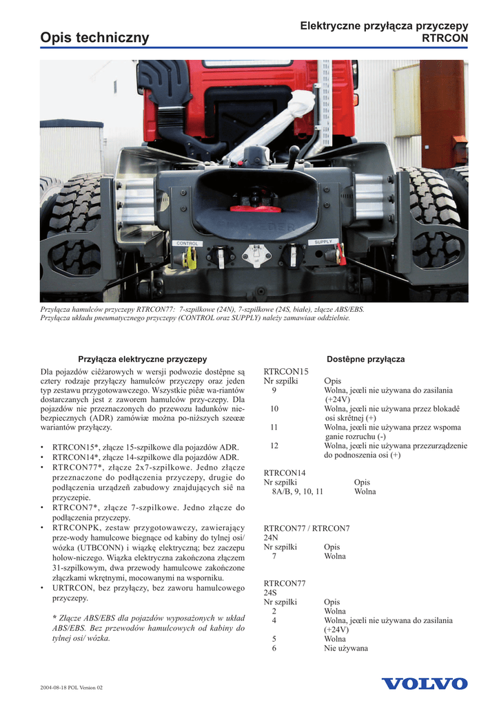 Elektryczne przyłącza przyczepy RTRCON Opis techniczny Przyłącza hamulców przyczepy RTRCON77: 7-szpilkowe (24N), 7-szpilkowe (24S, białe), złącze ABS/EBS. Przyłącza układu pneumatycznego przyczepy (CONTROL oraz SUPPLY) należy zamawiaæ oddzielnie. Przyłącza elektryczne przyczepy Dla pojazdów ciêżarowych w wersji podwozie dostêpne są cztery rodzaje przyłączy hamulców przyczepy oraz jeden typ zestawu przygotowawczego. Wszystkie piêæ wa-riantów dostarczanych jest z zaworem hamulców przy-czepy. Dla pojazdów nie przeznaczonych do przewozu ładunków niebezpiecznych (ADR) zamówiæ można po-niższych szeœæ wariantów przyłączy. • • • • • • RTRCON15*, złącze 15-szpilkowe dla pojazdów ADR. RTRCON14*, złącze 14-szpilkowe dla pojazdów ADR. RTRCON77*, złącze 2x7-szpilkowe. Jedno złącze przeznaczone do podłączenia przyczepy, drugie do podłączenia urządzeñ zabudowy znajdujących siê na przyczepie. RTRCON7*, złącze 7-szpilkowe. Jedno złącze do podłączenia przyczepy. RTRCONPK, zestaw przygotowawczy, zawierający prze-wody hamulcowe biegnące od kabiny do tylnej osi/ wózka (UTBCONN) i wiązkę elektryczną; bez zaczepu holow-niczego. Wiązka elektryczna zakończona złączem 31-szpilkowym, dwa przewody hamulcowe zakończone złączkami wkrętnymi, mocowanymi na wsporniku. URTRCON, bez przyłączy, bez zaworu hamulcowego przyczepy. * Złącze ABS/EBS dla pojazdów wyposażonych w układ ABS/EBS. Bez przewodów hamulcowych od kabiny do tylnej osi/ wózka. 2004-08-18 POL Version 02 Dostêpne przyłącza RTRCON15 Nr szpilki 9 10 11 12 Opis Wolna, jeœli nie używana do zasilania (+24V) Wolna, jeœli nie używana przez blokadê osi skrêtnej (+) Wolna, jeœli nie używana przez wspoma ganie rozruchu (-) Wolna, jeœli nie używana przezurządzenie do podnoszenia osi (+) RTRCON14 Nr szpilki 8A/B, 9, 10, 11 Opis Wolna RTRCON77 / RTRCON7 24N Nr szpilki Opis 7 Wolna RTRCON77 24S Nr szpilki 2 4 5 6 Opis Wolna Wolna, jeœli nie używana do zasilania (+24V) Wolna Nie używana