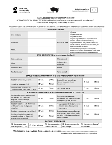 KARTA ZGŁOSZENIOWA UCZESTNIKA PROJEKTU „KWALIFIKACJE NA MIARĘ POTRZEB - aktywizacja edukacyjno-zawodowa osób bezrobotnych z powiatów: M. Białystok, białostocki, sokólski” PROSIMY O CZYTELNE WYPEŁNIENIE RUBRYK WIELKIMI LITERAMI I ZAZNACZENIE KRZYŻYKIEM ODPOWIEDNIEGO KWADRATU DANE PODSTAWOWE brak podstawowe gimnazjalne ponadgimnazjalne (wykształcenie Imię (imiona) Nazwisko Wykształcenie PESEL średnie lub zasadnicze zawodowe) pomaturalne (na poziomie powyżej szkoły średniej, które jednocześnie nie jest wykształceniem wyższym) wyższe (uzyskany tytuł licencjata, magistra, inżyniera, doktora lub ukończone studia podyplomowe albo doktoranckie) DANE KONTAKTOWE (w tym adres zamieszkania) Kod pocztowy Miejscowość Ulica Nr budynku / Nr lokalu Województwo Powiat Tel. kontaktowy Adres e-mail STATUS OSOBY NA RYNKU PRACY W CHWILI PRZYSTĄPIENIA DO PROJEKTU Osoba bezrobotna, w tym: TAK NIE Osoba bierna zawodowo NIE zarejestrowana w PUP NIE (tzn. nie pracuje i nie jest bezrobotna) TAK TAK TAK NIE Osoba pracująca TAK NIE długotrwale bezrobotna (nieprzerwanie przez okres 12 m-y) STATUS UCZESTNIKA PROJEKTU W CHWILI PRZYSTĄPIENIA DO PROJEKTU Osoba należąca do mniejszości narodowej lub etnicznej, migrant, osoba obcego pochodzenia Osoba bezdomna lub dotknięta wykluczeniem z dostępu do mieszkań TAK NIE Osoba przebywająca w gospodarstwie domowym bez osób pracujących, w tym: TAK NIE TAK NIE w gospodarstwie domowym z dziećmi pozostającymi na utrzymaniu TAK NIE Osoba z niepełnosprawnościami TAK NIE Osoba w innej niekorzystnej sytuacji społecznej (innej niż wymienione powyżej) TAK NIE Osoba żyjąca w gospodarstwie składającym się z jednej osoby dorosłej i dzieci pozostających na utrzymaniu TAK NIE POTRZEBY SZKOLENIOWE Kurs spawania metodą MAG (135) Kurs tokarza Kurs operatora Kurs pracownika Kurs sprzedawcy/ obrabiarki CNC biurowego handlowca Oświadczam, że powyższe dane są zgodne z prawdą: ………………………………………................................ Data i czytelny podpis uczestnika/czki projektu OŚWIADCZENIE UCZESTNIKA PROJEKTU W związku z przystąpieniem do projektu pn. „KWALIFIKACJE NA MIARĘ POTRZEB - aktywizacja edukacyjnozawodowa osób bezrobotnych z powiatów: M. Białystok, białostocki, sokólski” oświadczam, że przyjmuję do wiadomości, iż: 1) administratorem moich danych osobowych jest Ministerstwo Rozwoju, z siedzibą w Warszawie, ul. Plac Trzech Krzyży 3/5; 2) podstawę prawną przetwarzania moich danych osobowych stanowi art. 23 ust. 1 pkt 2 lub art. 27 ust. 2 pkt 2 ustawy z dnia 29 sierpnia 1997 r. o ochronie danych osobowych (tekst jednolity: Dz.U. z 2002 r. Nr 101 poz. 926, ze zm.) – dane osobowe są niezbędne dla realizacji Regionalnego Programu Operacyjnego Województwa Podlaskiego na lata 2014-2020, 3) moje dane osobowe będą przetwarzane wyłącznie w celu udzielenia wsparcia, realizacji projektu „KWALIFIKACJE NA MIARĘ POTRZEB - aktywizacja edukacyjno-zawodowa osób bezrobotnych z powiatów: M. Białystok, białostocki, sokólski” ewaluacji, kontroli, monitoringu i sprawozdawczości w ramach Regionalnego Programu Operacyjnego Województwa Podlaskiego na lata 2014-2020, 4) moje dane osobowe zostały powierzone do przetwarzania Instytucji Zarządzającej/Instytucji Pośredniczącej – Wojewódzkiemu Urzędowi Pracy w Białymstoku ul. Pogodna 22 15-354 Białystok, beneficjentowi realizującemu projekt – CONSTANS GROUP Sp. z o.o. ul. Warszawska 58 17-200 Hajnówka oraz podmiotom, które na zlecenie beneficjenta uczestniczą w realizacji projektu. Moje dane osobowe mogą zostać udostępnione firmom badawczym realizującym na zlecenie Instytucji Zarządzającej RPOWP, Instytucji Pośredniczącej lub beneficjenta badania ewaluacyjne w ramach RPOWP na lata 2014-2020 oraz specjalistycznym firmom realizującym na zlecenie Instytucji Zarządzającej RPOWP lub Instytucji Pośredniczącej kontrole w ramach RPOWP na lata 2014-2020; 5) podanie danych jest dobrowolne, aczkolwiek odmowa ich podania jest równoznaczna z brakiem możliwości udzielenia wsparcia w ramach Projektu; 6) mam prawo dostępu do treści swoich danych i ich poprawiania. …..……………………………………… MIEJSCOWOŚĆ I DATA ………………………………..…………………………………………… CZYTELNY PODPIS UCZESTNIKA PROJEKTU