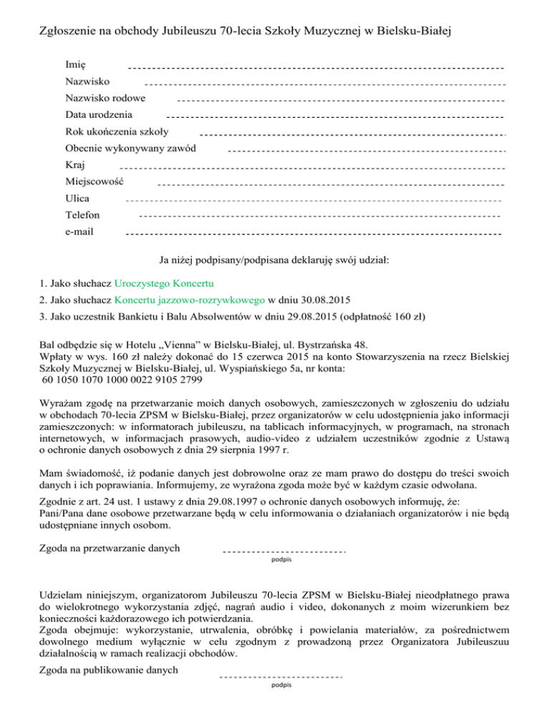 Zgłoszenie na obchody Jubileuszu 70-lecia Szkoły Muzycznej w Bielsku-Białej Imię Nazwisko Nazwisko rodowe Data urodzenia Rok ukończenia szkoły Obecnie wykonywany zawód Kraj Miejscowość Ulica Telefon e-mail Ja niżej podpisany/podpisana deklaruję swój udział: 1. Jako słuchacz Uroczystego Koncertu 2. Jako słuchacz Koncertu jazzowo-rozrywkowego w dniu 30.08.2015 3. Jako uczestnik Bankietu i Balu Absolwentów w dniu 29.08.2015 (odpłatność 160 zł) Bal odbędzie się w Hotelu „Vienna” w Bielsku-Białej, ul. Bystrzańska 48. Wpłaty w wys. 160 zł należy dokonać do 15 czerwca 2015 na konto Stowarzyszenia na rzecz Bielskiej Szkoły Muzycznej w Bielsku-Białej, ul. Wyspiańskiego 5a, nr konta: 60 1050 1070 1000 0022 9105 2799 Wyrażam zgodę na przetwarzanie moich danych osobowych, zamieszczonych w zgłoszeniu do udziału w obchodach 70-lecia ZPSM w Bielsku-Białej, przez organizatorów w celu udostępnienia jako informacji zamieszczonych: w informatorach jubileuszu, na tablicach informacyjnych, w programach, na stronach internetowych, w informacjach prasowych, audio-video z udziałem uczestników zgodnie z Ustawą o ochronie danych osobowych z dnia 29 sierpnia 1997 r. Mam świadomość, iż podanie danych jest dobrowolne oraz ze mam prawo do dostępu do treści swoich danych i ich poprawiania. Informujemy, ze wyrażona zgoda może być w każdym czasie odwołana. Zgodnie z art. 24 ust. 1 ustawy z dnia 29.08.1997 o ochronie danych osobowych informuję, że: Pani/Pana dane osobowe przetwarzane będą w celu informowania o działaniach organizatorów i nie będą udostępniane innych osobom. Zgoda na przetwarzanie danych podpis Udzielam niniejszym, organizatorom Jubileuszu 70-lecia ZPSM w Bielsku-Białej nieodpłatnego prawa do wielokrotnego wykorzystania zdjęć, nagrań audio i video, dokonanych z moim wizerunkiem bez konieczności każdorazowego ich potwierdzania. Zgoda obejmuje: wykorzystanie, utrwalenia, obróbkę i powielania materiałów, za pośrednictwem dowolnego medium wyłącznie w celu zgodnym z prowadzoną przez Organizatora Jubileuszuu działalnością w ramach realizacji obchodów. Zgoda na publikowanie danych podpis
