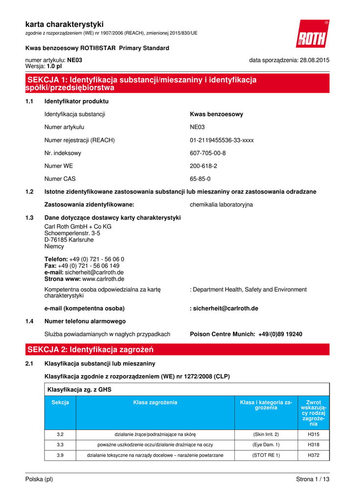 karta charakterystyki zgodnie z rozporządzeniem (WE) nr 1907/2006 (REACH), zmienionej 2015/830/UE Kwas benzoesowy ROTI®STAR Primary Standard numer artykułu: NE03 Wersja: 1.0 pl data sporządzenia: 28.08.2015 SEKCJA 1: Identyfikacja substancji/mieszaniny i identyfikacja spółki/przedsiębiorstwa 1.1 1.2 Identyfikator produktu Identyfikacja substancji Kwas benzoesowy Numer artykułu NE03 Numer rejestracji (REACH) 01-2119455536-33-xxxx Nr. indeksowy 607-705-00-8 Numer WE 200-618-2 Numer CAS 65-85-0 Istotne zidentyfikowane zastosowania substancji lub mieszaniny oraz zastosowania odradzane Zastosowania zidentyfikowane: 1.3 chemikalia laboratoryjna Dane dotyczące dostawcy karty charakterystyki Carl Roth GmbH + Co KG Schoemperlenstr. 3-5 D-76185 Karlsruhe Niemcy Telefon: +49 (0) 721 - 56 06 0 Fax: +49 (0) 721 - 56 06 149 e-mail: [email protected] Strona www: www.carlroth.de 1.4 Kompetentna osoba odpowiedzialna za kartę charakterystyki : Department Health, Safety and Environment e-mail (kompetentna osoba) : [email protected] Numer telefonu alarmowego Służba powiadamianych w nagłych przypadkach Poison Centre Munich: +49/(0)89 19240 SEKCJA 2: Identyfikacja zagrożeń 2.1 Klasyfikacja substancji lub mieszaniny Klasyfikacja zgodnie z rozporządzeniem (WE) nr 1272/2008 (CLP) Klasyfikacja zg. z GHS Sekcja Klasa zagrożenia Klasa i kategoria zagrożenia Zwrot wskazujący rodzaj zagrożenia 3.2 działanie żrące/podrażniające na skórę (Skin Irrit. 2) H315 3.3 poważne uszkodzenie oczu/działanie drażniące na oczy (Eye Dam. 1) H318 3.9 działanie toksyczne na narządy docelowe – narażenie powtarzane (STOT RE 1) H372 Polska (pl) Strona 1 / 13 karta charakterystyki zgodnie z rozporządzeniem (WE) nr 1907/2006 (REACH), zmienionej 2015/830/UE Kwas benzoesowy ROTI®STAR Primary Standard numer artykułu: NE03 2.2 Elementy oznakowania Oznakowania zgodnie z rozporządzeniem (WE) nr 1272/2008 (CLP) Hasło ostrzegawcze Niebezpieczeństwo Piktogramy Zwroty wskazujące rodzaj zagrożenia H315 H318 H372 Działa drażniąco na skórę. Powoduje poważne uszkodzenie oczu. Powoduje uszkodzenie narządów (płuco) poprzez długotrwałe lub powtarzane narażenie (w przypadku dostania się do dróg oddechowych). Zwroty wskazujące środki ostrożności Zwroty wskazujące środki ostrożności - zapobieganie P260 P280 Nie wdychać pyłu. Stosować rękawice ochronne/ochronę oczu. Zwroty wskazujące środki ostrożności - reagowanie P302+P352 P305+P351+P338 P310 W PRZYPADKU KONTAKTU ZE SKÓRĄ: Umyć dużą ilością wody. W PRZYPADKU DOSTANIA SIĘ DO OCZU: ostrożnie płukać wodą przez kilka minut. Wyjąć soczewki kontaktowe, jeżeli są i można je łatwo usunąć. Kontynuować płukanie. Natychmiast skontaktować się z OŚRODKIEM ZATRUĆ/lekarzem. Oznakowanie opakowań, których zawartość nie przekracza 125 ml Hasło ostrzegawcze: Niebezpieczeństwo Symbol(-e) H318 H372 Powoduje poważne uszkodzenie oczu. Powoduje uszkodzenie narządów (płuco) poprzez długotrwałe lub powtarzane narażenie (w przypadku dostania się do dróg oddechowych). P260 Nie wdychać pyłu/dymu/gazu/mgły/par/rozpylonej cieczy. P280 Stosować rękawice ochronne/odzież ochronną/ochronę oczu/ochronę twarzy. P305+P351+P338 W PRZYPADKU DOSTANIA SIĘ DO OCZU: ostrożnie płukać wodą przez kilka minut. Wyjąć soczewki kontaktowe, jeżeli są i można je łatwo usunąć. Kontynuować płukanie. P310 Natychmiast skontaktować się z OŚRODKIEM ZATRUĆ/lekarzem. 2.3 Inne zagrożenia Nie ma dodatkowych informacji. Polska (pl) Strona 2 / 13 karta charakterystyki zgodnie z rozporządzeniem (WE) nr 1907/2006 (REACH), zmienionej 2015/830/UE Kwas benzoesowy ROTI®STAR Primary Standard numer artykułu: NE03 SEKCJA 3: Skład/informacja o składnikach 3.1 Substancje Nazwa substancji Kwas benzoesowy Nr. indeksowy 607-705-00-8 Numer rejestracji (REACH) 01-2119455536-33-xxxx Numer WE 200-618-2 Numer CAS 65-85-0 Wzór cząsteczkowy C₇H₆O₂ Masa cząsteczkowa 122,1 g/mol SEKCJA 4: Środki pierwszej pomocy 4.1 Opis środków pierwszej pomocy Uwagi ogólne Zdjąć zanieczyszczoną odzież. Po narażeniu przez drogi oddechowe Z Pył: Należy zadbać o należytą wentylację. W przypadku działania drażniącego na drogi oddechowe, należy skonsultować się z lekarzem. Po kontakcie ze skórą Spłukać skórę pod strumieniem wody/prysznicem. Należy udać się do dermatologa. Po kontakcie z oczami W przypadku przedostania się do oczu natychmiast przemywać przez 10 do 15 minut przy otwartej powiece bieżącą wodą i zasięgnąć porady lekarza. Po narażeniu przez przewód pokarmowy Wypłukać usta. W przypadku złego samopoczucia skontaktować się z lekarzem. 4.2 Najważniejsze ostre i opóźnione objawy oraz skutki narażenia Działanie drażniące, Kaszel, Ból głowy, Dolegliwości żołądkowo-jelitowe, Nudności, Wymioty, Biegunka, Duszność, Ryzyko poważnego uszkodzenia oczu 4.3 Wskazania dotyczące wszelkiej natychmiastowej pomocy lekarskiej i szczególnego postępowania z poszkodowanym żadne Polska (pl) Strona 3 / 13 karta charakterystyki zgodnie z rozporządzeniem (WE) nr 1907/2006 (REACH), zmienionej 2015/830/UE Kwas benzoesowy ROTI®STAR Primary Standard numer artykułu: NE03 SEKCJA 5: Postępowanie w przypadku pożaru 5.1 Środki gaśnicze Odpowiednie środki gaśnicze Środki gaśnicze należy dostosować do otoczenia rozpylona woda, piana, suchy proszek gaśniczy, dwutlenek węgla (CO2) Niewłaściwe środki gaśnicze silny strumień wody 5.2 Szczególne zagrożenia związane z substancją lub mieszaniną Palny. Niebezpieczeństwo wybuchu pyłu. Oary mogą tworzyć z powietrzem mieszaninę wybuchową. Produkty spalania stwarzające zagrożenie Podczas pożaru mogą powstawać: tlenek węgla (CO), dwutlenek węgla (CO2) 5.3 Informacje dla straży pożarnej Gasić pożar z rozsądnej odległości z zachowaniem zwykłych środków ostrożności. Nosić autonomiczny aparat oddechowy. SEKCJA 6: Postępowanie w przypa