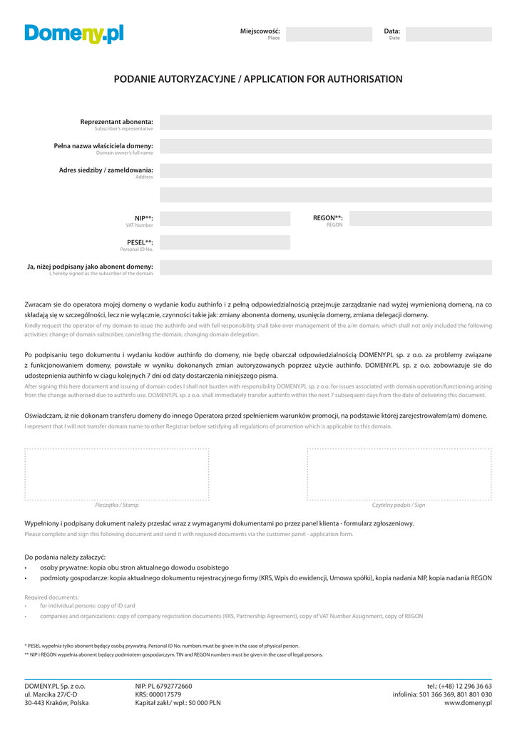 Miejscowość: Data: Place Date PODANIE AUTORYZACYJNE / APPLICATION FOR AUTHORISATION Reprezentant abonenta: Subscriber’s representative Pełna nazwa właściciela domeny: Domain owner’s full name Adres siedziby / zameldowania: Address NIP**: VAT Number REGON**: REGON PESEL**: Personal ID No. Ja, niżej podpisany jako abonent domeny: I, hereby signed as the subscriber of the domain Zwracam sie do operatora mojej domeny o wydanie kodu authinfo i z pełną odpowiedzialnością przejmuje zarządzanie nad wyżej wymienioną domeną, na co składają się w szczególności, lecz nie wyłącznie, czynności takie jak: zmiany abonenta domeny, usunięcia domeny, zmiana delegacji domeny. Kindly request the operator of my domain to issue the authinfo and with full responsibility shall take over management of the a/m domain, which shall not only included the following activities: change of domain subscriber, cancelling the domain, changing domain delegation. Po podpisaniu tego dokumentu i wydaniu kodów authinfo do domeny, nie będę obarczał odpowiedzialnością DOMENY.PL sp. z o.o. za problemy związane z funkcjonowaniem domeny, powstałe w wyniku dokonanych zmian autoryzowanych poprzez użycie authinfo. DOMENY.PL sp. z o.o. zobowiazuje sie do udostepnienia authinfo w ciagu kolejnych 7 dni od daty dostarczenia niniejszego pisma. After signing this here document and issuing of domain codes I shall not burden with responsibility DOMENY.PL sp. z o.o. for issues associated with domain operation/functioning arising from the change authorised due to authinfo use. DOMENY.PL sp. z o.o. shall immediately transfer authinfo within the next 7 subsequent days from the date of delivering this document. Oświadczam, iż nie dokonam transferu domeny do innego Operatora przed spełnieniem warunków promocji, na podstawie której zarejestrowałem(am) domene. I represent that I will not transfer domain name to other Registrar before satisfying all regulations of promotion which is applicable to this domain. Pieczątka / Stamp Czytelny podpis / Sign Wypełniony i podpisany dokument należy przesłać wraz z wymaganymi dokumentami po przez panel klienta - formularz zgłoszeniowy. Please complete and sign this following document and send it with reqiured documents via the customer panel - application form. Do podania należy załaczyć: t osoby prywatne: kopia obu stron aktualnego dowodu osobistego t podmioty gospodarcze: kopia aktualnego dokumentu rejestracyjnego firmy (KRS, Wpis do ewidencji, Umowa spółki), kopia nadania NIP, kopia nadania REGON Required documents: t for individual persons: copy of ID card t companies and organizations: copy of company registration documents (KRS, Partnership Agreement), copy of VAT Number Assignment, copy of REGON * PESEL wypełnia tylko abonent będący osobą prywatną. Personal ID No. numbers must be given in the case of physical person. ** NIP i REGON wypełnia abonent będący podmiotem gospodarczym. TIN and REGON numbers must be given in the case of legal persons. DOMENY.PL Sp. z o.o. ul. Marcika 27/C-D 30-443 Kraków, Polska NIP: PL 6792772660 KRS: 000017579 Kapitał zakł./ wpł.: 50 000 PLN tel.: (+48) 12 296 36 63 infolinia: 501 366 369, 801 801 030 www.domeny.pl