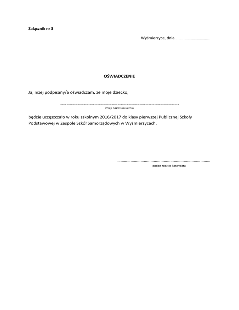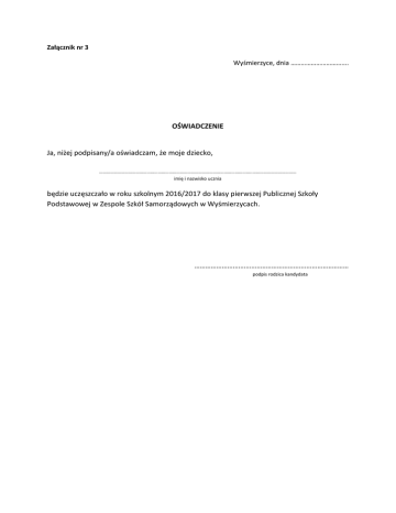 Załącznik nr 3 Wyśmierzyce, dnia ………………………….... OŚWIADCZENIE Ja, niżej podpisany/a oświadczam, że moje dziecko, ……………………………………………………………………………………………………………..……………………………… imię i nazwisko ucznia będzie uczęszczało w roku szkolnym 2016/2017 do klasy pierwszej Publicznej Szkoły Podstawowej w Zespole Szkół Samorządowych w Wyśmierzycach. ………………………………………………………………………… podpis rodzica kandydata
