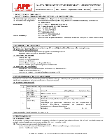 KARTA CHARAKTERYSTYKI PREPARATU NIEBEZPIECZNEGO Data wykonania: 2009-12-22 NTZ Cleaner – Zmywacz do wosku i tłuszczu Strona 1 z 7 1. IDENTYFIKACJA PREPARATU IDENTYFIKACJA PRODUCENTA, IMPORTERA LUB DYSTRYBUTORA 1.1. Dane dotyczące preparatu: 1.2. Przeznaczenie preparatu: Dystrybutor: Telefon alarmowy: NTZ Cleaner – Zmywacz do wosku i tłuszczu. Oddziela i rozkłada wszystkie oleje, tłuszcze i zabrudzenia z kaŜdej powierzchni. Nr APP: 220350. AUTO – PLAST PRODUKT Sp. z o. o. Ul. Przemysłowa 10, 62 – 300 Września Tel. +48 (061) 437 00 00 Fax. +48 (061) 437 91 37 Mail: [email protected] Strona WEB: www.app.com.pl Tel. +48 (061) 437 00 00 Aktualne dane bezpieczeństwa oraz informacje techniczne dostępne na stronie internetowej. 2. IDENTYFIKACJA ZAGROśEŃ Zgodnie z obowiązującymi przepisami (patrz p. 15) produkt jest zaklasyfikowany, jako niebezpieczny. 2.1. ZagroŜenia fizykochemiczne: produkt nie stwarza zagroŜenia w przypadku poprawnego uŜycia wydziela toksyczne gazy w warunkach poŜaru 2.2. ZagroŜenia dla zdrowia: produkt jest Ŝrący produkt powoduje oparzenia produkt jest draŜniący produkt działa draŜniąco na drogi oddechowe produkt stwarza ryzyko powaŜnego uszkodzenia oczu 2.3. ZagroŜenia dla środowiska: produkt nie jest klasyfikowany jako, niebezpieczny dla środowiska unikać zrzutów do środowiska postępować zgodnie z instrukcją lub kartą charakterystyki 3. SKŁAD I INFORMACJA O SKŁADNIKACH Klasyfikację i oznakowanie preparatu podano zgodnie z Ustawą o substancjach i preparatach chemicznych z dnia 11 stycznia 2001r oraz na podstawie danych dostarczonych przez producenta. 3.1. Składniki niebezpieczne: L.p. 1. Nr WE (EINECS) Nr CAS Nr indeksowy 229-912-9 6834-92-0 014-010-00-8 Brak 68439-45-2 2. Brak Nazwa substancji Zwrot R Klasyfikacja Zawartość [%] Metakrzemian disodu R34; R37 C; Xi 10 ÷ 25 Polietoksylowany alkohol (niejonowy środek powierzchniowoczynny). Substancja jest polimerem. Substancja nie jest umieszczona w wykazie. Klasyfikację przypisano na podstawie danych zgromadzonych drogą elektroniczną. R22; R41 Xn; Xi 5 ÷ 15 Znaczenie symboli i treść zwrotów R – patrz p. 16. 4. PIERWSZA POMOC 4.1. Wskazania ogólne: W przypadku wystąpienia jakichkolwiek niepokojących objawów wezwać natychmiast lekarza lub odwieźć poszkodowanego do szpitala, pokazać opakowanie preparatu, etykietę lub kartę charakterystyki. 4.2. Pierwsza pomoc przy naraŜeniu inhalacyjnym: osobę poszkodowaną natychmiast przenieść do dobrze wentylowanego pomieszczenia chronić przed utratą ciepła AUTO PLAST PRODUKT Sp. z o.o. 62-300 Września ul. Przemysłowa 10, tel. +48(prf)61 437 00 00. KARTA CHARAKTERYSTYKI PREPARATU NIEBEZPIECZNEGO Data wykonania: 2009-12-22 NTZ Cleaner – Zmywacz do wosku i tłuszczu Strona 2 z 7 konieczna pomoc lekarska 4.3. Pierwsza pomoc przy skaŜeniu oczu: skaŜone oczy płukać, przy otwartych powiekach, ciągłym strumieniem bieŜącej wody przez 10-15 minut; unikać silnego strumienia wody, który moŜe stworzyć ryzyko uszkodzenia rogówki nie uŜywać Ŝadnych płynów do przemywania oczu ani Ŝadnych maści przed konsultacją medyczną w przypadku, gdy osoba poszkodowana nosi szkła kontaktowe zdjąć je konieczna pomoc lekarska Uwaga: Osoby naraŜone na skaŜenie oczu powinny być pouczone o konieczności i sposobie ich natychmiastowego płukania. 4.4. Pierwsza pomoc przy skaŜeniu skóry: natychmiast zdjąć zabrudzone ubranie do mycia skóry nie uŜywać Ŝadnych rozpuszczalników ani rozcieńczalników miejsce naraŜone na kontakt lub tylko podejrzane o kontakt z produktem przemyć duŜą ilością wody z mydłem zwrócić się o pomoc lekarską 4.5. Pierwsza pomoc przy przyjęciu doustnym: wypłukać usta duŜą ilością bieŜącej wody osobie nieprzytomnej nie podawać nic do ust nie powodować wymiotów konieczna pomoc lekarska 5. POSTĘPOWANIE W PRZYPADKU POśARU 5.1. ZagroŜenia poŜarowe: produkt nie stwarza zagroŜenia w przypadku poprawnego uŜycia wydziela toksyczne gazy w warunkach poŜaru 5.2. Polecane środki gaśnicze: odpowiednie do palących się w otoczeniu materiałów 5.3. ZagroŜenia specjalne: pojemniki naraŜone na działanie ognia lub wysokiej temperatury chłodzić wodą z bezpiecznej odległości, a jeŜeli to moŜliwe usunąć je z obszaru zagroŜenia 5.4. Zalecenia ogólne: zaalarmować o poŜarze z obszaru zagroŜenia usunąć wszystkie osoby nie biorące udziału w akcji gaśniczej w razie potrzeby zarządzić ewakuację unikać wdychania dymu usunąć wszystkie źródła zapłonu stosować odzieŜ i sprzęt ochronny chronić układ oddechowy chłodzić wodą pojemniki naraŜone na kontakt z ogniem nie dopuścić do przedostania się wód gaśniczych do kanalizacji 5.5. Niebezpieczne produkty spalania: tlenki węgla toksyczne gazy i dymy 5.6. Środki ochrony osobistej: niezaleŜny aparat do oddychania i odzieŜ ochronna 6. POSTĘPOWANIE W PRZYPADKU NIEZAMIERZONEGO UWOLNIENIA DO ŚRODOWISKA 6.1. Zalecenia ogólne: w przypadku uwolnienia duŜych ilości zawiadomić o awarii odpowiednie słuŜby w przypadku uwolnienia duŜych ilości usunąć z obszaru zagroŜenia osoby nie biorące udziału w likwidowaniu awarii 6.2. Środki ochrony osobistej: podczas usuwania duŜych ilości produktu załoŜyć niezaleŜny aparat do oddychania z maską podczas usuwania nie wdychać par produktu unikać kontaktu z uwalniającym się produktem stosować rękawice ochronne i ubranie ochronne uŜywać dobrze dopasowanych i przylegających okularów ochronnych z ochroną boczną lub odpowiedniej maski ochronnej 6.3. Środki ostroŜności w zakresie ochrony środowiska: zlikwidować wyciek (zamknąć wypływ, uszczelnić, uszkodzone opakowanie umieścić w opakowaniu zastępczym) unikać zanieczyszczenia wód gruntowych, zabezpieczyć studzienki ściekowe nie dopuścić, aby produkt przedostał się do systemu wodnego lub odwadniającego jeśli produkt przedostał się do systemu wodnego, odwadniającego, skazi