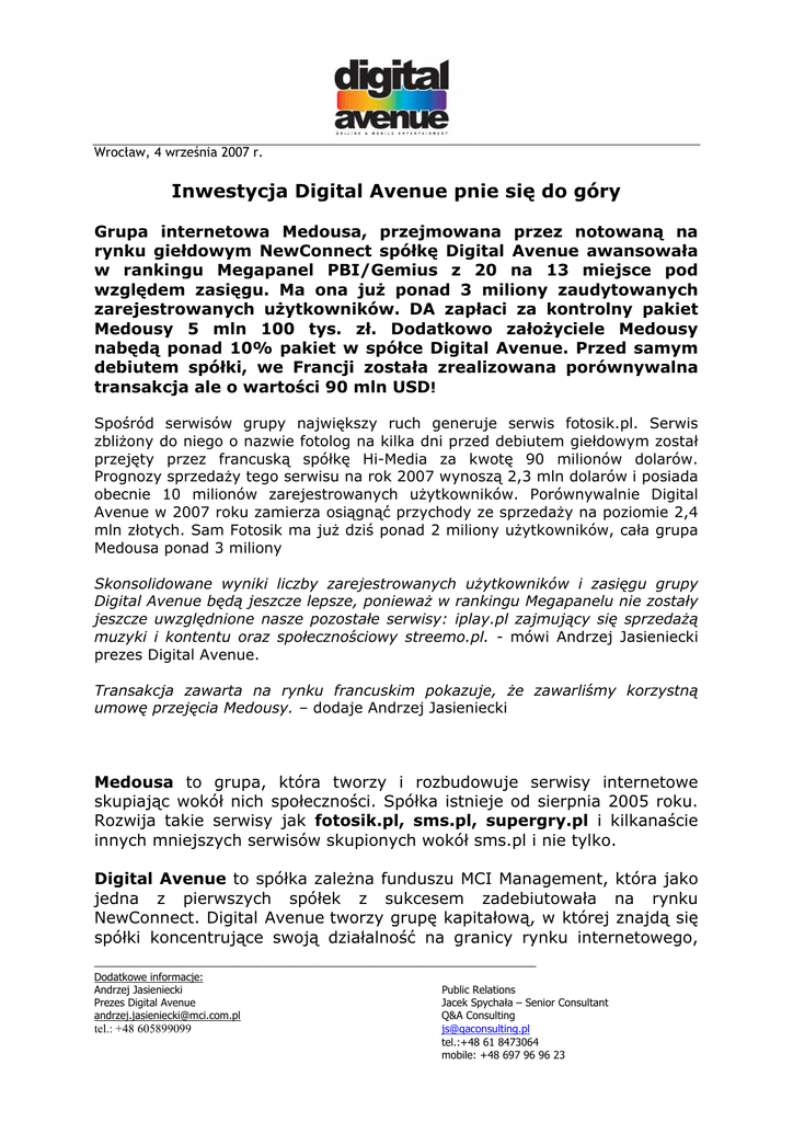 Wrocław, 4 września 2007 r. Inwestycja Digital Avenue pnie się do góry Grupa internetowa Medousa, przejmowana przez notowaną na rynku giełdowym NewConnect spółkę Digital Avenue awansowała w rankingu Megapanel PBI/Gemius z 20 na 13 miejsce pod względem zasięgu. Ma ona już ponad 3 miliony zaudytowanych zarejestrowanych użytkowników. DA zapłaci za kontrolny pakiet Medousy 5 mln 100 tys. zł. Dodatkowo założyciele Medousy nabędą ponad 10% pakiet w spółce Digital Avenue. Przed samym debiutem spółki, we Francji została zrealizowana porównywalna transakcja ale o wartości 90 mln USD! Spośród serwisów grupy największy ruch generuje serwis fotosik.pl. Serwis zbliżony do niego o nazwie fotolog na kilka dni przed debiutem giełdowym został przejęty przez francuską spółkę Hi-Media za kwotę 90 milionów dolarów. Prognozy sprzedaży tego serwisu na rok 2007 wynoszą 2,3 mln dolarów i posiada obecnie 10 milionów zarejestrowanych użytkowników. Porównywalnie Digital Avenue w 2007 roku zamierza osiągnąć przychody ze sprzedaży na poziomie 2,4 mln złotych. Sam Fotosik ma już dziś ponad 2 miliony użytkowników, cała grupa Medousa ponad 3 miliony Skonsolidowane wyniki liczby zarejestrowanych użytkowników i zasięgu grupy Digital Avenue będą jeszcze lepsze, ponieważ w rankingu Megapanelu nie zostały jeszcze uwzględnione nasze pozostałe serwisy: iplay.pl zajmujący się sprzedażą muzyki i kontentu oraz społecznościowy streemo.pl. - mówi Andrzej Jasieniecki prezes Digital Avenue. Transakcja zawarta na rynku francuskim pokazuje, że zawarliśmy korzystną umowę przejęcia Medousy. – dodaje Andrzej Jasieniecki Medousa to grupa, która tworzy i rozbudowuje serwisy internetowe skupiając wokół nich społeczności. Spółka istnieje od sierpnia 2005 roku. Rozwija takie serwisy jak fotosik.pl, sms.pl, supergry.pl i kilkanaście innych mniejszych serwisów skupionych wokół sms.pl i nie tylko. Digital Avenue to spółka zależna funduszu MCI Management, która jako jedna z pierwszych spółek z sukcesem zadebiutowała na rynku NewConnect. Digital Avenue tworzy grupę kapitałową, w której znajdą się spółki koncentrujące swoją działalność na granicy rynku internetowego, ____________________________________________________________________________ Dodatkowe informacje: Andrzej Jasieniecki Public Relations Prezes Digital Avenue Jacek Spychała – Senior Consultant [email protected] Q&A Consulting tel.: +48 605899099 [email protected] tel.:+48 61 8473064 mobile: +48 697 96 96 23 Wrocław, 4 września 2007 r. mobilnego oraz rynku mediów i rozrywki. Pierwszym krokiem w kierunku stworzenia grupy była konsolidacja aktywów rozrywkowych będących w portfelu MCI Management: portalu społecznościowego streemo.pl oraz serwisu iplay.pl specjalizującego się w sprzedaży muzyki oraz muzycznego kontentu w Internecie. ____________________________________________________________________________ Dodatkowe informacje: Andrzej Jasieniecki Public Relations Prezes Digital Avenue Jacek Spychała – Senior Consultant [email protected] Q&A Consulting tel.: +48 605899099 [email protected] tel.:+48 61 8473064 mobile: +48 697 96 96 23