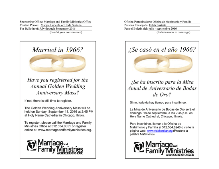 Sponsoring Office: Marriage and Family Ministries Office Contact Person: Margie Luberda or Hilda Sustaita For Bulletin of: July through September 2016 (date/at your convenience) Oficina Patrocinadora: Oficina de Matrimonio y Familia Persona Encargada: Hilda Sustaita Para el Boletín del: julio - septiembre 2016 (fecha/cuando le convenga) Married in 1966? ¿Se casó en el año 1966? Have you registered for the Annual Golden Wedding Anniversary Mass? ¿Se ha inscrito para la Misa Anual de Aniversario de Bodas de Oro? If not, there is still time to register. The Golden Wedding Anniversary Mass will be held on Sunday, September 18, 2016 at 2:45 PM at Holy Name Cathedral in Chicago, Illinois. To register, please call the Marriage and Family Ministries Office at 312.534.8351 or register online at: www.marriageandfamilyministries.org. Si no, todavía hay tiempo para inscribirse. La Misa de Aniversario de Bodas de Oro será el domingo, 18 de septiembre, a las 2:45 p.m. en Holy Name Cathedral, Chicago, Illinois. Para inscribirse, llamar a la Oficina de Matrimonio y Familia al 312.534.8240 o visite la página web: www.vidafamiliar.org (Presione la palabra Matrimonio). Sponsoring Office: Marriage and Family Ministries Office Contact Person: Małgorzata Luberda For Bulletin of: od lipca do września 2016 r. (wybierz dla siebie dogodną datę) CZY ZAWARLIŚCIE PAŃSTWO ZWIĄZEK MAŁŻEŃSKI W 1966 ROKU? Jeżeli tak i chcielibyście uczestniczyć we Mszy Świętej z okazji 50-tej rocznicy zawarcia związku małżeńskiego to nadal nie jest za późno, aby się zarejestrować. Msza ta odbędzie się w niedzielę, 18 września, o godzinie 2:45 po południu w Katedrze Świętego Imienia w Chicago, Illinois. Rejestracji można dokonać w języku polskim dzwoniąc pod numer: 312.534.8225 lub przez Internet wchodząc na poniższą stronę internetową: www.marriageandfamilyministries.org.