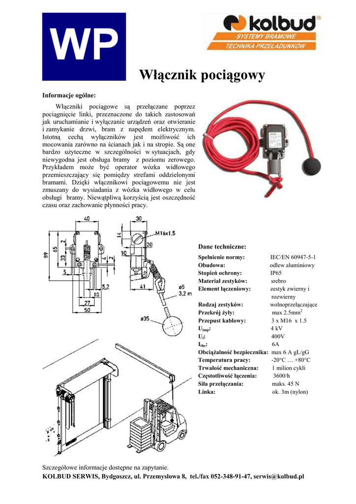 Włącznik pociągowy Informacje ogólne: Włączniki pociągowe są przełączane poprzez pociągnięcie linki, przeznaczone do takich zastosowań jak uruchamianie i wyłączanie urządzeń oraz otwieranie i zamykanie drzwi, bram z napędem elektrycznym. Istotną cechą wyłączników jest moŜliwość ich mocowania zarówno na ścianach jak i na stropie. Są one bardzo uŜyteczne w szczególności w sytuacjach, gdy niewygodna jest obsługa bramy z poziomu zerowego. Przykładem moŜe być operator wózka widłowego przemieszczający się pomiędzy strefami oddzielonymi bramami. Dzięki włącznikowi pociągowemu nie jest zmuszany do wysiadania z wózka widłowego w celu obsługi bramy. Niewątpliwą korzyścią jest oszczędność czasu oraz zachowanie płynności pracy. Dane techniczne: Spełnienie normy: Obudowa: Stopień ochrony: Materiał zestyków: Element łączeniowy: IEC/EN 60947-5-1 odlew aluminiowy IP65 srebro zestyk zwierny i rozwierny Rodzaj zestyków: wolnoprzełączające Przekrój Ŝyły: max 2.5mm2 Przepust kablowy: 3 x M16 x 1.5 Uimp: 4 kV Ui: 400V Ithe: 6A ObciąŜalność bezpiecznika: max 6 A gL/gG Temperatura pracy: -20°C … +80°C Trwałość mechaniczna: 1 milion cykli Częstotliwość łączenia: 3600/h Siła przełączania: maks. 45 N Linka: ok. 3m (nylon) Szczegółowe informacje dostępne na zapytanie. KOLBUD SERWIS, Bydgoszcz, ul. Przemysłowa 8, tel./fax 052-348-91-47, [email protected]
