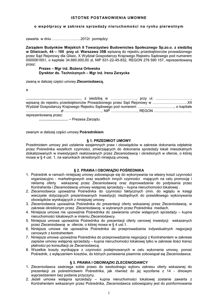 IST O T NE PO ST ANO W IENIA UM O W NE o w spółpracy w z akresie sprz edaż y nieruchomości na rynku pierw otnym zawarta w dniu …………………...2012r pomiędzy: Zarządem Budynków Miejskich II Towarzystwo Budownictwa Społecznego Sp.zo.o. z siedzibą w Gliwicach, 44 – 100 przy ul. Warszawa 35B wpisaną do rejestru przedsiębiorców prowadzonego przez Sąd Rejonowy dla Gliwic, X Wydział Gospodarczy Krajowego Rejestru Sądowego pod numerem 0000061651, o kapitale 34.660.000,00 zł, NIP 631-22-45-832, REGON 276 590 157, reprezentowaną przez: Prezes – Mgr inż. Bożena Orłowska Dyrektor ds. Technicznych – Mgr inż. Irena Zarzycka zwaną w dalszej części umowy Zleceniodawcą, a ………………………………………, z siedzibą w …………………, przy ul. ……………………….., wpisaną do rejestru przedsiębiorców Prowadzonego przez Sąd Rejonowy w ………………………..XII Wydział Gospodarczy Krajowego Rejestru Sądowego pod numerem …………………………, o kapitale ………………………. zł …………………………., NIP …………………., REGON …………………………, reprezentowaną przez: …………………… – Prezesa Zarządu zwanym w dalszej części umowy Pośrednikiem § 1. PRZEDMIOT UMOWY Przedmiotem umowy jest ustalenie wzajemnych praw i obowiązków w zakresie dokonania odpłatnie przez Pośrednika wszelkich czynności, zmierzających do dokonania sprzedaży lokali mieszkalnych zlokalizowanych w inwestycjach realizowanych przez Zleceniodawcę i określonych w ofercie, o której mowa w § 4 ust. 1, na warunkach określonych niniejszą umową. § 2. PRAWA I OBOWIĄZKI POŚREDNIKA 1. Pośrednik w ramach niniejszej umowy zobowiązuje się do wykonywania na własny koszt czynności organizacyjno - marketingowych oraz wszelkich innych czynności mających na celu promocję i reklamę oferty wskazanej przez Zleceniodawcę oraz doprowadzenie do podpisania przez Kontrahenta i Zleceniodawcę umowy wstępnej sprzedaży – kupna nieruchomości lokalowej . 2. Zleceniodawca upoważnia Pośrednika do czynności faktycznych (min. do wglądu w księgi wieczyste dotyczących prezentowanych inwestycji) niezbędnych do prawidłowego wykonywania obowiązków wynikających z niniejszej umowy. 3. Zleceniodawca upoważnia Pośrednika do prezentacji oferty wskazanej przez Zleceniodawcę, w zakresie określonym przez Zleceniodawcę, w wybranych przez Pośrednika mediach. 4. Niniejsza umowa nie upoważnia Pośrednika do zawierania umów wstępnych sprzedaży – kupna nieruchomości lokalowych w imieniu Zleceniodawcy. 5. Niniejsza umowa upoważnia Pośrednika do prezentacji oferty cenowej inwestycji wskazanych przez Zleceniodawcę w ofercie, o której mowa w § 4 ust.1. 6. Niniejsza umowa nie upoważnia Pośrednika do przeprowadzania indywidualnych negocjacji cenowych z kontrahentem 7. Niniejsza umowa upoważnia Pośrednika do przeprowadzania negocjacji z Kontrahentem w zakresie zapisów umowy wstępnej sprzedaży – kupna nieruchomości lokalowej tylko w zakresie ilości transz płatności po konsultacji ze Zleceniodawcą. 8. Wszelkie koszty wynikające z czynności podejmowanych w celu wykonania umowy, ponosi Pośrednik, z wyłączeniem kosztów, do których poniesienia pisemnie zobowiązał się Zleceniodawca. § 3. PRAWA I OBOWIĄZKI ZLECENIODAWCY 1. Zleceniodawca zastrzega sobie prawo do swobodnego wyboru zakresu oferty wskazanej do prezentacji za pośrednictwem Pośrednika, jak również do jej wycofania z 14 - dniowym wyprzedzeniem bez podania przyczyny. 2. Jeżeli umowa wstępna sprzedaży – kupna nieruchomości lokalowej zostanie zawarta z Kontrahentem wskazanym przez Pośrednika, Zleceniodawca zobowiązany jest do poinformowania 1 Pośrednika pismem (przekazanym osobiście, listem poleconym, faksem, mailem) z potwierdzeniem jego wysłania, w terminie 7 dni roboczych liczonych od zawarcia powyższej umowy. § 4. PREZENTACJA OFERTY, ZGŁOSZENIE KONTRAHENTA 1. Zleceniodawca pisemnie (przekazanym osobiście, listem poleconym, faksem, mailem), w terminie 7 dni od zawarcia niniejszej umowy, przekaże Pośrednikowi ofertę wskazaną do prezentacji. Pośrednik, w terminie trzech dni potwierdzi pisemnie za pomocą listu poleconego, faksu z potwierdzeniem przesłania, e-mailem lub osobiście przyjęcie wskazanej przez Zleceniodawcę oferty do prezentacji. Zleceniodawcy przysługuje prawo zmiany oferty wskazanej do prezentacji, o której mowa w zdaniu poprzedzającym, po uprzednim zawiadomieniu Pośrednika listem poleconym, email lub faxem z potwierdzeniem wysłania z 7 dniowym wyprzedzeniem. Każda nowa oferta anuluje ważność poprzedniej. 2. Zgłoszenie Kontrahenta nastąpi poprzez zgłoszenie osobiste, list polecony, e-mail lub faxem z potwierdzeniem nadania. 3. Wzór zgłoszenia Kontrahenta stanowi załącznik nr 1 (Karta Rezerwacyjna). 4. Pośrednik, po uprzedniej zgodzie Zleceniodawcy, może dokonać w imieniu Kontrahenta rezerwacji nieruchomości zgłoszonej w imiennej formie pisemnej, na okres nie dłuższy niż 14 dni. 5. Pośrednik poinformuje Kontrahenta o konieczności wpłaty zaliczki w wysokości określonej w karcie rezerwacyjnej. Wpłata zaliczki stanowi I transzę płatności. Po wpłacie zaliczki Kontrahent przystąpi do podpisania umowy wstępnej sprzedaży – kupna nieruchomości lokalowej. 6. W przypadku zgłoszenia przez Pośrednika Kontrahenta znajdującego się już w „Bazie Danych Zleceniodawcy”, Zleceniodawca zobowiązuje się fakt ten zgłosić e-mail lub fax. Pośrednikowi w terminie trzech dni roboczych od otrzymania danych potencjalnego Kontrahenta. 7. Przez pojęcie „Baza Danych Zleceniodawcy” rozumie się wykaz Klientów, którzy zawarli ze Zleceniodawcą umowę wstępną sprzedaży – kupna nieruchomości lokalowej w inwestycjach przez niego realizowanych. Kontrahent znajdujący się jako Klient w ww. „Bazie Danych Zleceniodawcy” ma prawo zawrzeć umowę bezpoś