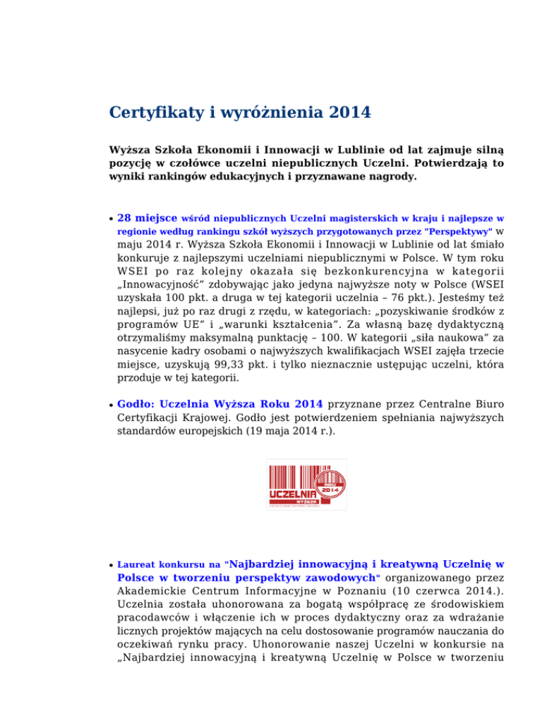 Certyfikaty i wyróżnienia 2014 Wyższa Szkoła Ekonomii i Innowacji w Lublinie od lat zajmuje silną pozycję w czołówce uczelni niepublicznych Uczelni. Potwierdzają to wyniki rankingów edukacyjnych i przyznawane nagrody. ● ● ● 28 miejsce wśród niepublicznych Uczelni magisterskich w kraju i najlepsze w regionie według rankingu szkół wyższych przygotowanych przez "Perspektywy" w maju 2014 r. Wyższa Szkoła Ekonomii i Innowacji w Lublinie od lat śmiało konkuruje z najlepszymi uczelniami niepublicznymi w Polsce. W tym roku WSEI po raz kolejny okazała się bezkonkurencyjna w kategorii „Innowacyjność” zdobywając jako jedyna najwyższe noty w Polsce (WSEI uzyskała 100 pkt. a druga w tej kategorii uczelnia – 76 pkt.). Jesteśmy też najlepsi, już po raz drugi z rzędu, w kategoriach: „pozyskiwanie środków z programów UE” i „warunki kształcenia”. Za własną bazę dydaktyczną otrzymaliśmy maksymalną punktację – 100. W kategorii „siła naukowa” za nasycenie kadry osobami o najwyższych kwalifikacjach WSEI zajęła trzecie miejsce, uzyskują 99,33 pkt. i tylko nieznacznie ustępując uczelni, która przoduje w tej kategorii. Godło: Uczelnia Wyższa Roku 2014 przyznane przez Centralne Biuro Certyfikacji Krajowej. Godło jest potwierdzeniem spełniania najwyższych standardów europejskich (19 maja 2014 r.). Laureat konkursu na "Najbardziej innowacyjną i kreatywną Uczelnię w Polsce w tworzeniu perspektyw zawodowych" organizowanego przez Akademickie Centrum Informacyjne w Poznaniu (10 czerwca 2014.). Uczelnia została uhonorowana za bogatą współpracę ze środowiskiem pracodawców i włączenie ich w proces dydaktyczny oraz za wdrażanie licznych projektów mających na celu dostosowanie programów nauczania do oczekiwań rynku pracy. Uhonorowanie naszej Uczelni w konkursie na „Najbardziej innowacyjną i kreatywną Uczelnię w Polsce w tworzeniu perspektyw zawodowych” potwierdza pozycję Szkoły jako placówki prezentującej najlepsze narzędzia oraz projekty poprawiające status własnych absolwentów na rynku pracy, a także realizującej adekwatne do rynku pracy programy nauczania, dzięki którym możemy kształcić dobrych specjalistów, poszukiwanych przez pracodawców. ● ● Certyfikat „Wiarygodna Szkoła” i certyfikat „Dobra Uczelnia – Dobra Praca” przyznany przez Akademickie Centrum Informacyjne w Poznaniu (10 czerwca 2014.). Przyznanie przez komisję certyfikatu „Wiarygodna Szkoła” oznacza, że WSEI jest uczelnią dysponującą odpowiednią bazą dydaktyczną, zapewniającą właściwe warunki studiowania. Ponadto umożliwia studentom rozwój zainteresowań i umiejętności oraz kształci wysokiej klasy specjalistów, którzy bez trudu odnajdują się na rynku pracy. Posiada również ofertę pozadydaktycznych form działalności, prowadzi współpracę z innymi ośrodkami edukacyjnymi (w kraju i za granicą), a także posiada aktywne biuro karier. Analizie poddano również funkcjonowanie jednostek uczelnianych na rzecz absolwentów, dostosowanie programu nauczania do potrzeb rynku pracy, krajowe i zagraniczne programy stażowe, a także współpraca uczelni z pracodawcami z regionu. WSEI została „Wiarygodną Szkołą” już po raz dziesiąty z rzędu. Po raz trzeci został przyznany certyfikat „Dobra Uczelnia – Dobra Praca”. Znak jakości Dobra Uczelnia – Dobra Praca zaakcentuje atrakcyjność uczelni w oczach maturzysty, dla których aspekt realnego zatrudnienia po ukończonych studiach stanowi podstawowe kryterium wyboru ścieżki kształcenia. Srebrny certyfikat "Uczelnia Liderów 2014" przyznany przez Fundację Rozwoju Edukacji i Szkolnictwa Wyższego oraz Agencję PRC (18 czerwca 2014 r.). Przyznanie uczelni certyfikatu „Uczelnia Liderów” oznacza, że kształci ona w oparciu o nowoczesne, innowacyjne programy studiów, zgodnie z potrzebami rynku pracy, a jej absolwenci są atrakcyjni dla rynku pracy, twórczy, kreatywni, wyposażeni w szeroką wiedzę i umiejętności praktyczne. Certyfikaty „Uczelnia Liderów” otrzymało 46 uczelni (uniwersytetów, państwowych wyższych szkół zawodowych oraz uczelni niepublicznych) z całej Polski, które – w opinii komisji certyfikacyjnej – cechują się działaniami zorientowanymi na edukację praktyczną studentów, innowacyjnością oferty oraz oryginalnymi formami współpracy z otoczeniem społeczno-gospodarczym. WSEI, podobnie jak siedem innych uczelni z kraju, otrzymała dodatkowe wyróżnienie – srebrny certyfikat „Uczelnia Liderów”. Otrzymały je uczelnie, które po raz trzeci odebrały laury w Programie, a zatem uczelnie nagradzane certyfikatem od trzech lat. ● ● Statuetka "Aurea Praxis" dla Rektora dr. hab. Mirosława J. Jarosza, prof. nadzw. WSEI. Rektor Wyższej Szkoły Ekonomii i Innowacji w Lublinie znalazł się wśród sześciu rektorów uhonorowanych statuetką „Aurea Praxis” dla rektorów uczelni wykazujących się szczególnym, osobistym zaangażowaniem na rzecz rozwoju i promowania w swoich uczelniach idei edukacji dla rynku Certyfikat „Polska Nagroda Innowacyjności 2014” w kategorii Uczelnie Wyższe (20 stycznia 2015 r.). Polska Nagroda Innowacyjności jest programem wizerunkowym prowadzonym przez Polską Agencję Przedsiębiorczości i redakcję „Forum Przedsiębiorczości” w „Dzienniku Gazecie Prawnej”. Nagrodę otrzymują najbardziej innowacyjne oraz kreatywne uczelnie, instytuty naukowo-badawcze, firmy i instytucje, których działalność cechuje innowacyjność i dbałość o sferę badawczo-rozwojową. Laureatami tego prestiżowego konkursu są zatem wiodące w na polskim rynku uczelnie, prowadzące szeroką działalność naukową i rozwojową oraz promujące współpracę nauki z biznesem. To podmioty, których praca badawczo-rozwojowa znajduje zastosowanie w różnych gałęziach gospodarki, przyczyniając się do jej rozwoju.
