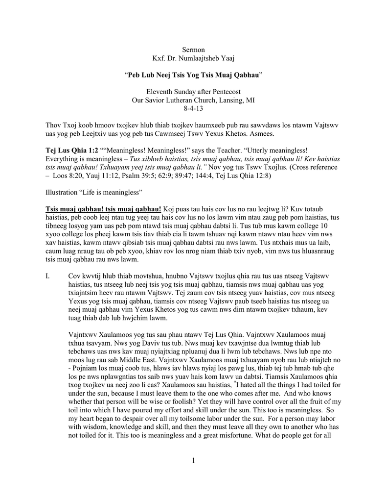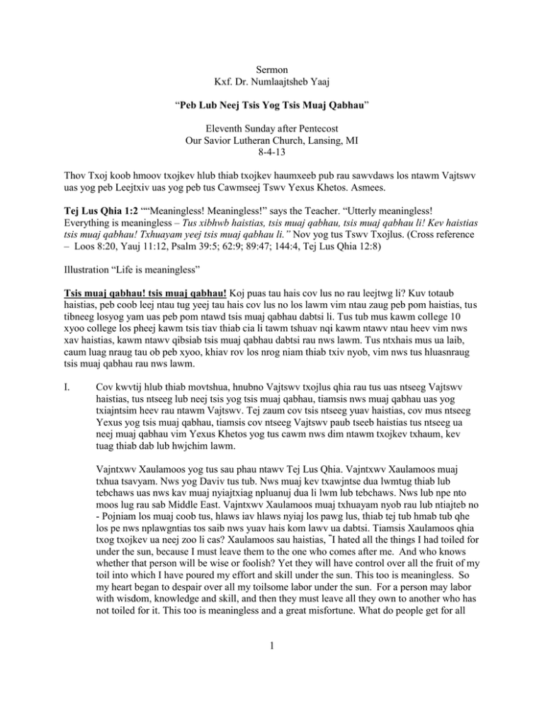 Sermon Kxf. Dr. Numlaajtsheb Yaaj “Peb Lub Neej Tsis Yog Tsis Muaj Qabhau” Eleventh Sunday after Pentecost Our Savior Lutheran Church, Lansing, MI 8-4-13 Thov Txoj koob hmoov txojkev hlub thiab txojkev haumxeeb pub rau sawvdaws los ntawm Vajtswv uas yog peb Leejtxiv uas yog peb tus Cawmseej Tswv Yexus Khetos. Asmees. Tej Lus Qhia 1:2 ““Meaningless! Meaningless!” says the Teacher. “Utterly meaningless! Everything is meaningless – Tus xibhwb haistias, tsis muaj qabhau, tsis muaj qabhau li! Kev haistias tsis muaj qabhau! Txhuayam yeej tsis muaj qabhau li.” Nov yog tus Tswv Txojlus. (Cross reference – Loos 8:20, Yauj 11:12, Psalm 39:5; 62:9; 89:47; 144:4, Tej Lus Qhia 12:8) Illustration “Life is meaningless” Tsis muaj qabhau! tsis muaj qabhau! Koj puas tau hais cov lus no rau leejtwg li? Kuv totaub haistias, peb coob leej ntau tug yeej tau hais cov lus no los lawm vim ntau zaug peb pom haistias, tus tibneeg losyog yam uas peb pom ntawd tsis muaj qabhau dabtsi li. Tus tub mus kawm college 10 xyoo college los pheej kawm tsis tiav thiab cia li tawm tshuav nqi kawm ntawv ntau heev vim nws xav haistias, kawm ntawv qibsiab tsis muaj qabhau dabtsi rau nws lawm. Tus ntxhais mus ua laib, caum luag nraug tau ob peb xyoo, khiav rov los nrog niam thiab txiv nyob, vim nws tus hluasnraug tsis muaj qabhau rau nws lawm. I. Cov kwvtij hlub thiab movtshua, hnubno Vajtswv txojlus qhia rau tus uas ntseeg Vajtswv haistias, tus ntseeg lub neej tsis yog tsis muaj qabhau, tiamsis nws muaj qabhau uas yog txiajntsim heev rau ntawm Vajtswv. Tej zaum cov tsis ntseeg yuav haistias, cov mus ntseeg Yexus yog tsis muaj qabhau, tiamsis cov ntseeg Vajtswv paub tseeb haistias tus ntseeg ua neej muaj qabhau vim Yexus Khetos yog tus cawm nws dim ntawm txojkev txhaum, kev tuag thiab dab lub hwjchim lawm. Vajntxwv Xaulamoos yog tus sau phau ntawv Tej Lus Qhia. Vajntxwv Xaulamoos muaj txhua tsavyam. Nws yog Daviv tus tub. Nws muaj kev txawjntse dua lwmtug thiab lub tebchaws uas nws kav muaj nyiajtxiag npluanuj dua li lwm lub tebchaws. Nws lub npe nto moos lug rau sab Middle East. Vajntxwv Xaulamoos muaj txhuayam nyob rau lub ntiajteb no - Pojniam los muaj coob tus, hlaws iav hlaws nyiaj los pawg lus, thiab tej tub hmab tub qhe los pe nws nplawgntias tos saib nws yuav hais kom lawv ua dabtsi. Tiamsis Xaulamoos qhia txog txojkev ua neej zoo li cas? Xaulamoos sau haistias, “I hated all the things I had toiled for under the sun, because I must leave them to the one who comes after me. And who knows whether that person will be wise or foolish? Yet they will have control over all the fruit of my toil into which I have poured my effort and skill under the sun. This too is meaningless. So my heart began to despair over all my toilsome labor under the sun. For a person may labor with wisdom, knowledge and skill, and then they must leave all they own to another who has not toiled for it. This too is meaningless and a great misfortune. What do people get for all 1 the toil and anxious striving with which they labor under the sun? All their days their work is grief and pain; even at night their minds do not rest. This too is meaningless. – Tej haujlwm uas kuv ua thiab tej uas kuv khwv tau nyob hauv qab ntuj no, yeej tsis muaj qabhau rau kuv, rau qhov kuv yeej paub haistias kuv yuav muab tej ntawd tso tseg rau tus uas yuav los hloov kuv chaw, thiab leejtwg yuav paub haistias tus uas yuav los ntawd nws yog tus ntse lossis yog tus ruam? Txawm yog nws yuav zoo li cas los xij, nws yeej yuav tau tej uas kuv lub tswvyim khwv tau rau hauv qab ntuj no. Tej ntawd los tsis muaj qabhau li. Yog li ntawd, kuv thiaj li rov khuvxim txog tej haujlwm hnyav uas kuv tau ua nyob hauv qab ntuj no. Tibeeg siv tswvyim, kev paub, thiab kev txawj ntse ua haujlwm tau nyiaj thiab ibpuas tsavyam khaws cia, tiamsis kuj muab tej ntawd tso tseg rau lwm tus uas tsis tau siv dag siv zog khwv li yuav. Tej ntawd kuj tsis muaj qabhau thiab tsis tsimnyog li. Yus yuav tau dabtsi los ntawm qhov uas yus sib sib zog khwv thiab huas ua ntxhov siab hnyov hauv qab ntuj no? Yus txojsia yuav nyob ntev li cas los xij, txhuayam uas yus ua tsuas yog coj kev txhawj xeeb thiab kev ntxhov siab los rau yus xwb. Txawm yog ntuj teb tag hmo los yus lub siab yeej tsis tau so li. Tej no los tsis muaj qabhau li.” (Tej Lus Qhia 2:18-23) Thaum koj hnov cov lus no, koj puas qab siab ua neej? Txawm koj khwv ua haujlwm kom koj tau nyiaj thiab tau liaj av ntau, thiab tau tej tsev loj thiab muaj ntau yam los muaj ib hnub twg koj txojsia tu lawm koj puas coj tau dabtsi? Koj tej nyiaj, koj tej koob tej npe yuav pab tau koj li cas? Nov puas muaj nuj nqi rau koj? Nws yuav muaj qabhau dabtsi lawm. Txhuayam yeej tsis muaj qabhau dabtsi li lawm. II. Thaum kuv nyeem nqi Vajluskub ntawm Tej Lus Qhia ua rau kuv nco txog muaj ib tus txivneej lub npe hu Daryl uas tau tag simneej ntev xyoo los lawm. Nws muaj 160 acres av ua teb nyob rau IOWA. Nws los kuj yug npua thiab. Nws ua teb rau lub sijhawm uas tej qoob loo los tseem tau nqi. Nws muaj nyiaj txiag ntau heev li vim txhua leej txhua tus yeej paub tas huv tibsi tias nws muaj nyiaj. Tiamsis nws khauv xim nws tej nyiaj thiab nws tsis siv li. Nws thiab nws tus pojniam nkawv nyob tib lub tsev uas qub qub thiab nkawv tsis kho li. Tawm mus noj mov sab nraud thiab mus kev deb los nkawv tsis mus. Nkawv tsis muaj color tv, thiab tej khoom tshiab siv rau vajtsev los nkawd tsis mus yuav los hloov cov qub li. Tej thaum Daryl tsav nws lub tsheb los txog tej qhov ntxhab nqis taug, nws muab lub cav tua es cia lub tsheb mam mam ntog mus kom nws thiaj li tsis siv roj ntau. Muaj ib hnub nkawv mus hawm vajtswv nkawv pom xibhwb tsav ib lub tsheb tshiab, nkawv cia li tsis mus koom pawgntseeg lawm vim nws xav haistias xibhwb ua neej zoo tshaj li qhov uas xibhwb tsis tsimnyog ua. Thaum uas Daryl tuag, nws lub vajtsev nrog liajteb raug nqes li 2 laab duaslas. $50,000 nyob rau ib lub account, $75,000 nyob dua ib lub account thiab $120,000 nyob rau lwm lub account. N