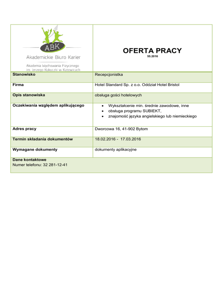 OFERTA PRACY 55.2016 Stanowisko Recepcjonistka Firma Hotel Standard Sp. z o.o. Oddział Hotel Bristol Opis stanowiska obsługa gości hotelowych Oczekiwania względem aplikującego Wykształcenie min. średnie zawodowe, inne obsługa programu SUBIEKT, znajomość języka angielskiego lub niemieckiego Adres pracy Dworcowa 16, 41-902 Bytom Termin składania dokumentów 18.02.2016 - 17.03.2016 Wymagane dokumenty dokumenty aplikacyjne Dane kontaktowe Numer telefonu: 32 281-12-41