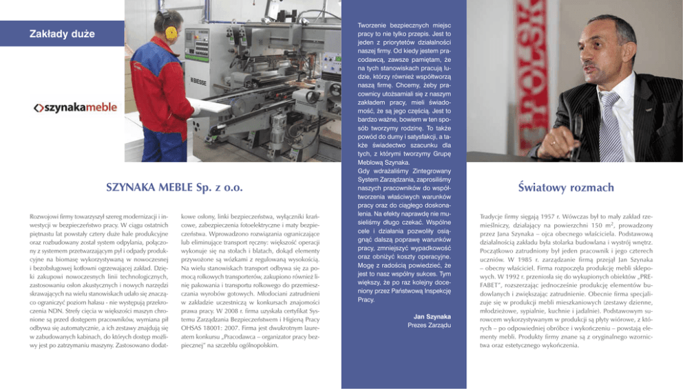 Zakłady duże SZYNAKA MEBLE Sp. z o.o. Rozwojowi firmy towarzyszył szereg modernizacji i inwestycji w bezpieczeństwo pracy. W ciągu ostatnich piętnastu lat powstały cztery duże hale produkcyjne oraz rozbudowany został system odpylania, połączony z systemem przetwarzającym pył i odpady produkcyjne na biomasę wykorzystywaną w nowoczesnej i bezobsługowej kotłowni ogrzewającej zakład. Dzięki zakupowi nowoczesnych linii technologicznych, zastosowaniu osłon akustycznych i nowych narzędzi skrawających na wielu stanowiskach udało się znacząco ograniczyć poziom hałasu - nie występują przekroczenia NDN. Strefy cięcia w większości maszyn chronione są przed dostępem pracowników, wymiana pił odbywa się automatycznie, a ich zestawy znajdują się w zabudowanych kabinach, do których dostęp możliwy jest po zatrzymaniu maszyny. Zastosowano dodat- kowe osłony, linki bezpieczeństwa, wyłączniki krańcowe, zabezpieczenia fotoelektryczne i maty bezpieczeństwa. Wprowadzono rozwiązania ograniczające lub eliminujące transport ręczny: większość operacji wykonuje się na stołach i blatach, dokąd elementy przywożone są wózkami z regulowaną wysokością. Na wielu stanowiskach transport odbywa się za pomocą rolkowych transporterów, zakupiono również linię pakowania i transportu rolkowego do przemieszczania wyrobów gotowych. Młodociani zatrudnieni w zakładzie uczestniczą w konkursach znajomości prawa pracy. W 2008 r. firma uzyskała certyfikat Systemu Zarządzania Bezpieczeństwem i Higieną Pracy OHSAS 18001: 2007. Firma jest dwukrotnym laureatem konkursu „Pracodawca – organizator pracy bezpiecznej” na szczeblu ogólnopolskim. Tworzenie bezpiecznych miejsc pracy to nie tylko przepis. Jest to jeden z priorytetów działalności naszej firmy. Od kiedy jestem pracodawcą, zawsze pamiętam, że na tych stanowiskach pracują ludzie, którzy również współtworzą naszą firmę. Chcemy, żeby pracownicy utożsamiali się z naszym zakładem pracy, mieli świadomość, że są jego częścią. Jest to bardzo ważne, bowiem w ten sposób tworzymy rodzinę. To także powód do dumy i satysfakcji, a także świadectwo szacunku dla tych, z którymi tworzymy Grupę Meblową Szynaka. Gdy wdrażaliśmy Zintegrowany System Zarządzania, zaprosiliśmy naszych pracowników do współtworzenia właściwych warunków pracy oraz do ciągłego doskonalenia. Na efekty naprawdę nie musieliśmy długo czekać. Wspólne cele i działania pozwoliły osiągnąć dalszą poprawę warunków pracy, zmniejszyć wypadkowość oraz obniżyć koszty operacyjne. Mogę z radością powiedzieć, że jest to nasz wspólny sukces. Tym większy, że po raz kolejny doceniony przez Państwową Inspekcję Pracy. Jan Szynaka Prezes Zarządu Światowy rozmach Tradycje firmy sięgają 1957 r. Wówczas był to mały zakład rzemieślniczy, działający na powierzchni 150 m2, prowadzony przez Jana Szynaka – ojca obecnego właściciela. Podstawową działalnością zakładu była stolarka budowlana i wystrój wnętrz. Początkowo zatrudniony był jeden pracownik i jego czterech uczniów. W 1985 r. zarządzanie firmą przejął Jan Szynaka – obecny właściciel. Firma rozpoczęła produkcję mebli sklepowych. W 1992 r. przeniosła się do wykupionych obiektów „PREFABET”, rozszerzając jednocześnie produkcję elementów budowlanych i zwiększając zatrudnienie. Obecnie firma specjalizuje się w produkcji mebli mieszkaniowych (zestawy dzienne, młodzieżowe, sypialnie, kuchnie i jadalnie). Podstawowym surowcem wykorzystywanym w produkcji są płyty wiórowe, z których – po odpowiedniej obróbce i wykończeniu – powstają elementy mebli. Produkty firmy znane są z oryginalnego wzornictwa oraz estetycznego wykończenia.
