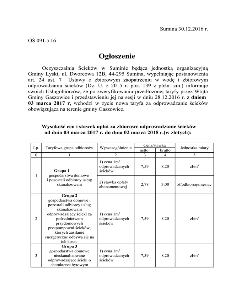 taryfy - Oczyszczalnia Ścieków w Suminie