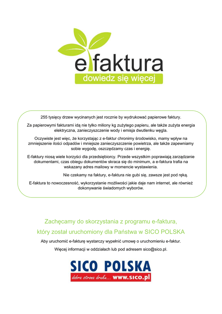 255 tysięcy drzew wycinanych jest rocznie by wydrukować papierowe faktury. Za papierowymi fakturami idą nie tylko miliony kg zużytego papieru, ale także zużyta energia elektryczna, zanieczyszczenie wody i emisja dwutlenku węgla. Oczywiste jest więc, że korzystając z e-faktur chronimy środowisko, mamy wpływ na zmniejszenie ilości odpadów i mniejsze zanieczyszczenie powietrza, ale także zapewniamy sobie wygodę, oszczędzamy czas i energię. E-faktury niosą wiele korzyści dla przedsiębiorcy. Przede wszystkim poprawiają zarządzanie dokumentami, czas obiegu dokumentów skraca się do minimum, a e-faktura trafia na wskazany adres mailowy w momencie wystawienia. Nie czekamy na faktury, e-faktura nie gubi się, zawsze jest pod ręką. E-faktura to nowoczesność, wykorzystanie możliwości jakie daje nam internet, ale również dokonywanie świadomych wyborów. Zachęcamy do skorzystania z programu e-faktura, który został uruchomiony dla Państwa w SICO POLSKA Aby uruchomić e-fakturę wystarczy wypełnić umowę o uruchomieniu e-faktur. Więcej informacji w oddziałach lub pod adresem [email protected].