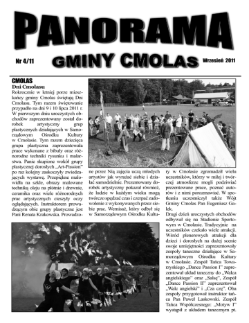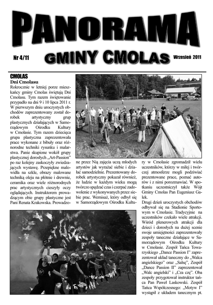 Nr 4/11 Wrzesień 2011 CMOLAS Dni Cmolasu Rokrocznie w letniej porze miesz kańcy gminy Cmolas świętują Dni Cmolasu. Tym razem świętowanie przypadło na dni 9 i 10 lipca 2011 r. W pierwszym dniu uroczystych ob chodów zaprezentowany został do robek artystyczny grup plastycznych działających w Samo rządowym Ośrodku Kultury w Cmolasie. Tym razem dziecięca grupa plastyczna zaprezentowała prace wykonane z bibuły oraz róż norodne techniki rysunku i malar stwa. Panie skupione wokół grupy plastycznej dorosłych „ArtPassion” po raz kolejny zaskoczyły zwiedza jących wystawę. Przepiękne malo widła na szkle, obrazy malowane techniką oleju na płótnie i drewnie, ceramika oraz wiele różnorodnych prac artystycznych cieszyły oczy oglądających. Instruktorem prowa dzącym obie grupy plastyczne jest Pani Renata Krakowska. Prowadzo ne przez Nią zajęcia uczą młodych artystów jak wyrażać siebie i dzia łać samodzielnie. Prezentowany do robek artystyczny pokazał również, że ludzie w każdym wieku mogą twórczo spędzać czas i czerpać zado wolenie z wykonywanych przez sie bie prac. Wernisaż, który odbył się w Samorządowym Ośrodku Kultu ry w Cmolasie zgromadził wielu uczestników, którzy w miłej i twór czej atmosferze mogli podziwiać prezentowane prace, poznać auto rów i z nimi porozmawiać. W spo tkaniu uczestniczył także Wójt Gminy Cmolas Pan Eugeniusz Ga lek. Drugi dzień uroczystych obchodów odbywał się na Stadionie Sporto wym w Cmolasie. Tradycyjnie na uczestników czekało wiele atrakcji. Wśród plenerowych atrakcji dla dzieci i dorosłych na dużej scenie swoje umiejętności zaprezentowały zespoły taneczne działające w Sa morządowym Ośrodku Kultury w Cmolasie. Zespół Tańca Towa rzyskiego „Dance Passion I” zapre zentował układ taneczny do „Walca angielskiego” oraz „Salsę”, Zespół „Dance Passion II” zaprezentował „Walc angielski” i „Cza czę”. Oba zespoły przygotował instruktor tań ca Pan Paweł Laskowski. Zespół Tańca Współczesnego: „Motyw I” wystąpił z układem tanecznym pt. „Dysonans uczuć” natomiast „Mo tyw II” zaprezentował taniec pt. „Pewnego razu we śnie” Instrukto rem zespołów jest Pani Magdalena Depa. Po występach tanecznych na stąpiła chwila grozy, bo wydawało się, że nadciągająca, burzowa chmu ra przerwie te wspaniałe chwile. Na szczęście obawy okazały się przed wczesne, a odrobina deszczu, jaką ze sobą przyniosła, nie zdołała znie chęcić uczestników do dalszej zaba wy. Jedną z głównych atrakcji był gród słowiański. Słowianie za Liczni miłośnicy tańca i do brej zabawy bawili się do późnego wieczora przy dźwiękach zespołu muzycznego „MADAM” z Rzeszo wa. Zabawę taneczną uświetnił po kaz sztucznych ogni. Organizatorami tegorocz nych „Dni Cmolasu” byli: Urząd Gminy Cmolas i Samorządowy Ośrodek Kultury w Cmolasie. Pa tronat medialny objęli: Twoje Radio Cmolas i KORSO Regionalne w Kolbuszowej. prezentowali tradycyjne stroje i tań ce z udziałem uczestników imprezy. Wszyscy mogli się również zapo znać ze zwyczajami Słowian, wypró bować wczesnośredniowiecznej kuchni, czy przyjrzeć się wyrabia niu uzbrojenia. Podczas licznych konkursów zarówno dzieci jak i do rośli mogli sprawdzić swoje si ły m.in. w łowieniu ryb na czas, strzelaniu z łuku i in. Na zwycięz ców czekały atrakcyjne nagrody. Największe wrażenie na uczestni kach zrobił zaprezentowany przez Słowian taniec z ogniem. Miłośnicy folkloru mogli ba wić się przy występach Zespołu Lu dowego „Cmolasianie”. Dodatkowymi atrakcjami czekający mi na młodszych uczestników były dmuchane zjeżdżalnie, trampoliny, balony, wata cukrowa. Dla wszyst kich przygotowany był grill i kate ring. Gwiazdą wieczoru był ze spół „PodobaMi Się” prezentujący muzykę Ska/Reg gae, zdobywcy dzikiej karty w programie „Must be the Mu sic”. O tym, jak uczestnicy dobrze się bawili, świad czyły gromkie brawa, które kil kakrotnie zachę cały zespół do ponownego wyj ścia na scenę. Po koncercie leade rzy zespołu rozda wali swoim fanom autografy. Ostrowy Baranowskie Finały Turnieju o Puchar Wójta Gminy Cmolas W ostatnią niedzielę lipca rozegra no finały Turnieju o Puchar Wój ta Gminy Cmolas. Wszystkie trzy mecze odbyły się na płycie stadio nu w Ostrowach Baranowskich. W pojedynku o główne trofeum zmierzyły się dwie najlepsze dru żyny eliminacji – Ostrovia Ostro wy Baranowskie i Tempo Cmolas. Mecze o miejsca V i III rozgrywa no systemem 2 x 35 min., nato miast finałowe spotkanie odbyło się w pełnowymiarowym czasie 90 min. W meczu o piąte miejsce walczy ły drużyny Florian Ostrowy Tu szowskie oraz Vigor Trzęsówka. Mecz zakończył się remisem 0:0, ale w rzutach karnych skuteczniej si okazali się być zawodnicy Flo riana, którzy wygrali ostatecznie 4:2 i zajęli w turnieju 5. miejsce. O miejsce trzecie rywalizowały zespoły PKS Unitas Poręby Dy marskie i Ceramika Hadykówka. Mecz który zakończył się wyni kiem 1:3 zwyciężyła drużyna Ce ramiki Hadykówka . W finale spotkały się zespoły Ostrovia Ostrowy Baranowski i Tempo Cmolas. Mecz zakończył się wynikiem 2:2, ale w serii rzu tów karnych lepszymi byli zawod nicy Tempa, którzy pokonali rywali 5:4 i sięgnęli tym samym po główne trofeum. Piłkarski Turniej o Puchar Wójta Gminy Cmolas zarówno pod sportowym, jak i organizacyjnym względem wypadł wyśmienicie. Sama formuła rozgrywania me czów była przemyślana i dobrana tak, aby kibiców nie zamęczyć i nie zniechęcić długimi oczeki waniami na mecze swoich dru żyn. Oby więcej takich imprez. III Piknik Rodzinny w Ostrowach Tuszowskich Stowarzyszenie „Ostrowy” nie za sypia gruszek w popiele. Tym ra zem wraz z Samorządowym Ośrodkiem Kultury w Cmolasie i Radą Sołecką zorganizowało w dniu 7 sierpnia III Piknik Ro dzinny w Ostrowach Tuszow skich. Jak co roku, licznie zgromadzeni m