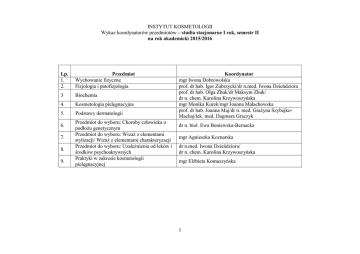 INSTYTUT KOSMETOLOGII Wykaz koordynatorów przedmiotów – studia stacjonarne I rok, semestr II na rok akademicki 2015/2016 Lp. 1. 2. Przedmiot Wychowanie fizyczne Fizjologia i patofizjologia 3 Biochemia 4. Kosmetologia pielęgnacyjna 5. Podstawy dermatologii 6. 7. 8. 9. Przedmiot do wyboru: Choroby człowieka o podłożu genetycznym Przedmiot do wyboru: Wizaż z elementami stylizacji/ Wizaż z elementami charakteryzacji Przedmiot do wyboru: Uzależnienia od leków i środków psychoaktywnych Praktyki w zakresie kosmetologii pielęgnacyjnej Koordynator mgr Iwona Dobrowolska prof. dr hab. Igor Zubrzycki/dr n.med. Iwona Dzieńdziora prof. dr hab. Olga Zhuk/dr Maksym Zhuk/ dr n. chem. Karolina Krzywoszyńska mgr Monika Kurek/mgr Joanna Małachowska prof. dr hab. Joanna Maj/dr n. med. Grażyna SzybejkoMachaj/lek. med. Dagmara Graczyk dr n. biol. Ewa Boniewska-Bernacka mgr Agnieszka Koznarska dr n.med. Iwona Dzieńdziora/ dr n. chem. Karolina Krzywoszyńska mgr Elżbieta Komuszyńska 1 INSTYTUT KOSMETOLOGII Wykaz koordynatorów przedmiotów – studia stacjonarne II rok, semestr IV na rok akademicki 2015/2016 Lp. Przedmiot 1. Przedmiot do wyboru:Język angielski 2. Przedmiot do wyboru: Edukacja zdrowotna i zasady żywienia Koordynator mgr Małgorzata Kochanowska/ mgr Hanna Kośmider-Matwiejczuk dr n. med. Magdalena Golachowska-Poleszczuk/ mgr Jolanta Żurakowska 3. Farmakologia prof. dr hab. Janusz Pluta 4. Przedmiot do wyboru: Zastosowanie ziół w kosmetologii dr n. chem. Teresa Farbiszewska 5. Kosmetologia upiększająca mgr Monika Kurek/mgr Elżbieta Kędzierska 6. Estetyka mgr Agnieszka Koznarska 7. Praktyki w zakresie kosmetologii pielęgnacyjnej, mgr Elżbieta Komuszyńska korekcyjnej i upiększającej 2 INSTYTUT KOSMETOLOGII Wykaz koordynatorów przedmiotów – studia stacjonarne III rok, semestr VI na rok akademicki 2015/2016 Lp. Przedmiot 1. Przedmiot do wyboru: Język angielski 2. 3. 4. 5. 6. 7. Metodologia badań naukowych Przedmiot do wyboru: Zarządzadzanie gabinetem kosmetycznym Przedmiot do wyboru:Transport przez bariery biologiczne Prawo medyczne Kosmetologia specjalistyczna z elementami makijażu pemanentnego Przedmiot do wyboru: Elementy podologii 9. Przedmiot do wyboru: Ochrona zdrowia w zawodzie kosmetologa-profilaktyka przeciwbólowa kręgosłupa i mięśni posturalnych Przedmiot do wyboru:Aromaterapia 10. Seminarium licencjackie 8. Koordynator mgr Małgorzata Kochanowska/ mgr Hanna Kośmider-Matwiejczuk prof. dr hab. Donata Kurpas prof. dr hab. Jolanta Świątek-Kozłowska prof. dr hab. Olga Zhuk mgr Jolanta Żurakowska mgr Monika Kurek/dr Karolina Chilicka dr n. med. Grażyna Szybejko-Machaj/ mgr Karolina Potoczak mgr Iwona Dobrowolska dr n. chem. Teresa Farbiszewska dr Karolina Chilicka/mgr Monika Kurek/dr n. med. Iwona Dzieńdziora/prof. dr hab. Janusz Pluta/prof. dr hab. Olga Zhuk/prof. dr hab. Ewa Moliszewska/dr n. biol. Ewa Boniewska-Bernacka/dr n. chem. Teresa Farbiszewska/ prof. dr hab. Joanna Maj/dr n. farm. Krystyna Małecka/dr n. med. Grażyna Szybejko-Machaj/prof. dr hab. Jerzy Rudnicki/dr n. med. Magdalena Golachowska-Poleszczuk/dr n. przyr. Alicja Krajewska 3