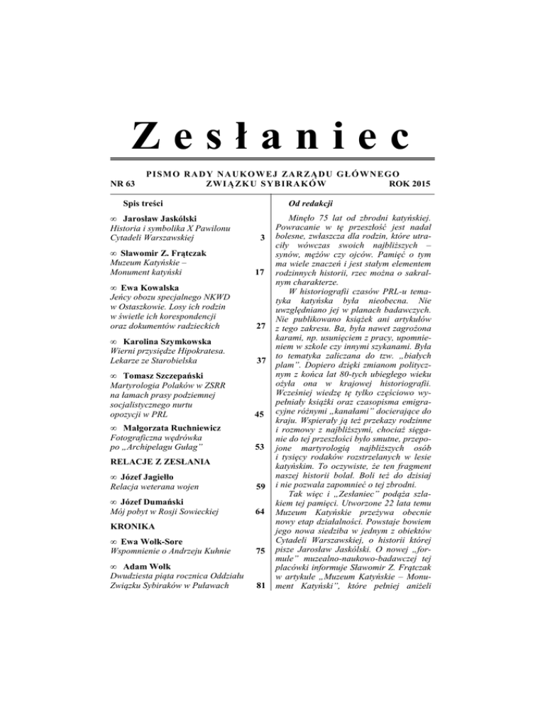 Zesłaniec NR 63 P I SM O RA DY NA UK O W EJ ZA R ZĄ DU G Ł Ó WN E GO ZWI Ą ZK U S YB IR AK Ó W ROK 2015 Spis treści • Jarosław Jaskólski Historia i symbolika X Pawilonu Cytadeli Warszawskiej Od redakcji 3 • Sławomir Z. Frątczak Muzeum Katyńskie – Monument katyński 17 • Ewa Kowalska Jeńcy obozu specjalnego NKWD w Ostaszkowie. Losy ich rodzin w świetle ich korespondencji oraz dokumentów radzieckich 27 • Karolina Szymkowska Wierni przysiędze Hipokratesa. Lekarze ze Starobielska 37 • Tomasz Szczepański Martyrologia Polaków w ZSRR na łamach prasy podziemnej socjalistycznego nurtu opozycji w PRL 45 • Małgorzata Ruchniewicz Fotograficzna wędrówka po „Archipelagu Gułag” 53 RELACJE Z ZESŁANIA • Józef Jagiełło Relacja weterana wojen 59 • Józef Dumański Mój pobyt w Rosji Sowieckiej 64 KRONIKA • Ewa Wołk-Sore Wspomnienie o Andrzeju Kuhnie 75 • Adam Wołk Dwudziesta piąta rocznica Oddziału Związku Sybiraków w Puławach 81 Minęło 75 lat od zbrodni katyńskiej. Powracanie w tę przeszłość jest nadal bolesne, zwłaszcza dla rodzin, które utraciły wówczas swoich najbliższych – synów, mężów czy ojców. Pamięć o tym ma wiele znaczeń i jest stałym elementem rodzinnych historii, rzec można o sakralnym charakterze. W historiografii czasów PRL-u tematyka katyńska była nieobecna. Nie uwzględniano jej w planach badawczych. Nie publikowano książek ani artykułów z tego zakresu. Ba, była nawet zagrożona karami, np. usunięciem z pracy, upomnieniem w szkole czy innymi szykanami. Była to tematyka zaliczana do tzw. „białych plam”. Dopiero dzięki zmianom politycznym z końca lat 80-tych ubiegłego wieku ożyła ona w krajowej historiografii. Wcześniej wiedzę tę tylko częściowo wypełniały książki oraz czasopisma emigracyjne różnymi „kanałami” docierające do kraju. Wspierały ją też przekazy rodzinne i rozmowy z najbliższymi, chociaż sięganie do tej przeszłości było smutne, przepojone martyrologią najbliższych osób i tysięcy rodaków rozstrzelanych w lesie katyńskim. To oczywiste, że ten fragment naszej historii bolał. Boli też do dzisiaj i nie pozwala zapomnieć o tej zbrodni. Tak więc i „Zesłaniec” podąża szlakiem tej pamięci. Utworzone 22 lata temu Muzeum Katyńskie przeżywa obecnie nowy etap działalności. Powstaje bowiem jego nowa siedziba w jednym z obiektów Cytadeli Warszawskiej, o historii której pisze Jarosław Jaskólski. O nowej „formule” muzealno-naukowo-badawczej tej placówki informuje Sławomir Z. Frątczak w artykule „Muzeum Katyńskie – Monument Katyński”, które pełniej aniżeli • Anna Kubajak V edycja konkursu historycznego w województwie śląskim 84 REGAŁ Z KSIĄŻKAMI • Ewa Kowalska, Młyny czasu. Jan Boroń, od Orzechówki do Starobielska, Warszawa 2014 (Małgorzata Dziura) 89 • Poliaki w Sibiri: ot powstancew 1863 g. do sowremiennoj Polonii. Kollektiwnaja naucznaja monografija, Krasnojarsk 2014 (Anna Milewska-Młynik) 91 • Anna Hejczyk, Sybiracy pod Kilimandżaro. Tangeru. Polskie osiedle w Afryce Wschodniej we wspomnieniach jego mieszkańców, Rzeszów – Kraków 2013 (Adam Cz. Dobroński) 95 Na okładce: Matka Boska Katyńska. Obraz olejny namalowany przez syna Sybiraka (Stargard Szczeciński). Rep. z: Księga Sybiraków 1928-1988-1998-2000, Warszawa 2001 (s. I); widok na Bramę Nowomiejską – wejście do Muzeum Katyńskiego (s. IV). Zeszyt opublikowany dzięki dotacji Rady Ochrony Pamięci Walk i Męczeństwa Wydawca: Zarząd Główny Związku Sybiraków, ul. Mazowiecka 12 00-048 Warszawa, tel. 22/827 93 71 Redakcja: A. Cz. Dobroński, A. Dzienkiewicz, W. Krawczyński, A. Kuczyński (red. nacz.), A. MilewskaMłynik, P. Zworski Sekretarz redakcji: M. B. Kuczyńska Wykonawca: Skład, druk i oprawa – QUAESTIO Przemysław Włodarczyk, ul. Paczkowska 26; 50-503 Wrocław Copyright nazwy „Zesłaniec” by A. Kuczyński Adres redakcji: ul. Bystrzycka 61/3 54-215 Wrocław, tel. 71/351 10 94 dotychczas będzie prowadziło działalność naukową, upowszechnieniową i konserwatorską, udostępniając zbiory rodzinom ofiar, szerokim rzeszom odwiedzających oraz historykom zajmującym się zbrodnią katyńską. Dopełnieniem tej problematyki są artykuły o tematyce katyńskiej, które stanowią ważny dokument dotyczący jeńców obozu w Ostaszkowie i losów ich rodzin oraz lekarzy ze Starobielska. Muzeum zależy na poszerzeniu informacji i zasobów związanych z ofiarami tej zbrodni. W tej nowej odsłonie Muzeum Katyńskie na wiele lat ulokuje się w przestrzeni publicznej i zyska szerokie rzesze wiernych odbiorców. Dlatego redakcja zwraca się do Czytelników „Zesłańca” z apelem o przekazywanie pamiątek i archiwaliów z tego zakresu a także wszelkich materiałów związanych z problematyką walki o prawdę Katynia oraz tragedii smoleńskiej. Zakres tematyczny tego „Zesłańca” dotyczy przede wszystkim zbrodni katyńskiej. Tradycyjnie już dopełniają go relacje z zesłania poprzez które docierają nowe prawdy o zesłańczych losach, wprowadzające Czytelników w złożony świat wojennych doświadczeń ich autorów oraz krętą drogę „ku wolności”. Staramy się nadrabiać opóźnienia z tego zakresu, udostępniając łamy kwartalnika osobistym doświadczeniom doznanym w sowieckim „domu niewoli”. Tego dotyczy również omówienie albumu pt. „Archipelag Gułag”, autorstwa Tomasza Kiznego oraz książek z zakresu dziejów Polaków na zesłaniu, ubogacających pamięć o związkach polsko-syberyjskich. Kończymy tę prezentację podziękowaniem dla Rady Ochrony Pamięci Walk i Męczeństwa, która wspiera ukazywanie się naszego kwartalnika, zapraszamy Autorów do dalszej współpracy, a Czytelnikom dziękujemy za niesłabnące zainteresowanie „Zesłańcem” Wiesław Krawczyński Przewodniczący Rady Naukowej . Zarządu Głównego Związku Sybiraków