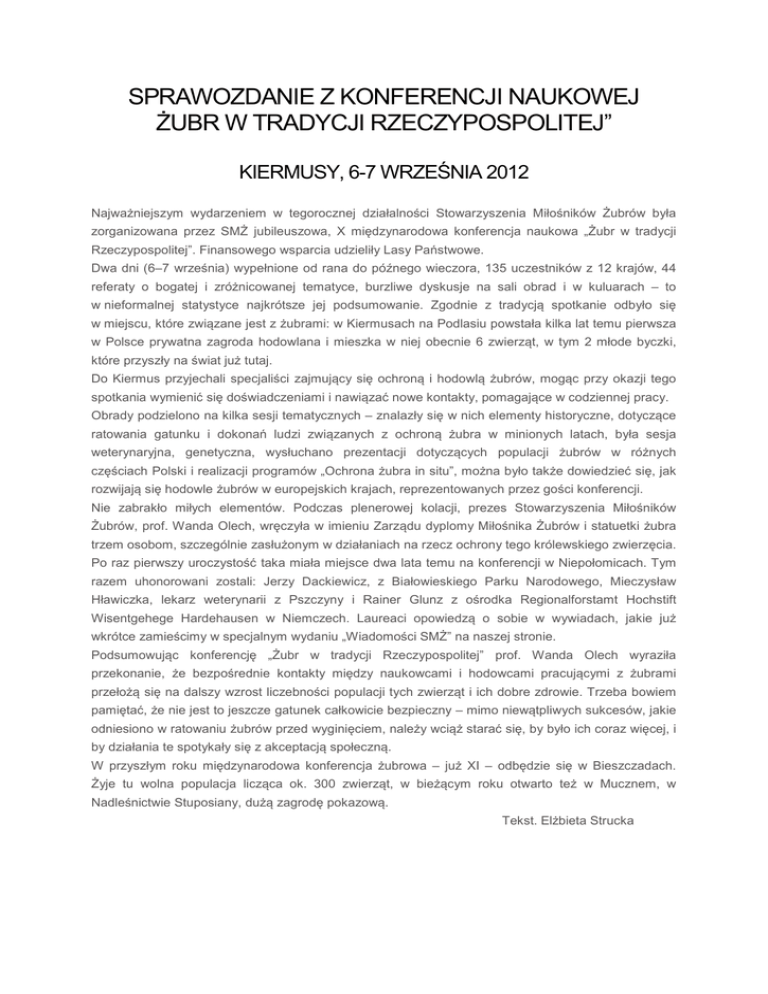 SPRAWOZDANIE Z KONFERENCJI NAUKOWEJ ŻUBR W TRADYCJI RZECZYPOSPOLITEJ” KIERMUSY, 6-7 WRZEŚNIA 2012 Najważniejszym wydarzeniem w tegorocznej działalności Stowarzyszenia Miłośników Żubrów była zorganizowana przez SMŻ jubileuszowa, X międzynarodowa konferencja naukowa „Żubr w tradycji Rzeczypospolitej”. Finansowego wsparcia udzieliły Lasy Państwowe. Dwa dni (6–7 września) wypełnione od rana do późnego wieczora, 135 uczestników z 12 krajów, 44 referaty o bogatej i zróżnicowanej tematyce, burzliwe dyskusje na sali obrad i w kuluarach – to w nieformalnej statystyce najkrótsze jej podsumowanie. Zgodnie z tradycją spotkanie odbyło się w miejscu, które związane jest z żubrami: w Kiermusach na Podlasiu powstała kilka lat temu pierwsza w Polsce prywatna zagroda hodowlana i mieszka w niej obecnie 6 zwierząt, w tym 2 młode byczki, które przyszły na świat już tutaj. Do Kiermus przyjechali specjaliści zajmujący się ochroną i hodowlą żubrów, mogąc przy okazji tego spotkania wymienić się doświadczeniami i nawiązać nowe kontakty, pomagające w codziennej pracy. Obrady podzielono na kilka sesji tematycznych – znalazły się w nich elementy historyczne, dotyczące ratowania gatunku i dokonań ludzi związanych z ochroną żubra w minionych latach, była sesja weterynaryjna, genetyczna, wysłuchano prezentacji dotyczących populacji żubrów w różnych częściach Polski i realizacji programów „Ochrona żubra in situ”, można było także dowiedzieć się, jak rozwijają się hodowle żubrów w europejskich krajach, reprezentowanych przez gości konferencji. Nie zabrakło miłych elementów. Podczas plenerowej kolacji, prezes Stowarzyszenia Miłośników Żubrów, prof. Wanda Olech, wręczyła w imieniu Zarządu dyplomy Miłośnika Żubrów i statuetki żubra trzem osobom, szczególnie zasłużonym w działaniach na rzecz ochrony tego królewskiego zwierzęcia. Po raz pierwszy uroczystość taka miała miejsce dwa lata temu na konferencji w Niepołomicach. Tym razem uhonorowani zostali: Jerzy Dackiewicz, z Białowieskiego Parku Narodowego, Mieczysław Hławiczka, lekarz weterynarii z Pszczyny i Rainer Glunz z ośrodka Regionalforstamt Hochstift Wisentgehege Hardehausen w Niemczech. Laureaci opowiedzą o sobie w wywiadach, jakie już wkrótce zamieścimy w specjalnym wydaniu „Wiadomości SMŻ” na naszej stronie. Podsumowując konferencję „Żubr w tradycji Rzeczypospolitej” prof. Wanda Olech wyraziła przekonanie, że bezpośrednie kontakty między naukowcami i hodowcami pracującymi z żubrami przełożą się na dalszy wzrost liczebności populacji tych zwierząt i ich dobre zdrowie. Trzeba bowiem pamiętać, że nie jest to jeszcze gatunek całkowicie bezpieczny – mimo niewątpliwych sukcesów, jakie odniesiono w ratowaniu żubrów przed wyginięciem, należy wciąż starać się, by było ich coraz więcej, i by działania te spotykały się z akceptacją społeczną. W przyszłym roku międzynarodowa konferencja żubrowa – już XI – odbędzie się w Bieszczadach. Żyje tu wolna populacja licząca ok. 300 zwierząt, w bieżącym roku otwarto też w Mucznem, w Nadleśnictwie Stuposiany, dużą zagrodę pokazową. Tekst. Elżbieta Strucka