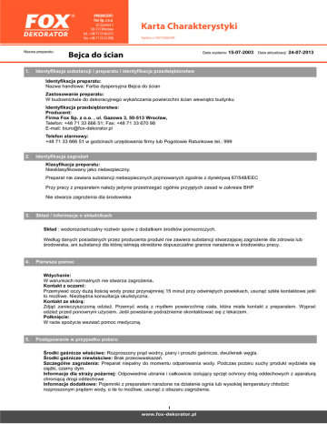 Nazwa preparatu: 1. Bejca do ścian Data wydania: 15-07-2003 Data aktualizacji: 24-07-2013 Identyfikacja substancji / preparatu i identyfikacja przedsiębiorstwa Identyfikacja preparatu: Nazwa handlowa: Farba dyspersyjna Bejca do ścian Zastosowanie preparatu: W budownictwie do dekoracyjnego wykańczania powierzchni ścian wewnątrz budynku Identyfikacja przedsiębiorstwa: Producent: Firma Fox Sp. z o.o. , ul. Gazowa 3, 50-513 Wrocław, Telefon: +48 71 33 666 51; Fax: +48 71 33 670 98 E-mail: [email protected] Telefon alarmowy: +48 71 33 666 51 w godzinach urzędowania firmy lub Pogotowie Ratunkowe tel.: 999 2. Identyfikacja zagrożeń Klasyfikacja preparatu: Niesklasyfikowany jako niebezpieczny. Preparat nie zawiera substancji niebezpiecznych pojmowanych zgodnie z dyrektywą 67/548/EEC Przy pracy z preparatem należy jedynie przestrzegać ogólnie przyjętych zasad w zakresie BHP Nie stwarza zagrożenia dla środowiska 3. Skład / informacja o składnikach Skład : wodorozcieńczalny roztwór spoiw z dodatkiem środków pomocniczych. Według danych posiadanych przez producenta produkt nie zawiera substancji stwarzającej zagrożenie dla zdrowia lub środowiska, ani substancji dla której istnieją określone dopuszczalne granice narażenia w środowisku pracy. 4. Pierwsza pomoc Wdychanie: W warunkach normalnych nie stwarza zagrożenia. Kontakt z oczami: Przemywać oczy dużą ilością wody przez przynajmniej 15 minut przy odwiniętych powiekach, usunąć szkła kontaktowe jeśli to możliwe. Niezbędna konsultacja okulistyczna. Kontakt ze skórą: Zdjąć zanieczyszczoną odzież. Przemyć wodą z mydłem powierzchnię ciała, która miała kontakt z preparatem. Wyprać odzież przed ponownym użyciem. Jeśli powstanie podrażnienie skontaktować się z lekarzem. Połknięcie: W razie spożycia wezwać pomoc medyczną. 5. Postępowanie w przypadku pożaru Środki gaśnicze właściwe: Rozproszony prąd wodny, piany i proszki gaśnicze, dwutlenek węgla. Środki gaśnicze niewłaściwe: Brak przeciwwskazań. Szczególne zagrożenia: Preparat niepalny do momentu odparowania wody. Podczas pożaru suchy produkt wydziela się ciężki, czarny dym. Informacje dla straży pożarnej: Odpowiednie ubranie i całkowicie izolujący sprzęt ochrony dróg oddechowych z aparaturą chroniącą drogi oddechowe . Informacje dodatkowe: Pojemniki z preparatem narażone na działanie ognia lub wysokiej temperatury chłodzić rozproszonym prądem wody, o ile to możliwe, usunąć z obszaru zagrożenia. 1 6. Postępowanie w przypadku niezamierzonego uwolnienia do środowiska Indywidualne środki ostrożności: Unikać bezpośredniego kontaktu i zachować ostrożność – w razie wyschnięcia na skórze, preparat trudny do usunięcia. Unikać rozlania – ze względu na właściwości fizykochemiczne powoduje śliskość nawierzchni. Środki ostrożności w zakresie ochrony środowiska: Zapobiec rozprzestrzenianiu się i dostaniu preparatu do gruntu, wód powierzchniowych, gruntowych i do kanalizacji. W trakcie akcji ratowniczej używać ubrania ochronnego, rękawic i okularów ochronnych. Przy powstawaniu mgieł z rozpylonego preparatu stosować maskę ochronną z filtrem. Metody oczyszczania/usuwania: Zebrać wyciek do odpowiednich pojemników w celu utylizacji lub powtórnego przetworzenia (patrz punkt 13.). Zanieczyszczone przedmioty i powierzchnie umyć natychmiast ciepłą wodą. 7. Postępowanie z substancją / preparatem oraz jej magazynowanie Postępowanie z preparatem: Postępować zgodnie z ogólnie przyjętymi zasadami bezpieczeństwa i higieny pracy. Unikać bezpośredniego kontaktu, stosować sprzęt ochrony osobistej. Magazynowanie: Przechowywać w zamkniętych opakowaniach, w pomieszczeniach chroniących przed wpływami atmosferycznymi, najlepiej w temperaturze +5 do +20ºC. Chronić przed mrozem i ekspozycją na wysokie temperatury (powyżej +40 ºC). Zapewnić dobrą wentylację. Specyficzne zastosowania: Nie dotyczy. 8. Kontrola narażenia / środki ochrony indywidualnej Produkt nie zawiera składników, dla których określona została konieczność monitorowania ich najwyższych dopuszczalnych stężeń w środowisku pracy. Zgodnie z Rozporządzenia Ministra Pracy i Polityki Społecznej z dnia 29 listopada 2002 w sprawie najwyższych dopuszczalnych stężeń i natężeń czynników szkodliwych dla zdrowa w środowisku pracy (Dz.U.02.217.1833, wraz ze zmianami). Kontrola narażenia: Ogólne zasady bezpieczeństwa i higieny pracy: Postępować zgodnie z zasadami higieny pracy stosując odpowiednie środki ochrony indywidualnej takie jak rękawice, fartuch. Nie jeść, nie palić podczas pracy z produktem. Myć ręce i twarz po zakończeniu pracy z produktem. Kontrola narażenia w miejscu pracy: Wentylacja: wentylacja ogólna pomieszczenia. Ochrona dróg oddechowych: nie jest wymagana w normalnych warunkach ruchowych. Stosować maskę z filtrem przy powstawaniu mgieł z rozpylonego preparatu. Ochrona rąk: wymagana - rękawice gumowe lub z tworzywa sztucznego. Ochrona oczu: wymagana – szczelne okulary ochronne w przypadku możliwości bezpośredniego kontaktu. Ochrona ciała: wymagana - ubranie ochronne ze zwartej tkaniny, fartuch ochronny. Kontrola narażenia środowiska: Zabezpieczyć przed dostaniem się do miejskiego systemu wodno-kanalizacyjnego i cieków wodnych. Inne informacje punkt 12 karty. 2 9. Właściwości fizyczne i chemiczne Postać ciecz Zapach nieznaczny Kolor transparentna pH 7- Gęstość 1,0-1,05 g/cm³ Temperatura wrzenia Brak danych Temperatura topnienia Brak danych Temperatura zapłonu Brak danych Temperatura samozapłonu Brak danych Rozpuszczalność w wodzie Miesza się z wodą Rozpuszczalność w innych rozpuszczalnikach Brak danych Właściwości wybuchowe Brak danych 10. Stabilność i reaktywność W normalnych warunkach preparat stabilny. Ulega zmianom przy dostępie powietrza. Warunki, których należy unikać: W czasie magazynowania unikać temperatur poni