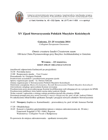 XV Zjazd Stowarzyszenia Polskich Muzyków Kościelnych Gniezno, 23–25 września 2014 Collegium Europaeum Gnesnense Omnis creatura laudet Creatorem suum 100-lecie Chóru Prymasowskiego przy Bazylice Archikatedralnej w Gnieźnie WTOREK – 23 WRZEŚNIA DZIEŃ SPRAW ORGANIZACYJNYCH (możliwość odprawienia Eucharystii po przyjeździe) 14.30 Powitalna kawa 15.00 Rozpoczęcie zjazdu – Veni Creator Prowadzenie: ks. Grzegorz Poźniak Pozdrowienie uczestników i przedstawienie programu zjazdu Sprawy organizacyjne zjazdu – ks. Dariusz Sobczak Zmiany organizacyjne w Stowarzyszeniu Polskich Muzyków Kościelnych Omówienie czasopisma Musica Ecclesiastica. Rocznik Stowarzyszenia Polskich Muzyków Kościelnych Zatwierdzenie zaległego sprawozdania Komisji rewizyjnej Przedstawienie przez przewodniczącego Komisji kwalifikacyjnej osób ubiegających się o przyjęcie do SPMK Przedstawienie publikacji, które będzie można nabyć podczas Zjazdu Wolne wnioski i ogłoszenia o różnego rodzaju przedsięwzięciach dla członków SPMK Prezentacja postępu prac przy nowej Instrukcji o muzyce liturgicznej (ks. prof. dr hab. Andrzej Filaber) Po zakończeniu obrad krótkie spotkanie Zarządu i przyjęcie nowych członków Stowarzyszenia 16.45 Nieszpory (kaplica ss. Karmelitanek) – przewodniczy ks. prof. dr hab. Ireneusz Pawlak 17.20 Obiadokolacja 18.45 Koncert w katedrze gnieźnieńskiej (pieszo z miejsca zakwaterowania ok. 30 min.) Franciszek Ścigalski (1782–1846), Requiem Wykonawcy: Collegium Vocale z Bydgoszczy Po powrocie do miejsca zakwaterowania – spotkanie towarzyskie ŚRODA – 24 WRZEŚNIA KONFERENCJA NAUKOWA Twórca muzyki wobec tajemnicy powołania artysty 8.30 Jutrznia (kaplica ss. Karmelitanek) – przewodniczy ks. prof. dr hab. Andrzej Zając 9.00 Śniadanie 9.30 – I Sesja – prowadzenie: prof. UO i UWr dr hab. Remigiusz Pośpiech (Wrocław – Opole) 9.30 Wykład – ks. prof. dr hab. Ireneusz Pawlak, Chóry kościelne wobec „ducha czasu” 10.00 Wykład – ks. prof. dr hab. Jacek Bramorski, Muzyk kościelny jako świadek piękna wiary 10.30 Wykład – prof. UKSW dr hab. Czesław Grajewski, Audivi vocem tuam. Słowo, głos i słuch w refleksji nad służbą muzyka kościelnego 11.00 Kawa 11.30 – II sesja – prowadzenie: ks. dr hab. Robert Bernagiewicz 11.30 Wykład – ks. dr hab. Piotr Wiśniewski, Chór Archikatedry Gnieźnieńskiej od momentu powstania (1914) do zakończenia Soboru Watykańskiego II (1965) 11.50 Wykład – ks. prof. UPH dr hab. ks. Michał Szulik, Możliwości i zasady uczestnictwa chóru w liturgii 12.10 Wykład – dr Beata Bodzioch, Polskie pieśni nabożne w kancjonałach kościelnych 12.30 Wykład – prof. dr hab. Roman Grucza, Artystyczna i wychowawcza równowaga indywidualności dyrygenta z zespołem chóralnym na przykładzie Katedralnego Chóru ChłopięcoMęskiego „Pueri Cantores Thorunienses” 13.15 Obiad 14.30 – III sesja muzykologiczna prawodawstwa muzyczno-liturgicznego Prowadzenie: prof. UKSW dr hab. Czesław Grajewski Prowadzenie: ks. prof. dr hab. Antoni Reginek 14.30 Wykład – s. Benigna M. Tkocz, Formacja i posłannictwo liturgiczno-muzyczne Sióstr Służebniczek NMP w nauczaniu bł. Edmunda Bojanowskiego 14.50 Wykład – dr Jarosław Jasiura Złożoność problematyki prowadzenia liturgicznych zespołów dziecięcych 15.10 Wykład – dr Michał Sławecki Interpretacja śpiewu gregoriańskiego w semiologicznej optyce 15.30 Wykład – dr hab. Aleksandra GruczaRogalska Problem liturgiczności śpiewów chóralnych kompozytorów polskich przełomy XX i XXI w. Nowy śpiewnik liturgiczny dla diecezji Kościoła w Polsce Wykłady wprowadzające ks. dr J. Waloszek – doświadczenie redakcji Drogi do nieba ks. dr W. Kałamarz – doświadczenie redakcji Śpiewnika ks. Siedleckiego ks. mgr P. Dębski – przygotowanie nowego wydania śpiewnika liturgicznego – zaprogramowanie działań komisji 16.15 Podwieczorek (kanapki, herbata i kawa) 18.00 Msza Święta w katedrze – przewodniczy Arcybiskup Prymas Wręczenie I medalu Per musicam ad fidem 19.30 Wieczór towarzyski – kolacja CZWARTEK – 25 WRZEŚNIA DZIEŃ SPOTKANIA Z GOŚĆMI SPMK 7.30 8.30 Msza Święta – przewodniczy Biskup Legnicki Stefan Cichy Śniadanie Sesja – Prowadzenie: ks. dr hab. Grzegorz Poźniak 9.00 Bp Stefan Cichy Prace prowadzone przez Podkomisję ds. Muzyki Kościelnej 9.20 Bp Adam Bałabuch Prace prowadzone przez Komisję ds. Kultu Bożego i Dyscypliny Sakramentów z uwzględnieniem elementów związanych z muzyką kościelną 9.45 Prof. Stefan Baier (Rektor HfKM, Ratyzbona/Regensburg) Kulturowe i historyczne dziedzictwo oraz proces kształcenia w najstarszej w świecie szkole muzyki kościelnej w Ratyzbonie (tłumaczenie ks. dr Piotr Tarlinski) Możliwość wymiany myśli z prof. Stefanem Baierem 11.00 Red. Krzysztof Skowroński Jak są zorganizowane polskie media? 11.20 Dyskusja 12.00 – Obiad i zakończenie zjazdu Miejsce spotkania: Collegium Europaeum Gnesnense ul. Kostrzewskiego 5 62-210 Gniezno Organizator: ks. Dariusz Sobczak (tel. 691 030 513) Opłata za zjazd, w tym koszt pobytu: 250 zł (wszystkie pokoje jednoosobowe) Uprzejmie prosimy wpłacić ją na konto Stowarzyszenia: Bank Pekao S. A. I Oddział w Opolu ul. Osmańczyka 15 45-027 Opole Nr konta 16 1240 1633 1111 0000 2652 1752 z dopiskiem: Zjazd 2014. Zgłoszenia indywidualne (e-mailowe) do dnia 31 sierpnia br. prosimy kierować na adres elektroniczny sekretariatu SPMK: [email protected] Sekretarz SPMK Prezes SPMK