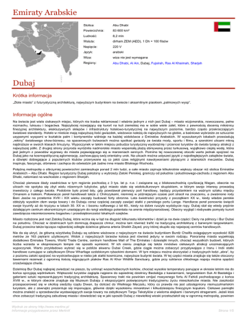 Emiraty Arabskie Stolica: Abu Dhabi Powierzchnia: 83 600 km² Ludność: 8,2 mln Waluta: dirham ZEM (AED), 1 Dh = 100 filsów Napięcie: 220 V Język: arabski Wiza: wiza nie jest wymagana Regiony: Abu Dhabi, Al Ain, Dubaj, Fujairah, Ras Al Khaimah, Sharjah Dubaj Krótka informacja „Złote miasto” z futurystyczną architekturą, najwyższym budynkiem na świecie i aksamitnym piaskiem „palmowych wysp”. Informacje ogólne Na świecie jest wiele ciekawych miejsc, których nie trzeba reklamować i właśnie jednym z nich jest Dubaj – miasto wizjonerskie, nowoczesne, pełne rozmachu, luksusu i bogactwa. Najszybciej rozwijający się kurort na kuli ziemskiej ma w sobie wiele zalet, które z pewnością docenią miłośnicy finezyjnej architektury, ekskluzywnych sklepów i infrastruktury hotelowo-turystycznej na najwyższym poziomie, bardzo często przekraczającym światowe standardy. Hotele w mieście mają najwyższą ilość gwiazdek, wieżowce należą do najwyższych na globie, a baśniowe wybrzeże ze sztucznie usypanymi wyspami w kształcie palm i kontynentów widnieje na każdej widokówce z Emiratów Arabskich. W wyszukanych lokalach przesiadują „rekiny” światowego show-biznesu, na spacerowych bulwarach można spotkać gwiazdy ze świata mody, sportu i filmu, a szerokimi ulicami mkną najdroższe w swoich klasach limuzyny. Wypoczynek w takim miejscu pobudza turystyczną wyobraźnię i przenosi turystów do świata tysięcy atrakcji z najwyższej półki. Z drugiej strony przyroda wyróżniła nadmorskie miasto wspaniałą plażą obmywaną przez turkusową, wyjątkowo ciepłą wodę, która jest jednym z powodów wyprawy do miasta pojawiającego się w marzeniach sennych. Pomimo tej nowoczesnej otoczki warto jednak spojrzeć na Dubaj jako na kosmopolityczną aglomerację, zachowującą swój orientalny urok. Na ulicach można usłyszeć języki z najodleglejszych zakątków świata, a dźwięki dobiegające z popularnych klubów przerywane są co jakiś czas religijnymi nawoływaniami płynącymi z islamskich meczetów. Dubaj inspiruje, fascynuje, olśniewa i zachęca do odwiedzin jak żadne inne miasto Bliskiego Wschodu. Potężną metropolię o olbrzymiej powierzchni zamieszkuje ponad 2 mln ludzi, a całe miasto zajmuje kilkukrotnie większy obszar niż stolica Emiratów Arabskich – Abu Dhabi. Region turystyczny Dubaj położony u wybrzeży Zatoki Perskiej, graniczy od południa i południowego-zachodu z regionem Abu Dhabi, natomiast na wschodzie z regionem Sharjah. Chociaż pierwsze ślady osadnictwa w tym regionie pochodzą z 3 tys. lat p. n.e. i związane są z bliskowschodnią cywilizacją Magan, obecnie na ulicach nie spotyka się zbyt wielu rdzennych tubylców, gdyż miasto stało się wielokulturowym skupiskiem, w którym swoje interesy prowadzą inwestorzy z całego świata. Podobnie było przed laty, gdy powstawał pierwszy port handlowy, będący przystankiem na ważnym szlaku między Omanem a Irakiem. Poławiacze pereł handlowali także z Chińczykami, niemniej w późniejszym czasie port stracił na znaczeniu, a zwaśnione rody Bani Jasów na przełomie XVIII i XIX wieku zaczęły budować forty obronne. Lata świetności przyszły z początkiem XX w., kiedy władze perskie obłożyły wysokim cłem swoje towary i do Dubaju coraz częściej zaczęły zawijać statki z perskiego portu Lenge. Handlarze pereł ponownie święcili swoje tryumfy aż do kryzysu w latach 30. XX w. i boomu naftowego z lat 60., kiedy na dobre ruszyło wydobycie ropy. Dubaj stał się wtedy prężnie działającym centrum ekonomicznym urastającym do rangi wielkiego potentata na arenie międzynarodowej. Obecny wygląd i niebywałe pomysły kurort zawdzięcza niezmierzonemu bogactwu i przedsiębiorczości lokalnych szejków. Miasto rozłożone jest nad Zatoką Dubaj, która wcina się w ląd na długość kilkunastu kilometrów i dzieli je na dwie części: Deiry na północy i Bur Dubai na południu. Chociaż w dzielnicach tych dominują drapacze chmur, można tam również trafić na tradycyjną architekturę z barwnymi targowiskami. Dubaj przecina także łącząca najbardziej odległe dzielnice główna arteria Sheikh Zayed, przy której skupiło się najwięcej centrów handlowych. Nie da się ukryć, że główną wizytówką Dubaju są szklane wieżowce z najwyższym na świecie budynkiem Burdż Chalifa osiągającym wysokość 828 metrów ze 163 piętrami użytkowymi. Widok z najwyższych tarasów kolosa jest również jedyny w swoim rodzaju. Panoramę miasta wypełniają dodatkowo Emirates Towers, World Trade Centre, centrum handlowe Mall of The Emirates i dziesiątki innych, chociaż wszystkich budowli, których liczba wzrasta w ekspresowym tempie nie sposób wymienić. W ich cieniu znajduje się także mnóstwo ciekawych atrakcji urozmaicających wypoczynek. Warto przykładowo wybrać się w pobliże akwenu Dubai Creek, gdzie ciągle można zobaczyć przypływające z Iranu i Indii statki handlowe cumujące w zabytkowym Dhow Wharfage ozdobionym rybackimi domami. W tym miejscu można skorzystać z tradycyjnych łodzi „abra”, by z poziomu zatoki spojrzeć na wystrzeliwujące w niebo jak statki kosmiczne, najwyższe budynki świata. W tej części miasta znajduje się także otoczony tawernami rezerwat z ogromną ilością migrujących ptaków Ras Al Khor Wildlife Sanctuary, gdzie przy szklance chłodnego napoju można spędzić orzeźwiające chwile. Dzielnicę Bur Dubaj najlepiej zwiedzać na pieszo, by uniknąć wszechobecnych korków, chociaż wysokie temperatury panujące w okresie letnim nie do końca sprzyjają wędrówkom. Większość turystów zagląda najpierw do sąsiedniej dzielnicy Bastakijja z kawiarniami, targowiskiem Suk Al Bastakijja i galeriami sztuki reprezentującymi tradycyjną architekturę. Spacerowy trakt nie powinien omijać masywnego fortu Al Fahidi pochodzącego z końca XVIII w., w którym obecnie znajduje się Muzeum Dubaju z ekspozycjami 