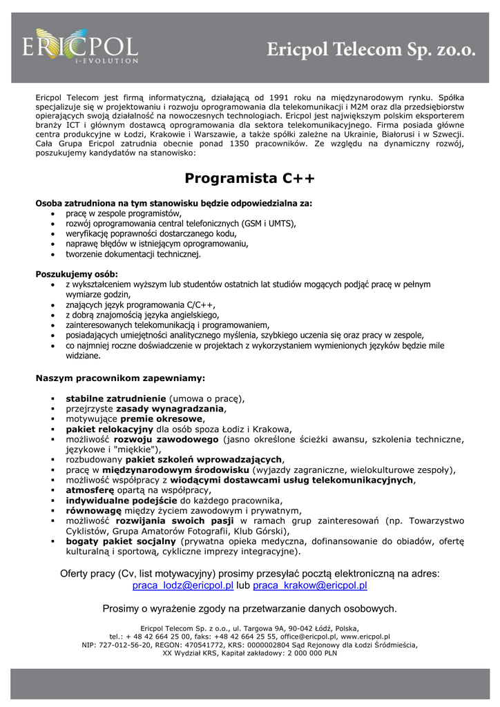 Ericpol Telecom jest firmą informatyczną, działającą od 1991 roku na międzynarodowym rynku. Spółka specjalizuje się w projektowaniu i rozwoju oprogramowania dla telekomunikacji i M2M oraz dla przedsiębiorstw opierających swoją działalność na nowoczesnych technologiach. Ericpol jest największym polskim eksporterem branży ICT i głównym dostawcą oprogramowania dla sektora telekomunikacyjnego. Firma posiada główne centra produkcyjne w Łodzi, Krakowie i Warszawie, a także spółki zależne na Ukrainie, Białorusi i w Szwecji. Cała Grupa Ericpol zatrudnia obecnie ponad 1350 pracowników. Ze względu na dynamiczny rozwój, poszukujemy kandydatów na stanowisko: Programista C++ Osoba zatrudniona na tym stanowisku będzie odpowiedzialna za: pracę w zespole programistów, rozwój oprogramowania central telefonicznych (GSM i UMTS), weryfikację poprawności dostarczanego kodu, naprawę błędów w istniejącym oprogramowaniu, tworzenie dokumentacji technicznej. Poszukujemy osób: z wykształceniem wyższym lub studentów ostatnich lat studiów mogących podjąć pracę w pełnym wymiarze godzin, znających język programowania C/C++, z dobrą znajomością języka angielskiego, zainteresowanych telekomunikacją i programowaniem, posiadających umiejętności analitycznego myślenia, szybkiego uczenia się oraz pracy w zespole, co najmniej roczne doświadczenie w projektach z wykorzystaniem wymienionych języków będzie mile widziane. Naszym pracownikom zapewniamy: stabilne zatrudnienie (umowa o pracę), przejrzyste zasady wynagradzania, motywujące premie okresowe, pakiet relokacyjny dla osób spoza Łodiz i Krakowa, możliwość rozwoju zawodowego (jasno określone ścieżki awansu, szkolenia techniczne, językowe i "miękkie"), rozbudowany pakiet szkoleń wprowadzających, pracę w międzynarodowym środowisku (wyjazdy zagraniczne, wielokulturowe zespoły), możliwość współpracy z wiodącymi dostawcami usług telekomunikacyjnych, atmosferę opartą na współpracy, indywidualne podejście do każdego pracownika, równowagę między życiem zawodowym i prywatnym, możliwość rozwijania swoich pasji w ramach grup zainteresowań (np. Towarzystwo Cyklistów, Grupa Amatorów Fotografii, Klub Górski), bogaty pakiet socjalny (prywatna opieka medyczna, dofinansowanie do obiadów, ofertę kulturalną i sportową, cykliczne imprezy integracyjne). Oferty pracy (Cv, list motywacyjny) prosimy przesyłać pocztą elektroniczną na adres: [email protected] lub [email protected] Prosimy o wyrażenie zgody na przetwarzanie danych osobowych. Ericpol Telecom Sp. z o.o., ul. Targowa 9A, 90-042 Łódź, Polska, tel.: + 48 42 664 25 00, faks: +48 42 664 25 55, [email protected], www.ericpol.pl NIP: 727-012-56-20, REGON: 470541772, KRS: 0000002804 Sąd Rejonowy dla Łodzi Śródmieścia, XX Wydział KRS, Kapitał zakładowy: 2 000 000 PLN