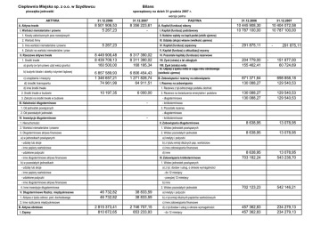 Ciepłownia Miejska sp. z o.o. w Szydłowcu Bilans pieczątka jednostki sporządzony na dzień 31 grudnia 2007 r. wersja pełna AKTYWA A. Aktywa trwałe I. Wartości niematerialne i prawne 31.12.2006 31.12.2007 8 501 906,53 5 267,23 8 356 223,61 - 1. Koszty zakończonych prac rozwojowych 1. Srodki trwałe a) grunty (w tym prawo uŜyt wiecz gruntu) b) budynki lokale i obiekty inŜynierii lądowej c) urządzenia i maszyny d) środki transportu IV. Kapitał (fundusz) zapasowy 8 449 906,48 8 439 709,13 160 500,00 8 317 390,02 8 311 390,02 168 195,34 6 857 589,93 1 346 657,21 74 961,99 6 806 454,43 1 271 828,74 64 911,51 10 197,35 6 000,00 - 1. Od jednostek powiązanych 2. Od pozostałych jednostek VII. Zysk (strata) z lat ubiegłych VIII. Zysk (strata) netto IX. Odpisy z zysku netto w ciągu roku obrotowego (wielkość ujemna) B. Zobowiązania i rezerwy na zobowiązania I. Rezerwy na zobowiązania - 151 877,00 60 724,69 871 371,64 130 088,27 698 858,18 129 540,53 2. Rezerwa na świadczenia emerytalne i podobne 130 088,27 130 088,27 129 540,53 129 540,53 8 638,95 13 078,95 8 638,95 13 078,95 8 638,95 703 182,24 13 078,95 543 238,70 702 123,23 542 146,21 457 362,83 457 362,83 234 279,13 234 279,13 - krótkoterminowa - długoterminowe - 1. Nieruchomości - krótkoterminowe II. Zobowiązania długoterminowe 2. Wartości niematerialne i prawne 1. Wobec jednostek powiązanych 3. Długoterminowe aktywa finansowe 2. Wobec pozostałych jednostek a) w jednostkach powiązanych a) kredyty i poŜyczki - udziały lub akcje b) z tytułu emisji dłuŜnych pap. wartościow. - inne papiery wartościowe c) inne zobowiązania finansowe - udzielone poŜyczki d) inne - inne długoterminowe aktywa finansowe III. Zobowiązania krótkoterminowe b) w pozostałych jednostkach 1. Wobec jednostek powiązanych - udziały lub akcje a) z tyt. dostaw i usług, o okresie wymagalności - inne papiery wartościowe - do 12 miesięcy - udzielone poŜyczki - powyŜej 12 miesięcy - inne długoterminowe aktywa finansowe b) inne 4. Inne inwestycje długoterminowe 2. Wobec pozostałych jednostek 46 732,82 46 732,82 38 833,59 38 833,59 2. Inne rozliczenia międzyokresowe I. Zapasy 204 779,00 155 462,41 291 875,11 3. Pozostałe rezerwy IV. Inwestycje długoterminowe B. Aktywa obrotowe - - VI. Pozostale kapitały (fundusze) rezerwowe - długoterminowa III. NaleŜności długoterminowe 1. Aktywa z tytułu odrocz. pod. dochodowego 291 875,11 1. Rezerwa z tyt.odrocznego podatku dochod. 3. Zaliczki na środki trwałe w budowie V. Długoterminowe Rozlicz. międzyokresowe - V. Kapitał (fundusz) z aktualizacji wyceny d) inne środki trwałe 2. Srodki trwałe w budowie 31.12.2007 10 404 072,58 10 787 100,00 III. Udziały (akcje) własne (wielkość ujemna) 5 267,23 4. Zaliczki na wartości niematerialne i praw II. Rzeczowe aktywa trwałe I. Kapitał (fundusz) podstawowy 31.12.2006 10 445 908,30 10 787 100,00 II. NaleŜne wpłaty na kapit.podst.(wielk ujemna) 2. Wartość firmy 3. Inne wartości niematerialne i prawne PASYWA A. Kapitał (fundusz) własny a) kredyty i poŜyczki b) z tyt.emisji dłuŜnych papierów wartościowych c) inne zobowiązania finansowe 2 815 373,41 810 672,65 2 746 707,15 653 233,93 d) z tyt.dostaw i usług o okresie wymagalności: - do 12 miesięcy 1. Materiały 810 672,65 653 233,93 - powyŜej 12 miesięcy 2. Półprodukty i produkty w toku e) zaliczki otrzymane na dostawy 3. Produkty gotowe f) zobowiązania wekslowe 4. Towary g) z tyt.podatków, ceł, ubezp. i innych świadczeń 5. Zaliczki na dostawy II. NaleŜności krótkoterminowe h) z tytułu wynagrodzeń 1 239 779,67 1 126 004,39 1. NaleŜności od jednostek powiązanych i) inne 3. Fundusze specjalne a) z tytułu dostaw i usług o okresie spłaty: IV. Rozliczenia międzyokresowe - do 12 miesięcy 1. Ujemna wartość firmy - powyŜej 12 miesięcy 2. Inne rozliczenia międzyokresowe b) inne 2. NaleŜności od pozostałych jednostek a) z tytułu dostaw i usług o okresie spłaty: - do 12 miesięcy - powyŜej 12 miesięcy b) z tytułu podatków, dotacji,ceł, ubezp. Społ. i zdrowotnych oraz innych świadczeń c) inne 205 857,65 31 623,83 7 278,92 1 059,01 29 462,18 261 425,94 32 075,54 14 365,60 1 092,49 13 000,00 29 462,18 13 000,00 29 462,18 13 000,00 11 317 279,94 11 102 930,76 - długoterminowe 1 239 779,67 1 108 793,45 1 108 793,45 1 126 004,39 1 054 148,62 1 054 148,62 107 117,96 23 868,26 50 435,51 21 420,26 760 143,10 760 143,10 944 209,72 944 209,72 760 143,10 160 143,10 600 000,00 944 209,72 944 209,72 4 777,99 11 317 279,94 23 259,11 11 102 930,76 - krótkterminowe d) dochodzone na drodze sądowej III.Inwestycje krótkoterminowe 1. Krótkoterminowe aktywa finansowe a) w jednostkach powiązanych - udziały lub akcje - inne papiery wartościowe - udzielone poŜyczki b) w pozostałych jednostkach - udziały lub akcje - inne papiery wartościowe - udzielone poŜyczki - inne krótkoterminowe aktywa finansowe c) środki pienięŜne i inne aktywa finansowe - środki pienięŜne w kasie i na rachunkach - inne środki pienięŜne - inne aktywa pienięŜne 2. Inne inwestycje krótkoterminowe IV. Krótkotermin.rozliczenia międzyokresowe Aktywa razem Pasywa razem Sporządzono: Szydłowiec dnia 04.02.2008 r. Kamińska Ewa (nazwisko i imię, podpis osoby sporządzającej Zatwierdził Szabiński Bogdan