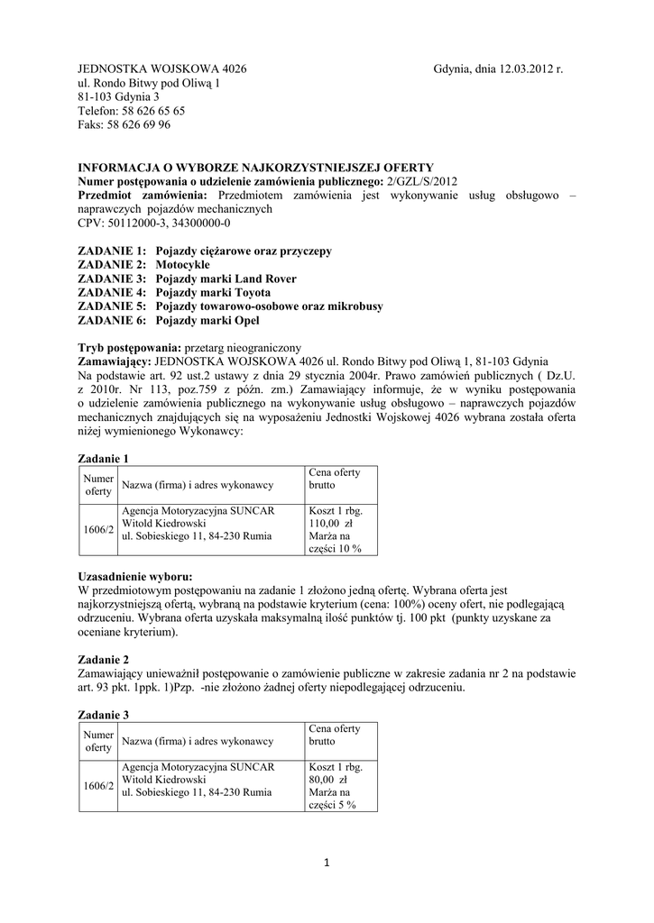 JEDNOSTKA WOJSKOWA 4026 ul. Rondo Bitwy pod Oliwą 1 81-103 Gdynia 3 Telefon: 58 626 65 65 Faks: 58 626 69 96 Gdynia, dnia 12.03.2012 r. INFORMACJA O WYBORZE NAJKORZYSTNIEJSZEJ OFERTY Numer postępowania o udzielenie zamówienia publicznego: 2/GZL/S/2012 Przedmiot zamówienia: Przedmiotem zamówienia jest wykonywanie usług obsługowo – naprawczych pojazdów mechanicznych CPV: 50112000-3, 34300000-0 ZADANIE 1: ZADANIE 2: ZADANIE 3: ZADANIE 4: ZADANIE 5: ZADANIE 6: Pojazdy ciężarowe oraz przyczepy Motocykle Pojazdy marki Land Rover Pojazdy marki Toyota Pojazdy towarowo-osobowe oraz mikrobusy Pojazdy marki Opel Tryb postępowania: przetarg nieograniczony Zamawiający: JEDNOSTKA WOJSKOWA 4026 ul. Rondo Bitwy pod Oliwą 1, 81-103 Gdynia Na podstawie art. 92 ust.2 ustawy z dnia 29 stycznia 2004r. Prawo zamówień publicznych ( Dz.U. z 2010r. Nr 113, poz.759 z późn. zm.) Zamawiający informuje, że w wyniku postępowania o udzielenie zamówienia publicznego na wykonywanie usług obsługowo – naprawczych pojazdów mechanicznych znajdujących się na wyposażeniu Jednostki Wojskowej 4026 wybrana została oferta niżej wymienionego Wykonawcy: Zadanie 1 Numer Nazwa (firma) i adres wykonawcy oferty Agencja Motoryzacyjna SUNCAR Witold Kiedrowski 1606/2 ul. Sobieskiego 11, 84-230 Rumia Cena oferty brutto Koszt 1 rbg. 110,00 zł Marża na części 10 % Uzasadnienie wyboru: W przedmiotowym postępowaniu na zadanie 1 złożono jedną ofertę. Wybrana oferta jest najkorzystniejszą ofertą, wybraną na podstawie kryterium (cena: 100%) oceny ofert, nie podlegającą odrzuceniu. Wybrana oferta uzyskała maksymalną ilość punktów tj. 100 pkt (punkty uzyskane za oceniane kryterium). Zadanie 2 Zamawiający unieważnił postępowanie o zamówienie publiczne w zakresie zadania nr 2 na podstawie art. 93 pkt. 1ppk. 1)Pzp. -nie złożono żadnej oferty niepodlegającej odrzuceniu. Zadanie 3 Numer Nazwa (firma) i adres wykonawcy oferty Agencja Motoryzacyjna SUNCAR Witold Kiedrowski 1606/2 ul. Sobieskiego 11, 84-230 Rumia Cena oferty brutto Koszt 1 rbg. 80,00 zł Marża na części 5 % 1 Uzasadnienie wyboru: W przedmiotowym postępowaniu na zadanie 3złożono trzy ofertę. Wybrana oferta jest najkorzystniejszą ofertą, wybraną na podstawie kryterium (cena: 100%) oceny ofert, nie podlegającą odrzuceniu. Wybrana oferta uzyskała maksymalną ilość punktów tj. 100 pkt (punkty uzyskane za oceniane kryterium). Zadanie 4 Numer Nazwa (firma) i adres wykonawcy oferty Agencja Motoryzacyjna SUNCAR Witold Kiedrowski 1606/3 ul. Sobieskiego 11, 84-230 Rumia Cena oferty brutto Koszt 1 rbg. 90,00 zł Marża na części 3 % Uzasadnienie wyboru: W przedmiotowym postępowaniu w zakresie zadania 4 złożono cztery oferty. Oferty nie podlegają odrzuceniu. Wybrana oferta jest ofertą najkorzystniejszą, wybraną na podstawie kryteriów oceny ofert. Wybrana oferta uzyskała maksymalną ilość punktów (punkty uzyskane za oceniane kryteria), tj. 100 pkt. Zadanie 5 Numer Nazwa (firma) i adres wykonawcy oferty Agencja Motoryzacyjna SUNCAR Witold Kiedrowski 1606/4 ul. Sobieskiego 11, 84-230 Rumia Cena oferty brutto Koszt 1 rbg. 58,00 zł Marża na części 3 % Uzasadnienie wyboru: W przedmiotowym postępowaniu w zakresie zadania 5 złożono trzy oferty. Oferty nie podlegają odrzuceniu. Wybrana oferta jest ofertą najkorzystniejszą, wybraną na podstawie kryteriów oceny ofert. Wybrana oferta uzyskała maksymalną ilość punktów (punkty uzyskane za oceniane kryteria), tj. 100 pkt. Zadanie 6 Numer Nazwa (firma) i adres wykonawcy oferty Agencja Motoryzacyjna SUNCAR Witold Kiedrowski 1606/5 ul. Sobieskiego 11, 84-230 Rumia Cena oferty brutto Koszt 1 rbg. 48,00 zł Marża na części 3 % Uzasadnienie wyboru: W przedmiotowym postępowaniu w zakresie zadania 6 złożono tylko cztery oferty. Oferty nie podlegają odrzuceniu. Wybrana oferta jest ofertą najkorzystniejszą, wybraną na podstawie kryteriów oceny ofert. Wybrana oferta uzyskała maksymalną ilość punktów (punkty uzyskane za oceniane kryteria), tj. 100 pkt. Streszczenie oceny i porównania złożonych ofert Zadanie 1 pojazdy ciężarowe oraz przyczepy Numer oferty 1606/1 Cena oferty brutto Nazwa (firma) i adres wykonawcy Agencja Motoryzacyjna SUNCAR Witold Kiedrowski ul. Sobieskiego 11, 84-230 Rumia Koszt 1 rbg. 110,00 zł Marża na części 10 % 2 Razem 100 pkt Zadanie 3 pojazdy marki Land Rover Numer oferty Nazwa (firma) i adres wykonawcy 1574/1 Anro Trade Sp. J ul. Sobieskiego 28, 84-230 Rumia 1603/1 1606/2 Cena oferty brutto Koszt 1 rbg. 246,00 zł Marża na części 15 % Samochodowy Zakład Usługowo Handlowy AUTO Ośrodek Szkoleniowy M. Brudniewicz Centrum Motoryzacji ul. Inwalidów Wojennych 1, 84-200 Wejherowo Agencja Motoryzacyjna SUNCAR Witold Kiedrowski ul. Sobieskiego 11, 84-230 Rumia Koszt 1 rbg. 147,60 zł Marża na części 15 % Koszt 1 rbg. 80,00 zł Marża na części 5% Razem 31 pkt 49 pkt 100 pkt Zadanie 4 pojazdy marki Toyota Numer oferty Nazwa (firma) i adres wykonawcy 1574/2 Anro Trade Sp. J ul. Sobieskiego 28, 84-230 Rumia 1598/1 1603/2 1606/3 Cena oferty brutto Koszt 1 rbg. 150,00 zł Marża na części 15 % Mechanika Pojazdowa Diagnostyka Koszt 1 rbg. Edward Cieśla ul. Hetmańska 9, 95,94 zł 84-230 Rumia Marża na części 5% Samochodowy Zakład Usługowo Koszt 1 rbg. Handlowy AUTO Ośrodek Szkoleniowy M. 147,60 zł Brudniewicz Marża na części Centrum Motoryzacji ul. Inwalidów 15 % Wojennych 1, 84-200 Wejherowo Agencja Motoryzacyjna SUNCAR Koszt 1 rbg. Witold Kiedrowski 90,00 zł ul. Sobieskiego 11, 84-230 Rumia Marża na części 3% Razem 52 pkt 86 pkt 53 pkt 100 pkt Zadanie 5 pojazdy towarowo-osobowe oraz mikrobusy Numer oferty 1598/2 1603/3 1606/4 Cena oferty brutto Nazwa (firma) i adres wykonawcy Mechanika Pojazdowa Diagnostyka Koszt 1 rbg. Edward Cieśla ul. Hetmańska 9, 95,94 zł 84-230 Rumia Marża na części 5% Samochodowy Zakład Usługowo Koszt 1 rbg. Handlowy AUTO Ośrodek Szkoleniowy M. 147,60 zł Brudniewicz Marża n