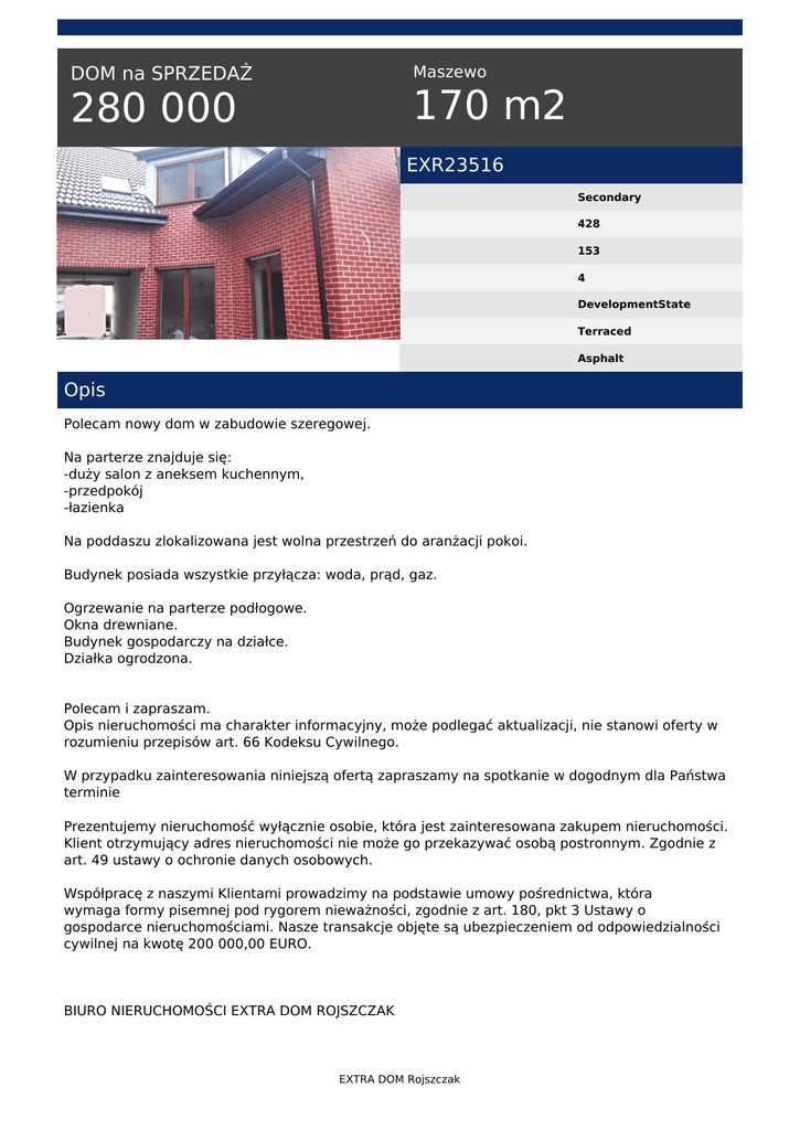 Maszewo DOM na SPRZEDAŻ 170 m2 280 000 EXR23516 Secondary 428 153 4 DevelopmentState Terraced Asphalt Opis Polecam nowy dom w zabudowie szeregowej. Na parterze znajduje się: -duży salon z aneksem kuchennym, -przedpokój -łazienka Na poddaszu zlokalizowana jest wolna przestrzeń do aranżacji pokoi. Budynek posiada wszystkie przyłącza: woda, prąd, gaz. Ogrzewanie na parterze podłogowe. Okna drewniane. Budynek gospodarczy na działce. Działka ogrodzona. Polecam i zapraszam. Opis nieruchomości ma charakter informacyjny, może podlegać aktualizacji, nie stanowi oferty w rozumieniu przepisów art. 66 Kodeksu Cywilnego. W przypadku zainteresowania niniejszą ofertą zapraszamy na spotkanie w dogodnym dla Państwa terminie Prezentujemy nieruchomość wyłącznie osobie, która jest zainteresowana zakupem nieruchomości. Klient otrzymujący adres nieruchomości nie może go przekazywać osobą postronnym. Zgodnie z art. 49 ustawy o ochronie danych osobowych. Współpracę z naszymi Klientami prowadzimy na podstawie umowy pośrednictwa, która wymaga formy pisemnej pod rygorem nieważności, zgodnie z art. 180, pkt 3 Ustawy o gospodarce nieruchomościami. Nasze transakcje objęte są ubezpieczeniem od odpowiedzialności cywilnej na kwotę 200 000,00 EURO. BIURO NIERUCHOMOŚCI EXTRA DOM ROJSZCZAK EXTRA DOM Rojszczak 72-200 Nowogard ul. Boh. Warszawy 1 (przy placówce Alior Banku) www.extradom.net.pl tel./fax 91 392 22 33 Co robimy dla klienta zainteresowanego zakupem: * Sprawdzamy zdolność kredytową * Wyszukujemy odpowiednią nieruchomość, * Pomagamy w prowadzeniu negocjacji, * Pomagamy w uzyskaniu potrzebnych dokumentów * Pomagamy w uzyskaniu kredytu hipotecznego * Współpracujemy z kancelariami notarialnymi, geodetami Korzystając z naszych usług oszczędzasz swój czas, a także zyskujesz pewność, że Twoja transakcja zostanie przeprowadzona z należytą starannością, w sposób profesjonalny i co najważniejsze - BEZPIECZNY. Nr licencji pośredników: 21317, 21318 Marcin Rojszczak tel. 508 312 261 tel. (91) 392 22 33 email: [email protected] EXTRA DOM Rojszczak Powered by TCPDF (www.tcpdf.org)