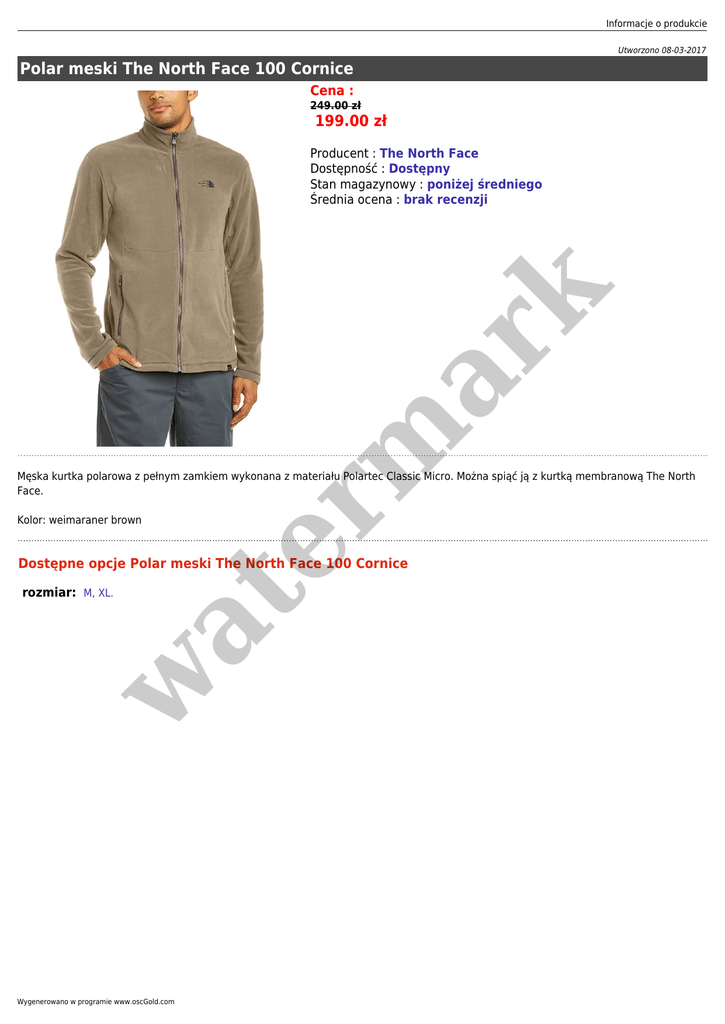 Informacje o produkcie Utworzono 08-03-2017 Polar meski The North Face 100 Cornice Cena : 249.00 zł 199.00 zł er m ar k Producent : The North Face Dostępność : Dostępny Stan magazynowy : poniżej średniego Średnia ocena : brak recenzji Męska kurtka polarowa z pełnym zamkiem wykonana z materiału Polartec Classic Micro. Można spiąć ją z kurtką membranową The North Face. Kolor: weimaraner brown w rozmiar: M, XL. at Dostępne opcje Polar meski The North Face 100 Cornice Wygenerowano w programie www.oscGold.com