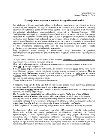 Natalia Kotsyba, Instytut Slawistyki PAN Funkcja semantyczna a badania kategorii określoności Jak wiadomo, w języku angielskim głównym środkiem, wyrażającym określoność we frazie nominalnej jest rodzajnik. W języku ukraińskim na poziomie frazy nominalnej możemy obserwować wykładniki pełnej kwantyfikacji ogólnej, które są analogiczne z ich rosyjskimi lub polskimi leksykalnymi odpowiednikami, opisanymi w [Koseska-Toszewa, 1991]. Osobliwością formalnych wykładników kwantyfikacji jest to, że żaden z nich nie funkcjonuje wyłącznie dla wyrażania kwantyfikacji (jak to jest w przypadku rodzajników w różnych językach), czyli funkcje tych jednostek są powielone. Istnieją środki do wyrażania każdej treści kwantyfikacyjnej, ale nie są one obligatoryjne i używane przeważnie w przypadkach zagrożenia niepowodzenia komunikacyjnego, czyli albo, jeśli mówiący ma obawę, że może nie być zrozumiany poprawnie, albo jeśli do nieporozumienia już doszło i trzeba wytłumaczyć przekazywane treści bardziej skutecznie. Żeby przybliżyć nieco sytuację z „określaniem” frazy nominalnej w językach bezrodzajnikowych, popatrzmy na przykładowy tekst w języku ukraińskim i jego angielskie tłumaczenie: Се було давно. Через те не знає навiть нiхто назвати мiсцевiсть, де склалася подiя, про яку розказується. Хiба те одно, що в горах. Мов у кiтлi мiж горами, що здiймалися поважно вгору, ховалося доволi велике село. Лiси тих гiр - старi, непрогляднi... В ногах одної гори, названої Чабаниця, до котрої i тулилося наше село, бiгла гучна рiка. Шумна i прудка, гонила розпiнена почерез велике неповоротке камiння. Рiка та окружляє гору Чабаницю, неначеб хотiла її обiймити. Немов i до тiєї-то рiки сходили з самого верху Чабаницi смереки густими рядками, однi по других. Низько в долинi, вже над самою рiкою, опинилися вони. (Ольга Кобилянська. В недiлю рано зiлля копала) It happened long ago. So long ago that no one can say exactly where the events chronicled here took place. Except, perhaps, that it was in the mountains. Nestled between these mountains rising in a dignified manner on all sides, as though inside a cauldron, hid a fairly large village. The forests in these mountains were old and impenetrable. At the foot of one of these mountains, named Chabanytsia, against which our village huddled, ran a noisy stream. Frothing and swift, it foamed over huge unmoving boulders, encircling Chabanytsia as if wanting to embrace it. Row upon row, a thick growth of firs, one after another, marched down to the river from the heights, stopping at the bottom right at the river's edge. (Olha Kobylanska, On Sunday morning she gathered herbs, translated by Mary Skrypnyk) Przedstawiony tekst jest początkiem powieści XIX-wiecznej pisarki bukowińskiej. Tłumaczenie należy do osoby pochodzenia ukraińskiego, urodzonej w Stanach Zjednoczonych, a więc wystarczająco dobrze znającej obaj języki. Określone frazy nominalne, użyte w tekście reprezentują faktycznie całą znaną w literaturze przedmiotu klasyfikację Johna A. Hawkinsa, która opisuje użycia rodzajnika angielskiego, czyli tekst wydaje się być w miarę reprezentatywny. Szczególny interes dla nas przedstawiają te frazy nominalne, które zostały przetłumaczone na angielski z użyciem rodzajnika określonego. 1 Zgodnie z wyliczeniami Poesio i Vieira [1999, 1] ok. 70 % wszystkich deskrypcji określonych (fraz nominalnych, użytych z rodzajnikiem określonym) w przeciętnym angielskim tekście są używane bez wprowadzania pojęcia do tekstu poprzez użycie rodzajnika nieokreślonego, czyli są użyte nie anaforycznie. Jeśli brać to pod uwagę, nie może nie dziwić fakt, że większość prac, napisanych o kategorii określoności w języku angielskim, skupiała się na opisywaniu wyłącznie mechanizmów anafory i związanej z tym kwestii zasięgu kwantyfikatorów [Heim, Montague], a tak liczna reprezentacja określoności na innych poziomach była w tych opisach pomijana. Ponieważ przedstawiony wyżej tekst jest początkiem utworu, zawiera on więcej fraz nominalnych, użytych dla wprowadzenia przedmiotów do dyskursu i względnie niewiele odniesień anaforycznych, które nas tutaj interesują mniej. Mamy więc możliwość ocenić dość rozmaite pod względem określoności użycia. Pod względem sposobu wyrażania w języku tekstu oryginalnego (a także i znaczenia) można je podzielić na dwie podstawowe grupy. I. Frazy nominalne, które oprócz rzeczownika podstawowego zawierają także dodatkowe formalne środki ‘określające’: 1) deskrypcja określona: мiсцевiсть, де склалася подiя, про яку розказується 2) zaimki osobowe, dzierżawcze: тих гiр, наше село, до тiєї-то рiки, над самою рiкою (wieloznaczne) 3) postpozytywne użycie zaimka wskazującego та/той: Рiка та jest to konstrukcja z wyłącznie anaforyczną funkcją, dlatego opisujemy je osobno. II. Frazy nominalne, które nie zawierają żadnych formalnych wskaźników określoności: 1) nazwa własna: Chabanytsia 2) nazwy ogólne: Лiси тих гiр, В ногах одної гори, з самого верху Чабаницi, в долинi Są to najbardziej interesujące przypadki określoności, zawartej w znaczeniach podkreślonych wyrazów. Jak widać na przykładzie tego krótkiego tekstu, jest ich stosunkowo dużo, a więc, nie należy tego sposobu wyrażania okre