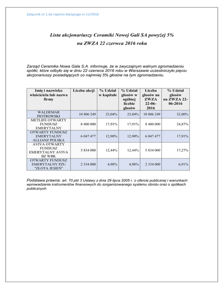 Załącznik nr 1 do raportu bieżącego nr 11/2016 Lista akcjonariuszy Ceramiki Nowej Gali SA powyżej 5% na ZWZA 22 czerwca 2016 roku Zarząd Ceramika Nowa Gala S.A. informuje, że w zwyczajnym walnym zgromadzeniu spółki, które odbyło się w dniu 22 czerwca 2016 roku w Warszawie uczestniczyło pięciu akcjonariuszy posiadających co najmniej 5% głosów na tym zgromadzeniu. Imię i nazwisko właściciela lub nazwa firmy WALDEMAR PIOTROWSKI METLIFE OTWARTY FUNDUSZ EMERYTALNY OTWARTY FUNDUSZ EMERYTALNY ALLIANZ POLSKA AVIVA OTWARTY FUNDUSZ EMERYTALNY AVIVA BZ WBK OTWARTY FUNDUSZ EMERYTALNY PZU "ZŁOTA JESIEŃ" Liczba akcji % Udział % Udział w kapitale głosów w ogólnej liczbie głosów Liczba % Udział głosów na głosów ZWZA na ZWZA 2222-0606-2016 2016 10 806 249 23,04% 23,04% 10 806 249 32,00% 8 400 000 17,91% 17,91% 8 400 000 24,87% 6 047 477 12,90% 12,90% 6 047 477 17,91% 5 834 000 12,44% 12,44% 5 834 000 17,27% 2 334 000 4,98% 4,98% 2 334 000 6,91% Podstawa prawna: art. 70 pkt 3 Ustawy z dnia 29 lipca 2005 r. o ofercie publicznej i warunkach wprowadzania instrumentów finansowych do zorganizowanego systemu obrotu oraz o spółkach publicznych