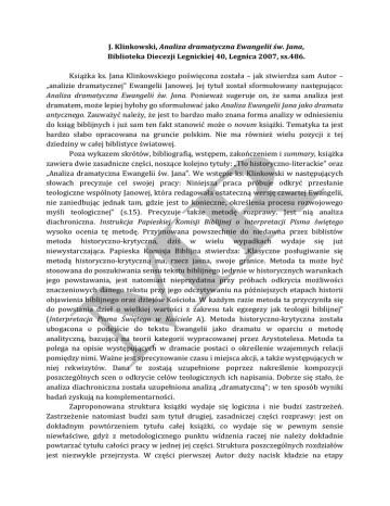 J. Klinkowski, Analiza dramatyczna Ewangelii św. Jana, Biblioteka Diecezji Legnickiej 40, Legnica 2007, ss.486. Książka ks. Jana Klinkowskiego poświęcona została – jak stwierdza sam Autor – „analizie dramatycznej” Ewangelii Janowej. Jej tytuł został sformułowany następująco: Analiza dramatyczna Ewangelii św. Jana. Ponieważ sugeruje on, że sama analiza jest dramatem, może lepiej byłoby go sformułować jako Analiza Ewangelii Jana jako dramatu antycznego. Zauważyć należy, że jest to bardzo mało znana forma analizy w odniesieniu do ksiąg biblijnych i już sam ten fakt stanowić może o novum książki. Tematyka ta jest bardzo słabo opracowana na gruncie polskim. Nie ma również wielu pozycji z tej dziedziny w całej biblistyce światowej. Poza wykazem skrótów, bibliografią, wstępem, zakończeniem i summary, książka zawiera dwie zasadnicze części, noszące kolejno tytuły: „Tło historyczno-‐literackie” oraz „Analiza dramatyczna Ewangelii św. Jana”. We wstępie ks. Klinkowski w następujących słowach precyzuje cel swojej pracy: Niniejsza praca próbuje odkryć przesłanie teologiczne wspólnoty Janowej, która redagowała ostateczną wersję czwartej Ewangelii, nie zaniedbując jednak tam, gdzie jest to konieczne, określenia procesu rozwojowego myśli teologicznej” (s.15). Precyzuje także metodę rozprawy. Jest nią analiza diachroniczna. Instrukcja Papieskiej Komisji Biblijnej o interpretacji Pisma świętego wysoko ocenia tę metodę. Przyjmowana powszechnie do niedawna przez biblistów metoda historyczno-‐krytyczna, dziś w wielu wypadkach wydaje się już niewystarczająca. Papieska Komisja Biblijna stwierdza: „Klasyczne posługiwanie się metodą historyczno-‐krytyczną ma, rzecz jasna, swoje granice. Metoda ta może być stosowana do poszukiwania sensu tekstu biblijnego jedynie w historycznych warunkach jego powstawania, jest natomiast nieprzydatna przy próbach odkrycia możliwości znaczeniowych danego tekstu przy jego odczytywaniu na późniejszych etapach historii objawienia biblijnego oraz dziejów Kościoła. W każdym razie metoda ta przyczyniła się do powstania dzieł o wielkiej wartości z zakresu tak egzegezy jak teologii biblijnej” (Interpretacja Pisma Świętego w Kościele A). Metoda historyczno-‐krytyczna została ubogacona o podejście do tekstu Ewangelii jako dramatu w oparciu o metodę analityczną, bazującą na teorii kategorii wypracowanej przez Arystotelesa. Metoda ta polega na opisie występujących w dramacie postaci o określenie wzajemnych relacji pomiędzy nimi. Ważne jest sprecyzowanie czasu i miejsca akcji, a także występujących w niej rekwizytów. Dana te zostają uzupełnione poprzez nakreślenie kompozycji poszczególnych scen o odkrycie celów teologicznych ich napisania. Dobrze się stało, że analiza diachroniczna została uzupełniona analizą „dramatyczną”; w ten sposób wyniki badań zyskują na komplementarności. Zaproponowana struktura książki wydaje się logiczna i nie budzi zastrzeżeń. Zastrzeżenie natomiast budzi sam tytuł drugiej, zasadniczej części rozprawy: jest on dokładnym powtórzeniem tytułu całej książki, co wydaje się w pewnym sensie niewłaściwe, gdyż z metodologicznego punktu widzenia raczej nie należy dokładnie powtarzać tytułu całości pracy w jednej jej części. Struktura poszczególnych rozdziałów jest niezwykle przejrzysta. W części pierwszej Autor duży nacisk kładzie na etapy powstawania tradycji Janowej oraz na tło historyczno-‐kulturowe i religijne powstania dzieła Janowego. Ważny w tym rozdziale jest paragraf mówiący o starożytnym teatrze, gdyż wprowadza on w naturę analizy dramatycznej. W pierwszym rozdziale swej pracy Autor kreśli szeroką perspektywę powstawania tradycji Janowej, uwzględniając kontekst środowiskowy Jerozolimy, Syrii i Efezu. Autor sięga tu po tradycje kulturowe, historyczne i religijne. Nie pomija wymiaru literackiego; więcej – opowiada się za wieloma badaczami za istnieniem swoistej „szkoły Janowej”, której milieu usytuować należy gdzieś pomiędzy synagogą a szkołą stoicką. W rozdziale drugim, zasadniczym rozdziale pracy, Autor dokonuje analizy „dramatycznej” całej Ewangelii, przy czym w pierwszym „akcie” omówionych zostało dziewięć scen, w drugim zaś – scen dziesięć. Analiza Ewangelii z punktu widzenia dramatu antycznego jest czymś nowatorskim na gruncie polskim i stanowi o dużym walorze opracowania. Analiza ta dokonana została w dwóch „aktach”, z których pierwszy dotyczy tzw. księgi znaków (J 1-‐12), drugi zaś wydarzeń paschalnych (J 13-‐21). Nieco dziwi fakt, że w tytule owego drugiego aktu Autor zaznacza, że analizować będzie J 13,1-‐20,31 (a więc do końca tzw. pierwszego epilogu), natomiast w analizę tę włącza także J 21,1-‐24, czego w tytule nie uwidocznił. Czytelnikowi trudno znaleźć uzasadnienie takiego postępowania. We wstępach nie ma wzmianki o tym, dlaczego w tytule „aktu drugiego” Autor pomija drugi epilog, który następnie omawia na identycznych zasadach, jak pozostałe sceny. Jeśli chodzi o zachowanie proporcji, nie budzi ono żadnych zastrzeżeń. Ostatnią część pracy – rozdział podsumowujący – stanowi zakończenie. Nie jest ono zbyt obszerne (zaledwie cztery strony), zbiera jednak w sposób syntetyczny wyniki przeprowadzonych badań, ukazując słuszne konkluzje teologiczne. Pytania może budzić co najwyżej stwierdzenie, że „z chwilą śmierci Jakuba, brata Pańskiego w 62 r. po Chr. upadła idea kompromisu z judaizmem” (s.441). Niektórzy autorzy sugerują, że stało się to już w 49 roku, na tzw. soborze jerozolimskim; inni rozłam judaizmu i chrześcijaństwa dostrzegają w roku 90 na synodzie w Jamni; jeszcze inni twierdzą, że drogi Kościoła i synagogi rozeszły się dopiero po powstaniu Bar Kochby. Dostrzegając wszelkie walory tego rzetelnego opracowania warto z