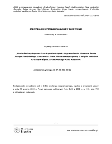 SIWZ w postępowaniu na zadanie: „Druk offsetowy i oprawa trzech tytułów książek: Mapy wyobraźni. Surrealne światy Jerzego Skarżyńskiego, Sztukmistrz. Erwin Sówka retrospektywnie, Z dziejów radiofonii na Górnym Śląsku. 85 lat Polskiego Radia Katowice”. Oznaczenie sprawy: MŚ-ZP-DT-333-26/12 SPECYFIKACJA ISTOTNYCH WARUNKÓW ZAMÓWIENIA zwana dalej w skrócie SIWZ do postępowania na zadanie: „Druk offsetowy i oprawa trzech tytułów książek: Mapy wyobraźni. Surrealne światy Jerzego Skarżyńskiego, Sztukmistrz. Erwin Sówka retrospektywnie, Z dziejów radiofonii na Górnym Śląsku. 85 lat Polskiego Radia Katowice”. oznaczenie sprawy: MŚ-ZP-DT-333-26/12 Postępowanie prowadzone jest w trybie przetargu nieograniczonego, zgodnie z przepisami ustawy z dnia 29 stycznia 2004 r. Prawo zamówień publicznych (t.j.: Dz.U. z 2010 r. nr 113, poz. 759 z późniejszymi zmianami). -1- SIWZ w postępowaniu na zadanie: „Druk offsetowy i oprawa trzech tytułów książek: Mapy wyobraźni. Surrealne światy Jerzego Skarżyńskiego, Sztukmistrz. Erwin Sówka retrospektywnie, Z dziejów radiofonii na Górnym Śląsku. 85 lat Polskiego Radia Katowice”. Oznaczenie sprawy: MŚ-ZP-DT-333-26/12 1) Nazwa (firma) oraz adres Zamawiającego. Muzeum Śląskie, al. W. Korfantego 3, 40-005 Katowice, nr tel.: 32 779 93 00, nr fax: 32 779 93 67, adres strony internetowej: www.muzeumslaskie.pl 2) Tryb udzielenia zamówienia. 1. Postępowanie prowadzone jest w trybie przetargu nieograniczonego, zgodnie z przepisami ustawy z dnia 29 stycznia 2004 r. Prawo zamówień publicznych (t.j.: Dz.U. z 2010 r. nr 113, poz. 759 z późniejszymi zmianami) zwaną w dalszej części SIWZ „PZP” o wartości zamówienia poniżej 130 000,00 euro. 2. Do czynności podejmowanych przez Zamawiającego i Wykonawców w postępowaniu o udzielenie zamówienia stosuje się przepisy powołanej ustawy Prawo zamówień publicznych oraz aktów wykonawczych wydanych na jej podstawie, a w sprawach nieuregulowanych przepisy ustawy z dnia 23 kwietnia 1964 r. Kodeks cywilny (t.j.: Dz. U. z 1964 r. Nr 16, poz. 93, z późniejszymi zmianami). 3) Opis przedmiotu zamówienia. 1. Przedmiotem postępowania i zamówienia jest druk offsetowy i oprawa trzech tytułów książek: Mapy wyobraźni. Surrealne światy Jerzego Skarżyńskiego, Sztukmistrz. Erwin Sówka retrospektywnie, Z dziejów radiofonii na Górnym Śląsku. 85 lat Polskiego Radia Katowice. Odnośnie książki Mapy wyobraźni. Surrealne światy Jerzego Skarżyńskiego: odbiór od Zamawiającego materiałów do druku offsetowego, naświetlanie CTP, druk bloków książki, druk i wykonanie okładki, wykonanie uszlachetnień wg specyfikacji parametrów technicznych, wykonanie i dostarczenie proofów z przekazanych plików, wykonanie i dostarczenie ozalidów z całości, oprawa książki, pakowanie i dostarczenie wykonanego nakładu książki (700 egz.) do siedziby Zamawiającego. Odnośnie książki Sztukmistrz. Erwin Sówka retrospektywnie: odbiór od Zamawiającego materiałów do druku offsetowego, naświetlanie CTP, druk bloków książki, druk i wykonanie okładki, wykonanie uszlachetnień wg specyfikacji parametrów technicznych, wykonanie i dostarczenie proofów z przekazanych plików, wykonanie i dostarczenie ozalidów z całości, oprawa książki, pakowanie i dostarczenie wykonanego nakładu książki (1000 egz.) do siedziby Zamawiającego. Odnośnie książki Z dziejów radiofonii na Górnym Śląsku. 85 lat Polskiego Radia Katowice: odbiór od Zamawiającego materiałów do druku offsetowego, naświetlanie CTP, druk bloków książki, druk i wykonanie okładki, kopiowanie/nagrywanie płyt CD, nadruk na nich, wklejenie kopert foliowych do książki, konfekcjonowanie płyt, wykonanie uszlachetnień wg specyfikacji parametrów technicznych, wykonanie i dostarczenie proofów z przekazanych plików, wykonanie i dostarczenie ozalidów z całości, oprawę książki, pakowanie i dostarczenie wykonanego nakładu książki (1000 egz.) wraz z płytami CD (1000 egz.) do siedziby Zamawiającego. Wykonane płyty CD w ilości 1000 egz. stanowią integralną część nakładu książki, tj. (1 egz. wykonanej ksiązki + jeden egz. wykonanej płyty CD) = 1 egz. wykonanej książki. Szczegółowy opis przedmiotu zamówienia zawarty jest w Załączniku Nr 1 do SIWZ. Wykonawca musi zaoferować wykonanie zamówienia zgodne z wymogami Zamawiającego określonymi w SIWZ i jej załącznikach. Załączniki do SIWZ stanowią jej integralną część. Wykonanie zamówienia obejmuje wszystkie prace i obowiązki Wykonawcy niezbędne do należytego wykonania zamówienia. -2- SIWZ w postępowaniu na zadanie: „Druk offsetowy i oprawa trzech tytułów książek: Mapy wyobraźni. Surrealne światy Jerzego Skarżyńskiego, Sztukmistrz. Erwin Sówka retrospektywnie, Z dziejów radiofonii na Górnym Śląsku. 85 lat Polskiego Radia Katowice”. Oznaczenie sprawy: MŚ-ZP-DT-333-26/12 2. Oznaczenie przedmiotu zamówienia według kodu Wspólnego Słownika Zamówień CPV: 79823000-9 (usługi drukowania i dostawy). 3. Oryginał Specyfikacji Istotnych Warunków Zamówienia podpisany przez osoby uprawnione, stanowiący podstawę do rozstrzygania ewentualnych sporów związanych z treścią dokumentu, dostępny jest w formie papierowej w Siedzibie Zamawiającego i udostępniony na stronie internetowej: www.muzeumslaskie.pl BIP -przetargi. 4) Termin wykonania zamówienia. 1. Wykonawca zobowiązuje się wykonać przedmiot zamówienia w terminie: 1.1. Nakład książki (700 egz.) Mapy wyobraźni. Surrealne światy Jerzego Skarżyńskiego: do 21 dni kalendarzowych licząc od następnego dnia po przekazaniu przez Zamawiającego materiałów do wykonania książki. 1.2. Nakład książki (1000 egz.) Sztukmistrz. Erwin Sówka retrospektywnie:: do 28 dni kalendarzowych licząc od następnego dnia po przekazaniu przez Zamawiającego materiałów do wykonania książki. 1.3. Nakład książki (1000 egz.) Z dziejó