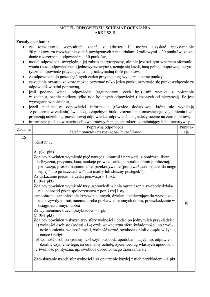 MODEL ODPOWIEDZI I SCHEMAT OCENIANIA ARKUSZ II Zasady oceniania: • za rozwiązanie wszystkich zadań z arkusza II można uzyskać maksymalnie 50 punktów, za rozwiązanie zadań powiązanych z materiałami źródłowymi – 20 punktów, za zadanie rozszerzonej odpowiedzi – 30 punktów, • model odpowiedzi uwzględnia jej zakres merytoryczny, ale nie jest ścisłym wzorcem sformułowania (poza odpowiedziami jednowyrazowymi), uznaje się każdą inną pełną i poprawną merytorycznie odpowiedź przyznając za nią maksymalną ilość punktów. • za odpowiedzi do poszczególnych zadań przyznaje się wyłącznie pełne punkty, • za zadania otwarte, za które można przyznać tylko jeden punkt, przyznaje się punkt wyłącznie za odpowiedź w pełni poprawną, • jeśli podano więcej odpowiedzi (argumentów, cech itp.) niż wynika z polecenia w zadaniu, ocenie podlega tylko tyle kolejnych odpowiedzi (liczonych od pierwszej), ile jest wymagane w poleceniu, • jeżeli podane w odpowiedzi informacje (również dodatkowe, które nie wynikają z polecenia w zadaniu) świadczą o zupełnym braku zrozumienia omawianego zagadnienia i zaprzeczają udzielonej prawidłowej odpowiedzi, odpowiedź taką należy ocenić na zero punktów, • informacje podane w nawiasach kwadratowych mają charakter uzupełniający lub alternatywny. Poprawna odpowiedź PunktaZadanie cja Liczba punktów za rozwiązania częściowe 26 Tekst nr 1. A. (0-1 pkt) Zdający powinien wymienić pięć narzędzi kontroli i perswazji z poniższej listy: siła fizyczna, przymus, kara, sankcje prawne, sankcje moralne opinii publicznej, perswazja, prośba, napomnienie, przekonywanie (ponieważ „tak będzie dla niego lepiej”, „to go uszczęśliwi”, „to mądry lub słuszny postępek”) Za wskazanie pięciu narzędzi perswazji – 1 pkt. B. (0-1 pkt) Zdający powinien wymienić trzy usprawiedliwienia ograniczenia swobody działania jednostki przez społeczeństwo z poniższej listy: samoobrona, zapobieżenie krzywdzie innych, działania zmierzające do wyrządzenia krzywdy komuś innemu, próba pozbawienie innych dobra, przeszkadzanie w osiągnięciu innym dobra Za wymienienie trzech przykładów – 1 pkt. C. (0-1 pkt) Zdający powinien wskazać trzy sfery wolności i podać po jednym ich przykładzie: a) wolności osobiste (rodzaj «1») czyli wewnętrzna sfera świadomości, np.: wolność sumienia, wolność myśli, wolność uczuć, swoboda opinii o osądu w życiu, nauce i religii, b) wolność osobista (rodzaj «2») czyli swoboda upodobań i zajęć, np. odpowiedzialne czynienie tego, na co mamy ochotę, życie według własnych upodobań, c )wolność polityczna, np. swoboda dobrowolnego zrzeszania się. Za wskazanie trzech sfer wolności i za opatrzenie każdej z nich przykładem – 1 pkt. 10 Tekst nr 2. D. (0-1 pkt) Zdający powinien napisać, że autor uznaje wolność za wartość podstawową, dlatego że człowiek zniewolony nie może nawet dopominać się równości – 1 pkt E. (0-1 pkt) Zdający powinien wymienić dwa powody większej popularność ideału równości wskazane przez autora: a) ideał równości jest bardziej zrozumiały, łatwiejszy do dostrzeżenia, gdyż równości możemy nadać namacalne znaczenia, b) równość prowadzi do materialnych korzyści, a zyski płynące z wolności są trudno uchwytne. Za wskazanie dwóch powodów – 1 pkt. Tekst nr 3. F. (0-1 pkt) Zdający powinien wymienić trzy spośród podanych przez autora argumentów przeciwko realizacji idei równości materialnej. a) nie jest sprawiedliwe, żeby ten, kto daje społeczeństwu więcej, dostawał tyle samo, ile ten, kto daje mniej, b) ludzie „mogą chcieć różnych rzeczy, mają nierówne upodobania, marzenia i potrzeby”, c) mechaniczne wprowadzany egalitaryzm powoduje ograniczenie wolności, Za wskazanie trzech argumentów – 1 pkt. G. (0-4 pkt) Zdający powinien wyjaśnić oba pojęcia i wymienić po jednym przykładzie utopii i antyutopii podając ich tytuły i autorów. a) utopia – projekt wymyślonego państwa, kraina szczęścia i doskonałości, która nigdzie nie istniej, synonim tego, co idealne i niemożliwe, zwłaszcza w sferze politycznej i społecznej, np. „Utopia” Thomasa More’a, „Miasto Słońca” Tomasso Campanelli, „Nowa Atlantyda” Francisa Bacona (ew. „Państwo” Platona), b) antyutopia – negatywna utopia (dystopia), przestroga przed skutkami realizacji pewnych idei politycznych np. „Rok 1984” George Orwella, „Nowy, wspaniały świat” Aldousa Huxleya, „My” Jewgienija Zamiatina. Za wyjaśnienie każdego z pojęć – 1 pkt, za podanie każdego z przykładów – 1 pkt. 2 27 28 (0-1 pkt) Zdający powinien napisać, że rysunek mówi o wolności słowa (wyrażania poglądów) oraz myśli. Należą one do pierwszej generacji praw człowieka. A.(0-1) 23 punkty procentowe – 1 pkt. 0-1 B. (0-2) Zdający powinien wskazać trzy poglądy: a) olbrzymia większość ankietowanych [92% wskazań] utożsamia równość społeczną z równością wobec prawa (z posiadaniem takich samych uprawnień), b) olbrzymia większość ankietowanych [88% wskazań] utożsamia równość społeczną z równością szans (zdobycia wykształcenia, osiągnięcia wysokiej pozycji społecznej), c) znacznie mniej ankietowanych [56% wskazań] utożsamia równość społeczną z równością ekonomiczną (wyrównanym poziomem materialnym ludności). Za wskazanie dwóch poglądów – 1 pkt, za wskazanie trzech – 2 pkt. C. (0-2 pkt) Zdający powinien wskazać dwie z podanych niżej zależności: a) im niższe wykształcenie, tym powszechniejsze utożsamianie równości społecznej z równością materialną (wykształcenie podstawowe – 68% wskazań, wykształcenie wyższe – 36% wskazań), b) im niższe dochody, tym powszechniejsze utożsamianie równości społecznej z równością materialną (niskie dochody na głowę w rodzinie – 70% wskazań, wyższe dochody – 41% wskazań), c