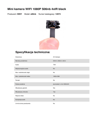 Mini kamera WIFI 1080P S06nb 4xIR black Producent: INNY Model: s06nb Numer katalogowy: 12974 Specyfikacja techniczna: Gwarancja 24 miesiące Wymiary przedmiotu 23mm x 58mm x 6mm Audio TAK Wejścia/wyjścia audio No Max. rozdzielczość zdjęć No Max. rozdzielczość wideo 1920x1080 Pamięć No Rodzaj zasilania akumulator Li-Ion 4000mAh Wbudowany głośnik Nie Wbudowany mikrofon Tak Wyjście wideo No Kompresja audio No Link do strony producenta No