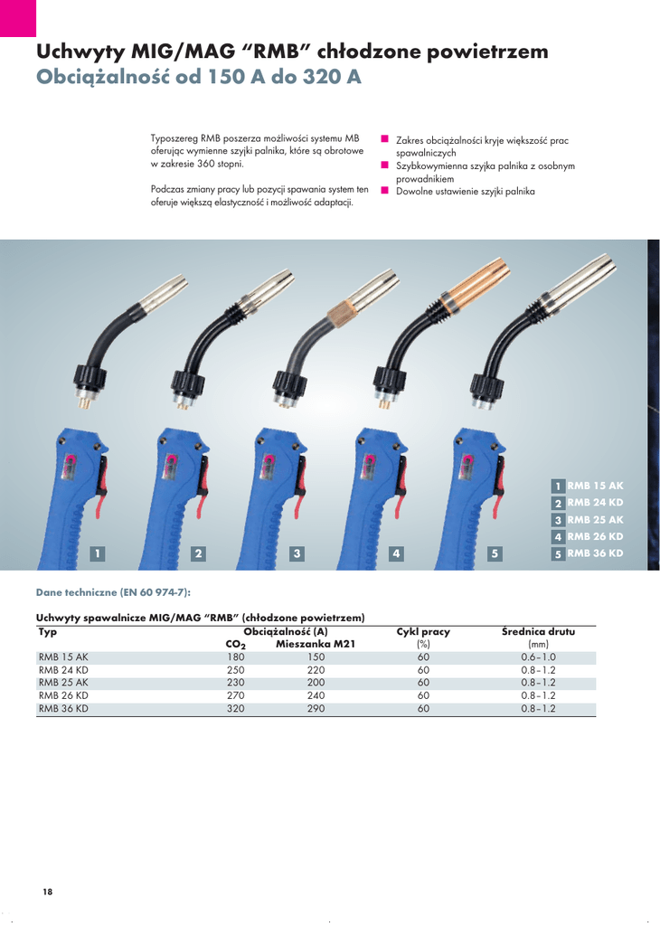 Uchwyty MIG/MAG “RMB” chłodzone powietrzem Obciążalność od