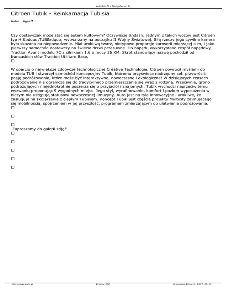 AutoRok.PL / DesignForum.PL Citroen Tubik - Reinkarnacja Tubisia Autor: AgaeM Czy dostawczak może stać się autem kultowym? Oczywiście – jednym z takich wozów jest Citroen typ H „TUB” wytwarzany na początku II Wojny Światowej. Siłą rzeczy jego cywilna kariera była skazana na niepowodzenie. Miał urokliwą twarz, nietypowe proporcje karoserii mierzącej 4 m, i jako pierwszy samochód dostawczy na świecie drzwi przesuwne. Do napędu wykorzystano zespół napędowy Traction Avant modelu 7C z silnikiem 1.6 o mocy 36 KM. Skrót stanowiący nazwę pochodził od francuskich słów Traction Utilitare Base. W oparciu o największe zdobycze technologiczne Créative Technologie, Citroen powrócił myślami do modelu TUB i stworzył samochód koncepcyjny Tubik, któremu przyświeca nadrzędny cel: przywrócić pasję podróżowania, które może być interaktywne, nowoczesne i ekologiczne! W dzisiejszych czasach podróżowanie nie ogranicza się do tradycyjnego przemieszczania się wraz z rodziną. Przeciwnie, grono podróżujących niejednokrotnie poszerza się o przyjaciół i znajomych. Tubik wychodzi naprzeciw temu wyzwaniu proponując 9 wygodnych miejsc. Jego styl, wyrafinowanie, komfort i poziom wyposażenia w niczym nie ustępują statusowi nowoczesnej limuzyny. Auto jest na tyle innowacyjne i urokliwe, że zasługuje na skojarzenie z ciepłym Tubisiem. Koncept Tubik jest częścią projektu Multicity zajmującego się mobilnością, spojrzeniem w jej przyszłość, programem zmierzającym do ułatwienia podróżowania. Zapraszamy do galerii zdjęć http://mas.auto.pl Kreator PDF Utworzono 8 March, 2017, 09:19