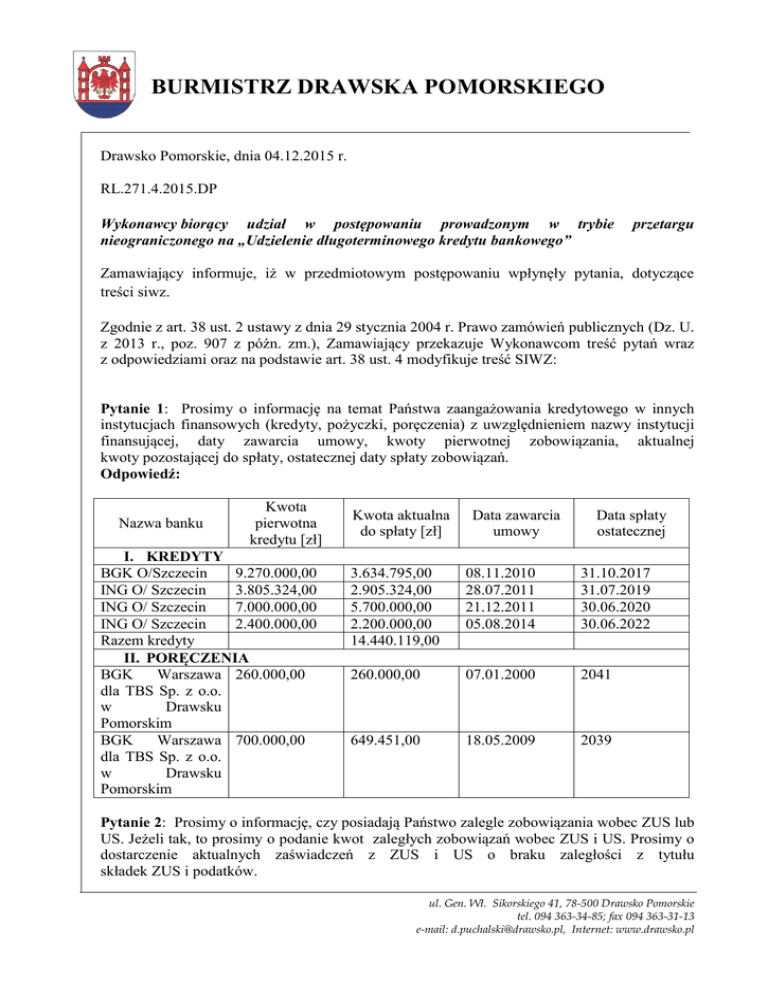 BURMISTRZ DRAWSKA POMORSKIEGO Drawsko Pomorskie, dnia 04.12.2015 r. RL.271.4.2015.DP Wykonawcy biorący udział w postępowaniu prowadzonym w trybie nieograniczonego na „Udzielenie długoterminowego kredytu bankowego” przetargu Zamawiający informuje, iż w przedmiotowym postępowaniu wpłynęły pytania, dotyczące treści siwz. Zgodnie z art. 38 ust. 2 ustawy z dnia 29 stycznia 2004 r. Prawo zamówień publicznych (Dz. U. z 2013 r., poz. 907 z późn. zm.), Zamawiający przekazuje Wykonawcom treść pytań wraz z odpowiedziami oraz na podstawie art. 38 ust. 4 modyfikuje treść SIWZ: Pytanie 1: Prosimy o informację na temat Państwa zaangażowania kredytowego w innych instytucjach finansowych (kredyty, pożyczki, poręczenia) z uwzględnieniem nazwy instytucji finansującej, daty zawarcia umowy, kwoty pierwotnej zobowiązania, aktualnej kwoty pozostającej do spłaty, ostatecznej daty spłaty zobowiązań. Odpowiedź: Nazwa banku Kwota pierwotna kredytu [zł] I. KREDYTY BGK O/Szczecin 9.270.000,00 ING O/ Szczecin 3.805.324,00 ING O/ Szczecin 7.000.000,00 ING O/ Szczecin 2.400.000,00 Razem kredyty II. PORĘCZENIA BGK Warszawa 260.000,00 dla TBS Sp. z o.o. w Drawsku Pomorskim BGK Warszawa 700.000,00 dla TBS Sp. z o.o. w Drawsku Pomorskim Kwota aktualna do spłaty [zł] Data zawarcia umowy Data spłaty ostatecznej 3.634.795,00 2.905.324,00 5.700.000,00 2.200.000,00 14.440.119,00 08.11.2010 28.07.2011 21.12.2011 05.08.2014 31.10.2017 31.07.2019 30.06.2020 30.06.2022 260.000,00 07.01.2000 2041 649.451,00 18.05.2009 2039 Pytanie 2: Prosimy o informację, czy posiadają Państwo zalegle zobowiązania wobec ZUS lub US. Jeżeli tak, to prosimy o podanie kwot zaległych zobowiązań wobec ZUS i US. Prosimy o dostarczenie aktualnych zaświadczeń z ZUS i US o braku zaległości z tytułu składek ZUS i podatków. ul. Gen. Wł. Sikorskiego 41, 78-500 Drawsko Pomorskie tel. 094 363-34-85; fax 094 363-31-13 e-mail: [email protected], Internet: www.drawsko.pl Odpowiedź: Zamawiający oświadcza, że nie posiada i nie posiadała zaległych zobowiązań wobec ZUS i US. Pytanie 3: Prosimy o informacje, czy w ciągu ostatnich 36 miesięcy były prowadzone wobec Państwa za pośrednictwem komornika sądowego, postępowania egzekucyjne wszczynane na wniosek banków. Odpowiedź: Zamawiający oświadcza, że w ciągu ostatnich 36 miesięcy nie były prowadzone wobec niego postepowania egzekucyjne wszczynane na wniosek banków. Pytanie 4: Czy wyrażają Państwo zgodę na podpisanie przy kontrasygnacie Skarbnika, umowy kredytowej, weksla in blanco, deklaracji wekslowej? Odpowiedź: Zamawiający wyraża zgodę na podpisanie umowy oraz deklaracji wekslowej przy kontrasygnacie Skarbnika Gminy. Zamawiający nie wyraża zgody na kontrasygnatę Skarbnika Gminy na wekslu in blanco. Pytanie 5: Stosownie do zapisu Rozdziału I ust. 8 i 9 SIWZ oraz ust. 12 załącznika nr 5 do SIWZ o prosimy o modyfikację zapisu na: „Odsetki od wykorzystanego Kredytu obliczone są na bieżąco w okresach obrachunkowych i płatne w dniu zakończenia każdego okresu obrachunkowego, tj. ostatniego dnia każdego miesiąca, przy czym: a) pierwszy okres obrachunkowy liczony jest od dnia następującego po dniu pierwszej wypłaty Kredytu i kończy się w dniu zakończenia okresu obrachunkowego, z tym że okres ten nie może być krótszy niż miesiąc kalendarzowy, b) kolejne miesięczne okresy obrachunkowe liczone są od następnego dnia po zakończeniu poprzedniego okresu obrachunkowego, c) ostatni okres obrachunkowy kończy się w dniu całkowitej spłaty Kredytu" Odpowiedź: Zamawiający wyraża zgodę na powyższą modyfikację Pytanie 6: Prosimy o potwierdzenie czy Zamawiający dopuszcza, aby w umowie kredytu znalazł się następujący zapis: „Kwota wykorzystanego Kredytu jest oprocentowano w stosunku rocznym według zmiennej stopy procentowej. Stopa procentowa równa jest wysokość stawki referencyjnej powiększonej o marżę banku z zastrzeżeniem, że stopa procentowa nie może być niższa niż marża banku, jak również nie może być niższa niż zero"? Odpowiedź: Zamawiający dopuszcza, aby w umowie kredytowej znalazł się powyższy zapis. Pytanie 7: Czy Zamawiający wyraża zgodę na wpisanie w umowie kredytowej poniższych zobowiązań: 1) do informowania Banku o decyzjach i faktach mających wpływ na jego sytuację ekonomiczną i finansową oraz składania w Banku informacji do monitoringu, w okresach zgodnych z terminami dla organu wykonawczego jednostki samorządu terytorialnego, 2) do składania w Banku niezwłocznie po ich sporządzeniu - informacji i dokumentów niezbędnych dla oceny jego kondycji finansowej, a w szczególności: a) uchwał budżetowych Kredytobiorcy wraz z opiniami RIO, b) rocznych sprawozdań z wykonania budżetu wraz z opinią RIO oraz innych dokumentów niezbędnych do dokonania oceny kondycji finansowej ul. Gen. Wł. Sikorskiego 41, 78-500 Drawsko Pomorskie tel. 094 363-34-85; fax 094 363-31-13 e-mail: [email protected], Internet: www.drawsko.pl Kredytobiorcy (sprawozdania dla Ministerstwo Finansów: Rb-NDS, Rb-Z, RbN, RB-27S i Rb28S), c) kwartalnych informacji o wykonaniu budżetu Kredytobiorcy (sprawozdania dla Ministerstwa Finansów: Rb-NDS, Rb-Z, Rb-N, RB 27S i Rb28S. Odpowiedź: Zamawiający oświadcza, że wyraża zgodę na wpisanie w umowie kredytowej powyższych zobowiązań Pytanie 8: Czy Zamawiający wyraża zgodę na zamieszczenie w umowie kredytowej następujących klauzul: 1) Kredytobiorca zobowiązuje się do wykorzystania Kredytu zgodnie z przeznaczeniem określonym w Umowie, 2) Kredytobiorca zobowiązuje się do dostarczania na wniosek Banku wszelkich informacji i dokumentów oraz składania oświadczeń, które w opinii Banku są niezbędne do oceny społeczno-finansowej Kredytobiorcy oraz oceny Zabezpieczenia, 3) Kredytobiorca zobowiązuje się do dostarczania na wniosek Banku opinii o rachunkach prowadzonych przez inne banki, a także informacji o stanie zobowiąza