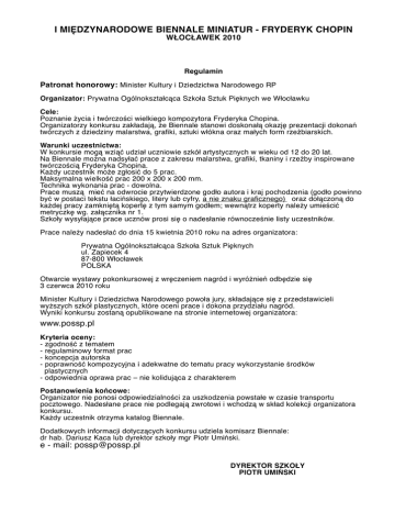 I MIĘDZYNARODOWE BIENNALE MINIATUR - FRYDERYK CHOPIN WŁOCŁAWEK 2010 Regulamin Patronat honorowy: Minister Kultury i Dziedzictwa Narodowego RP Organizator: Prywatna Ogólnokształcąca Szkoła Sztuk Pięknych we Włocławku Cele: Poznanie życia i twórczości wielkiego kompozytora Fryderyka Chopina. Organizatorzy konkursu zakładają, że Biennale stanowi doskonałą okazję prezentacji dokonań twórczych z dziedziny malarstwa, grafiki, sztuki włókna oraz małych form rzeźbiarskich. Warunki uczestnictwa: W konkursie mogą wziąć udział uczniowie szkół artystycznych w wieku od 12 do 20 lat. Na Biennale można nadsyłać prace z zakresu malarstwa, grafiki, tkaniny i rzeźby inspirowane twórczością Fryderyka Chopina. Każdy uczestnik może zgłosić do 5 prac. Maksymalna wielkość prac 200 x 200 x 200 mm. Technika wykonania prac - dowolna. Prace muszą mieć na odwrocie przytwierdzone godło autora i kraj pochodzenia (godło powinno być w postaci tekstu łacińskiego, litery lub cyfry, a nie znaku graficznego) oraz dołączoną do każdej pracy zamkniętą kopertę z tym samym godłem; wewnątrz koperty należy umieścić metryczkę wg. załącznika nr 1. Szkoły wysyłające prace ucznów prosi się o nadesłanie równocześnie listy uczestników. Prace należy nadesłać do dnia 15 kwietnia 2010 roku na adres organizatora: Prywatna Ogólnokształcąca Szkoła Sztuk Pięknych ul. Zapiecek 4 87-800 Włocławek POLSKA Otwarcie wystawy pokonkursowej z wręczeniem nagród i wyróżnień odbędzie się 3 czerwca 2010 roku Minister Kultury i Dziedzictwa Narodowego powoła jury, składające się z przedstawicieli wyższych szkół plastycznych, które oceni prace i dokona przydziału nagród. Wyniki konkursu zostaną opublikowane na stronie internetowej organizatora: www.possp.pl Kryteria oceny: - zgodność z tematem - regulaminowy format prac - koncepcja autorska - poprawność kompozycyjna i adekwatne do tematu pracy wykorzystanie środków plastycznych - odpowiednia oprawa prac – nie kolidująca z charakterem Postanowienia końcowe: Organizator nie ponosi odpowiedzialności za uszkodzenia powstałe w czasie transportu pocztowego. Nadesłane prace nie podlegają zwrotowi i wchodzą w skład kolekcji organizatora konkursu. Każdy uczestnik otrzyma katalog Biennale. Dodatkowych informacji dotyczących konkursu udziela komisarz Biennale: dr hab. Dariusz Kaca lub dyrektor szkoły mgr Piotr Umiński. e - mail: [email protected] DYREKTOR SZKOŁY PIOTR UMIŃSKI Załącznik nr 1 imię i nazwisko autora pracy................................................................................................................ data urodzenia..................................................................................................................................... tytuł pracy............................................................................................................................................ nazwa i adres szkoły............................................................................................................................ ............................................................................................................................ ............................................................................................................................ ............................................................................................................................ e-mail szkoły........................................................................................................................................ imię i nazwisko nauczyciela / opiekuna................................................................................................ .................................................................................................