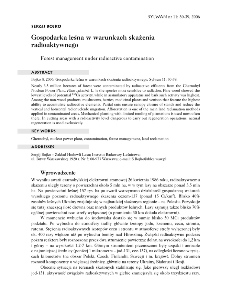 sylwan nr 11: 30−39, 2006 Sergij Bojko Gospodarka leśna w warunkach skażenia radioaktywnego Forest management under radioactive contamination ABSTRACT Bojko S. 2006. Gospodarka leśna w warunkach skażenia radioaktywnego. Sylwan 11: 30−39. Nearly 3.5 million hectares of forest were contaminated by radioactive effluents from the Chernobyl Nuclear Power Plant. Pinus sylvestris L. is the species most sensitive to radiation. Pine wood showed the lowest levels of potential 137Cs activity, while in assimilatory apparatus and bark such activity was highest. Among the non−wood products, mushrooms, berries, medicinal plants and venison that feature the highest ability to accumulate radioactive elements. Partial cuts ensure canopy closure of stands and reduce the vertical and horizontal radionucleide migration. Afforestation is one of the main land reclamation methods applied in contaminated areas. Mechanical planting with limited tending of plantations is used most often there. In cutting areas with a radioactivity level dangerous to carry out regeneration operations, natural regeneration is used exclusively. KEY WORDS Chernobyl, nuclear power plant, contamination, forest management, land reclamation Addresses Sergij Bojko – Zakład Hodowli Lasu; Instytut Badawczy Leśnictwa; ul. Bitwy Warszawskiej 1920 r. Nr 3; 00−973 Warszawa; e−mail: [email protected] Wprowadzenie W wyniku awarii czarnobylskiej elektrowni atomowej 26 kwietnia 1986 roku, radioaktywnemu skażeniu uległy tereny o powierzchni około 5 mln ha, w w tym lasy na obszarze ponad 3,5 mln ha. Na powierzchni leśnej 157 tys. ha po awarii wstrzymano działalność gospodarczą wskutek wysokiego poziomu radioaktywnego skażenia cezem−137 (ponad 15 Ci/km2). Blisko 40% zasobów leśnych Ukrainy znajduje się w najbardziej skażonym regionie – na Polesiu. Pozyskuje się tutaj znaczącą ilość drewna oraz innych produktów leśnych. Lasy zajmują także blisko 70% ogólnej powierzchni tzw. strefy wyłączonej (o promieniu 30 km dokoła elektrowni). W momencie wybuchu do środowiska dostało się w sumie blisko 50 MCi produktów podziału. Po wybuchu do atmosfery trafiły głównie izotopy jodu, ksenonu, cezu, strontu, rutenu. Stężenia radioaktywnych izotopów cezu i strontu w atmosferze strefy wyłączonej były ok. 400 razy większe niż po wybuchu bomby nad Hiroszimą. Związki radioaktywne podczas pożaru reaktora były roznoszone przez dwa strumienie powietrza: dolny, na wysokości do 1,2 km i górny – na wysokości 1,2−7 km. Górnym strumieniem przenoszone były cząstki i aerozole o najmniejszej średnicy (poniżej 1 mikrometra – jod−131, cez−137), na odległości liczone w tysią− cach kilometrów (na obszar Polski, Czech, Finlandii, Szwecji i in. krajów). Dolny strumień roznosił komponenty o większej średnicy, głównie na tereny Ukrainy, Białorusi i Rosji. Obecnie sytuacja na terenach skażonych stabilizuje się. Jako pierwszy uległ rozkładowi jod−131, aktywność związków radioaktywnych w glebie zmniejszyła się około trzydziestu razy. Gospodarka leśna w warunkach skażenia radioaktywnegoł 31 Głównymi czynnikami skażenia radioaktywnego są obecnie związki cezu, strontu i plutonu. Stopień zanieczyszczenia i przestrzenny rozkład stref skażenia jest uwarunkowany różnymi mechanizmami emisji, a także warunkami meteorologicznymi, ukształtowaniem terenu i charakterem krajobrazu. Najwięcej terenów Ukrainy zostało zanieczyszczonych cezem−137. Większość związków radioaktywnych zaległo w powierzchniowej warstwie gleby (0−5 cm). Nagromadzenie w środowisku tak dużej ilości radionuklidów nie znajduje analogii w świecie. Podział skażonych lasów na strefy Na terenach leśnych o poziomie skażenia gleby cezem−137 ponad 1 Ci/km2 gospodarka leśna realizowana jest zgodnie z „Wytycznymi prowadzenia gospodarki leśnej w warunkach skażenia radioaktywnego”, opracowanymi przez naukowców Ukraińskiego Instytutu Badawczego Leśnictwa i Melioracji Leśnej. Obecnie na tym terenie działa 70 nadleśnictw, w których zatru− dnionych jest 36 tysięcy osób, czyli 34% wszystkich pracujących w sektorze leśnym na Ukrainie [Państwowy Komitet Gospodarki Leśnej Ukrainy], stworzenie więc bezpiecznych warunków pracy i ochrona zdrowia ludzi pracujących na zanieczyszczonych terenach jest ważnym proble− mem o wymiarze społecznym. Ograniczenia w prowadzeniu i użytkowaniu produkcji leśnej dla poszczególnych stref i podstref w zależności od poziomu zanieczyszczenia gleby cezem−137 podano w tabeli 1. Gospodarka leśna w lasach strefy wyłączonej jest według wytycznych Ministerstwa Sytu− acji Nadzwyczajnych Ukrainy zróżnicowana na trzy typy [Korobko i in. 2005]: Gospodarka kontrolowana prowadzona na terenie o zanieczyszczeniu radioaktywnym 137Cs do 40 Ci/km2, 90Sr do 3 Ci/km2 oraz 238,239,240Pu – do 0,1 Ci/km2. Na tych terenach możliwe jest pozyskanie drewna przy obowiązkowym okorowaniu. Powierzchnia lasów zagospodaro− wanych w sposób kontrolowany wynosi 34% terenów leśnych strefy wyłączonej. Gospodarka limitowana stosowana na terenie, gdzie poziomy zanieczyszczenia wynoszą: 137Cs do 40 – 100 Ci/km2, 90Sr do 10 Ci/km2, 238,239,240Pu – do 0,3 Ci/km2. Powierzchnia leśna objęta tym typem zagospodarowania wynosi 27% terenów leśnych strefy wyłączonej. Tutaj gospodarka wyróżnia się ograniczeniem działalności do zabiegów zmierzających do poprawy sanitarnego i przeciwpożarowego stanu lasu. Tabela 1. Podział lasów według poziomu radioaktywnego zanieczyszczenia gleby cezem 137 Division of forests in relation to radioactive contamination of soil by 137Cs Strefa Podstrefa Poziom zanieczyszczenia gleby 1 137Cs, Ci/km2 – >15,1 a 5,1−7,0 b c 7,1−10,0 10,1−15,0 a 1,1−2,0 b 2,1−5,0 2 3 Ograniczenia w prowadzeniu i użytkowaniu produkcji leśnej Ograniczenie ciągłości pracy przy wykonaniu zabiegów gospodarczych. Specjalny reżim prowad