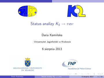 Status analizy KS → πeν Daria Kamińska Uniwersytet Jagielloński w Krakowie 6 sierpnia 2013 Daria Kamińska Status analizy KS → πeν 6 sierpnia 2013 1 / 12 Analizowana próbka: tylko wygenerowany i zrekonstruowany sygnał, który przeszedł cięcia na położenie wierzchołka reakcji, Mππ i kąt rozwarcia. Schemat wyszukiwania cząstek z reakcji KS → πeν o pojedynczym zrekonstruowanym śladzie dającym sygnał w kalorymetrze szukanie kandydatów poprzez porównywanie kine wygenerowanego sygnału z blokiem trkkine1, szukanie połączenia bloku TRK z TRK-VTX, sprawdzenie czy do procesu rekonstrukcji użyte zostały cząstki będące sygnałem, sprawdzenie czy w DC nie ma dodatkowych wierzchołków, szukanie połączenia śladu z klastrem. Daria Kamińska Status analizy KS → πeν 6 sierpnia 2013 2 / 12 program errors for reconstructed signal program errors for reconstructed signal Entries 55364 Entries 40000 55364 35000 35000 30000 30000 25000 entries entries 25000 20000 20000 15000 15000 10000 10000 5000 5000 0 1 2 3 4 5 6 0 7 1 error information for electron 1. 3. 5. zdarzenie ok brak połączenia między tablicami trk i vtx-trk istnieje dodatkowy wierzchołek w DC Daria Kamińska 2 3 4 5 6 7 error information for pion 2. 4. 6. sygnał nie został zrekonstruowany (brak kine sygnału w trkkine1) zrekonstruowany ślad nie jest sygnałem brak połączenia między śladem a klastrem Status analizy KS → πeν 6 sierpnia 2013 3 / 12 Schamat znajdowania najszybszego klastra warunek konieczny: ślady od obu wygenerowanych a następnie zrekonstruowanych cząstek z rozpadu KS dały sygnał w kalorymetrze, szukanie najszybszego klastra w bloku CLU (i o tcl>0), sprawdzanie informacji czy nie jest to klaster odpowiadający: KL crash, π, e sprawdzenie PIDu cząstki (pid1) Daria Kamińska Status analizy KS → πeν 6 sierpnia 2013 4 / 12 fastest track - statistic 16000 Entries 21141 14000 Typ najszybszej cząstki 1 - KL crash, 12000 2 - π+ / π−, entries 10000 3 - e / ē, 8000 4 - inna cząstka (1-3 to cząstki będące sygnałem, procedura wyboru opisana wcześniej) 6000 4000 2000 0 1 1.5 2 2.5 3 3.5 4 4.5 5 the fastest track Daria Kamińska Status analizy KS → πeν 6 sierpnia 2013 5 / 12 fastest track PID for reconstructed signal Entries 21141 8000 7000 PIDy najszybszych cząstek 6000 Tabela PID entries 1 GAMMA 5000 2 POSITRON 3 ELECTRON 4000 4 NEUTRINO 5 MUON + 3000 6 MUON 7 PION 0 2000 8 PION + 9 PION - 1000 0 10 KAON 0 LONG 0 2 4 6 8 10 12 the fastest track PID Daria Kamińska Status analizy KS → πeν 6 sierpnia 2013 6 / 12 fastest track - statistic Entries 21141 8000 PIDy najszybszych cząstek 7000 6000 Tabela PID entries 1 GAMMA 5000 2 POSITRON 3 ELECTRON 4000 4 NEUTRINO 5 MUON + 3000 6 MUON 7 PION 0 2000 8 PION + 9 PION - 1000 0 10 KAON 0 LONG 0 2 4 6 8 10 12 the fastest track Daria Kamińska Status analizy KS → πeν 6 sierpnia 2013 7 / 12 PAW > n/ s c a n 2 t i m e W i n n e r p i d . eq . 0 . and . m c t r u t h . eq . 1 1 2 ! t i m e W i n n e r N C l u t c l i n t ( n p a r ) i n t ( pnum1 ) i n t ( p i d 1 ) +−−−−−−−+−−−−−−−−−−−−−−−−−−−+−−−−−−−−−−−−−−+−−−−−−−−−−−−−−+−−−−−−−−−−−−−−−+−−−−−−−−−−−−−−+ | Event | timeWinnerNClu | tcl | i n t ( npar ) | i n t ( pnum1 ) | i n t ( pid1 ) | +−−−−−−−+−−−−−−−−−−−−−−−−−−−+−−−−−−−−−−−−−−+−−−−−−−−−−−−−−+−−−−−−−−−−−−−−−+−−−−−−−−−−−−−−+ | 2 | 1 | | | | | | ∗ 1 | | −70.0258 | 1 | 0 | 0 | | ∗ 2 | | −67.2391 | 1 | 0 | 0 | | ∗ 3 | | 5.71756 | 1 | 9 | 9 | | ∗ 4 | | 28.5099 | 4 | 5 | 1 | | ∗ 5 | | 32.9201 | 1 | 3 | 13 | | ∗ 6 | | 41.0677 | 1 | 8 | 1 | | ∗ 7 | | 42.4926 | 1 | 8 | 1 | | ∗ 8 | | 42.6056 | 1 | 5 | 1 | | ∗ 9 | | 42.9509 | 1 | 8 | 1 | | ∗ 10 | | 43.2452 | 1 | 8 | 1 | | ∗ 11 | | 151.364 | 1 | 2 | 10 | +−−−−−−−+−−−−−−−−−−−−−−−−−−−+−−−−−−−−−−−−−−+−−−−−−−−−−−−−−+−−−−−−−−−−−−−−−+−−−−−−−−−−−−−−+ Daria Kamińska Status analizy KS → πeν 6 sierpnia 2013 8 / 12 β * for reconstructed signal Entries 21141 1600 1400 entries 1200 1000 800 600 400 200 0 0.2 0.205 0.21 0.215 0.22 0.225 0.23 0.235 0.24 0.245 0.25 β* Daria Kamińska Status analizy KS → πeν 6 sierpnia 2013 9 / 12 Entries 2000 21141 1750 1500 entries 1250 1000 750 500 250 0 180 190 200 210 220 230 240 250 260 270 t0new Daria Kamińska Status analizy KS → πeν 6 sierpnia 2013 10 / 12 Entries 2000 21141 1750 1500 entries 1250 1000 750 500 250 0 200 210 220 230 240 250 260 t0new Daria Kamińska Status analizy KS → πeν 6 sierpnia 2013 11 / 12 Dodatkowe informacje fillstruct ke3%t p h a s e d m c ke3%t 0 d c 0 ke3%t 0 h i t 0 ke3%t 0 c l u 0 ke3%T 0 s t e p 1 ke3%D e l a y C a b l e ke3%Tbunch ke3%TimeSec ke3%TimeMusec = = = = = = = = = E vt%T 0 s t r u%t p h a s e d m c E vt%T 0 s t r u%d c s t e p 0 E vt%T 0 s t r u%h i t s t e p 0 Ev t%T 0 s t r u%c l u s s t e p 0 E vt%T 0 s t r u%s t e p 1 Ev t%T 0 s t r u%c a b l e E vt%T 0 s t r u%t b u n c h TimeSec TimeMusec t0timefix . kloe 133 d e l t a t = (CLUSTER%t ( T0FIX%t 0 e l e c t e d )+T0STRU%c l u s s t e p 0+ 134 & T0STRU%s t e p 1 )∗ T0FIX%t i m e s c a l e − 135 & sqrt ( 136 & CLUSTER%x ( T0FIX%t 0 e l e c t e d )∗∗2+ 137 & CLUSTER%y ( T0FIX%t 0 e l e c t e d )∗∗2+ 138 & CLUSTER%z ( T0FIX%t 0 e l e c t e d )∗∗2)/ 139 & c light 140 t trig = −d e l t a t + T0FIX%d e c a b l e 141 n bunch = n i n t ( t t r i g / T0FIX%debunch ) 142 T0FIX%t0new = −n b u n c h ∗T0FIX%debunch +T0FIX%d e c a b l e ks 3pi0 new . kloe E v t%n t p E v t%t 0 e v t = T0FIX%t0new Daria Kamińska S