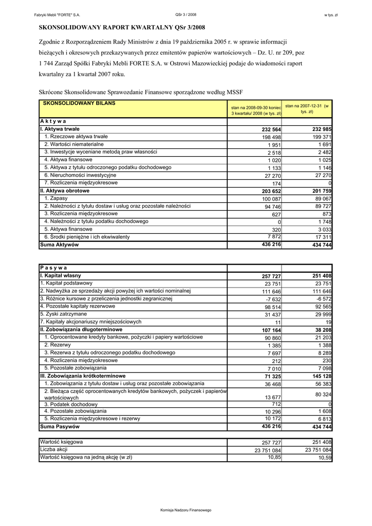 Fabryki Mebli "FORTE" S.A. QSr 3 / 2008 w tys. zł SKONSOLIDOWANY RAPORT KWARTALNY QSr 3/2008 Zgodnie z Rozporządzeniem Rady Ministrów z dnia 19 października 2005 r. w sprawie informacji bieżących i okresowych przekazywanych przez emitentów papierów wartościowych – Dz. U. nr 209, poz 1 744 Zarząd Spółki Fabryki Mebli FORTE S.A. w Ostrowi Mazowieckiej podaje do wiadomości raport kwartalny za 1 kwartał 2007 roku. Skrócone Skonsolidowane Sprawozdanie Finansowe sporządzone według MSSF SKONSOLIDOWANY BILANS stan na 2008-09-30 koniec stan na 2007-12-31 (w tys. zł) 3 kwartału/ 2008 (w tys. zł) Aktywa I. Aktywa trwałe 1. Rzeczowe aktywa trwałe 2. Wartości niematerialne 3. Inwestycje wyceniane metodą praw własności 4. Aktywa finansowe 5. Aktywa z tytułu odroczonego podatku dochodowego 6. Nieruchomości inwestycyjne 7. Rozliczenia międzyokresowe II. Aktywa obrotowe 1. Zapasy 2. Należności z tytułu dostaw i usług oraz pozostałe należności 3. Rozliczenia międzyokresowe 4. Należności z tytułu podatku dochodowego 5. Aktywa finansowe 6. Środki pieniężne i ich ekwiwalenty Suma Aktywów Pasywa I. Kapitał własny 1. Kapitał podstawowy 2. Nadwyżka ze sprzedaży akcji powyżej ich wartości nominalnej 3. Różnice kursowe z przeliczenia jednostki zegranicznej 4. Pozostałe kapitały rezerwowe 5. Zyski zatrzymane 7. Kapitały akcjonariuszy mniejszościowych II. Zobowiązania długoterminowe 1. Oprocentowane kredyty bankowe, pożyczki i papiery wartościowe 2. Rezerwy 3. Rezerwa z tytułu odroczonego podatku dochodowego 4. Rozliczenia międzyokresowe 5. Pozostałe zobowiązania III. Zobowiązania krótkoterminowe 1. Zobowiązania z tytułu dostaw i usług oraz pozostałe zobowiązania 2. Bieżąca część oprocentowanych kredytów bankowych, pożyczek i papierów wartościowych 3. Podatek dochodowy 4. Pozostałe zobowiązania 5. Rozliczenia międzyokresowe i rezerwy Suma Pasywów Wartość księgowa Liczba akcji Wartość księgowa na jedną akcję (w zł) Komisja Nadzoru Finansowego 232 564 198 498 1 951 2 518 1 020 1 133 27 270 174 203 652 100 087 94 746 627 0 320 7 872 436 216 232 985 199 371 1 691 2 482 1 025 1 146 27 270 0 201 759 89 067 89 727 873 1 748 3 033 17 311 434 744 257 727 23 751 111 646 -7 632 98 514 31 437 11 107 164 90 860 1 385 7 697 212 7 010 71 325 36 468 251 408 23 751 111 646 -6 572 92 565 29 999 19 38 208 21 203 1 388 8 289 230 7 098 145 128 56 383 80 324 13 677 712 10 296 10 172 436 216 0 1 608 6 813 434 744 257 727 23 751 084 10,85 251 408 23 751 084 10,59 Fabryki Mebli "FORTE" S.A. SKONSOLIDOWANY RACHUNEK ZYSKÓW I STRAT DZIAŁALNOŚĆ KONTYNUOWANA I. Przychody ze sprzedaży w tym: 1. Przychody netto ze sprzedaży produktów, towarów i materiałów 2. Przychody netto ze sprzedaży usług II. Koszt własny sprzedaży III. Zysk (strata) brutto ze sprzedaży 1. Pozostałe przychody operacyjne 2. Koszty sprzedaży 3. Koszty ogólnego zarządu 4. Pozostałe koszty operacyjne IV. Zysk (strata) z działalności operacyjnej V. Przychody finansowe 1. Dywidendy od jednostek powiązanych nie objętych konsolidacją 2. Zysk ze zbycia aktywów finansowych 3. Aktualizacja wartości aktywów finansowych 4. Odsetki 5. Instrumenty finansowe ( kontrakty forward ) 6. Dodatnie różnice kursowe od aktywów i zobowiązań finansowych 7. Pozostałe przychody finansowe VI. Koszty finansowe 1. Odsetki od kredytów i pożyczek 2. Prowizje od kredytów 3. Ujemne różnice kursowe od aktywów i zobowiązań finansowych 4. Instrumenty finansowe ( kontrakty forward ) 5. Pozostałe koszty finansowe VII. Udział w zyskach jednostek rozliczanych metodą praw własności VIII. Zysk (strata) brutto IX. Podatek dochodowy a) część bieżąca b) część odroczona X. Zysk (strata) netto Zysk Udziałówców mniejszościowych Zysk strata netto z działalności kontynuowanej Przypadający: - akcjonariuszom jednostki dominującej - akcjonariuszom mniejszościowym Zysk (strata) netto na jedną akcję: - podstawowy/rozwodniony z wyniku za okres QSr 3 / 2008 w tys. zł 3 kwartał 2007 okres od 3 kwartały / 2007 okres 3 kwartał 2008 okres od 3 kwartały 2008 okres 2008-07-01 do 2008-09- od 2008-01-01 do 2008- 2007-07-01 do 2007-09- od 2007-01-01 do 200709-30 30 09-30 30 115 128 334 377 114 388 332 105 740 82 254 32 874 (1 482) 19 630 7 192 1 069 3 501 1 663 2 272 242 819 91 558 5 266 54 058 23 927 9 112 9 727 5 757 22 0 0 7 0 206 0 0 26 0 1 278 356 2 157 1 873 88 5 101 424 5 588 5 221 166 4 509 7 185 0 0 22 1 094 4 0 91 2 807 1 688 6 656 0 1 408 1 350 48 0 3 847 3 742 95 0 0 0 10 0 10 12 1 463 426 (324) (926) 602 102 (1 275) (413) (1 364) 951 (1 688) 1 -1 11 (1 695) 7 451 8 101 1 (1 706) 11 0,31 0,00 (0) 36 9 932 2 473 2 695 (222) 7 459 Komisja Nadzoru Finansowego 336 131 256 173 84 467 4 053 57 535 30 448 9 171 (8 634) 9 743 4 3 011 565 1 834 (1 269) 2 446 0,10 104 183 1 122 201 2 443 3 340 640 78 439 26 866 2 418 18 582 9 123 2 568 (989) 2 811 0 0 196 3 105 305 8 QSr 3 / 2008 Fabryki Mebli "FORTE" S.A. w tys. zł SKONSOLIDOWANE ZESTAWIENIE ZMIAN W KAPITALE WŁASNYM za okres 9 miesięcy 2008 roku Nadwyżka ze sprzedaży akcji powyżej ich wartości nominalnej Kapitał Podstawowy Na dzień 1 stycznia 2008 roku 23 751 Różnice kursowe z Zyski przeliczenia zatrzymane/stra jednostki ty niepokryte zagranicznej 111 646 -6 572 29 999 Pozostałe kapitały rezerwowe 92 565 Kapitał Kapitał własny akcjonariuszy ogółem mniejszościowych 19 251 408 1. Emisja akcji 2. Odpis wyniku lat ubiegłych na kapitał rezerwowy 3. Wypłata dywidendy 0 4. Wynik finansowy okresu 7 459 5. Różnice kursowe z przeszacowania Na dzień 30 września 2008 roku -72 23 751 -8 -1 060 111 646 -7 632 7 451 -1 132 37 458 92 565 11 257 727 SKONSOLIDOWANE ZESTAWIENIE ZMIAN W KAPITALE WŁASNYM za okres 9 miesięcy 2007 roku Nadwyżka ze sprzedaży akcji powyżej ich wartości nominalnej Kapitał Podstawowy Na dzień 1 stycznia 2007 roku 23 751 Różnice kursowe z Zyski przeliczenia zatrzymane/stra jednostki ty