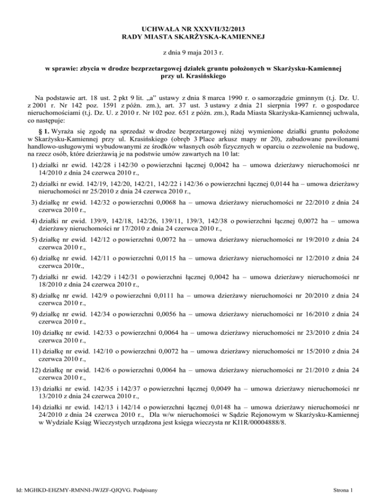 UCHWAŁA NR XXXVII/32/2013 RADY MIASTA SKARŻYSKA-KAMIENNEJ z dnia 9 maja 2013 r. w sprawie: zbycia w drodze bezprzetargowej działek gruntu położonych w Skarżysku-Kamiennej przy ul. Krasińskiego Na podstawie art. 18 ust. 2 pkt 9 lit. „a” ustawy z dnia 8 marca 1990 r. o samorządzie gminnym (t.j. Dz. U. z 2001 r. Nr 142 poz. 1591 z późn. zm.), art. 37 ust. 3 ustawy z dnia 21 sierpnia 1997 r. o gospodarce nieruchomościami (t.j. Dz. U. z 2010 r. Nr 102 poz. 651 z późn. zm.), Rada Miasta Skarżyska-Kamiennej uchwala, co następuje: § 1. Wyraża się zgodę na sprzedaż w drodze bezprzetargowej niżej wymienione działki gruntu położone w Skarżysku-Kamiennej przy ul. Krasińskiego (obręb 3 Place arkusz mapy nr 20), zabudowane pawilonami handlowo-usługowymi wybudowanymi ze środków własnych osób fizycznych w oparciu o zezwolenie na budowę, na rzecz osób, które dzierżawią je na podstwie umów zawartych na 10 lat: 1) działki nr ewid. 142/28 i 142/30 o powierzchni łącznej 0,0042 ha – umowa dzierżawy nieruchomości nr 14/2010 z dnia 24 czerwca 2010 r., 2) działki nr ewid. 142/19, 142/20, 142/21, 142/22 i 142/36 o powierzchni łącznej 0,0144 ha – umowa dzierżawy nieruchomości nr 25/2010 z dnia 24 czerwca 2010 r., 3) działkę nr ewid. 142/32 o powierzchni 0,0068 ha – umowa dzierżawy nieruchomości nr 22/2010 z dnia 24 czerwca 2010 r., 4) działki nr ewid. 139/9, 142/18, 142/26, 139/11, 139/3, 142/38 o powierzchni łącznej 0,0072 ha – umowa dzierżawy nieruchomości nr 17/2010 z dnia 24 czerwca 2010 r., 5) działkę nr ewid. 142/12 o powierzchni 0,0072 ha – umowa dzierżawy nieruchomości nr 19/2010 z dnia 24 czerwca 2010 r., 6) działkę nr ewid. 142/11 o powierzchni 0,0115 ha – umowa dzierżawy nieruchomości nr 12/2010 z dnia 24 czerwca 2010r., 7) działki nr ewid. 142/29 i 142/31 o powierzchni łącznej 0,0042 ha – umowa dzierżawy nieruchomości nr 18/2010 z dnia 24 czerwca 2010 r., 8) działkę nr ewid. 142/9 o powierzchni 0,0111 ha – umowa dzierżawy nieruchomości nr 20/2010 z dnia 24 czerwca 2010 r., 9) działkę nr ewid. 142/34 o powierzchni 0,0056 ha – umowa dzierżawy nieruchomości nr 16/2010 z dnia 24 czerwca 2010 r., 10) działkę nr ewid. 142/33 o powierzchni 0,0064 ha – umowa dzierżawy nieruchomości nr 23/2010 z dnia 24 czerwca 2010 r., 11) działkę nr ewid. 142/10 o powierzchni 0,0072 ha – umowa dzierżawy nieruchomości nr 15/2010 z dnia 24 czerwca 2010 r., 12) działkę nr ewid. 142/6 o powierzchni 0,0064 ha – umowa dzierżawy nieruchomości nr 21/2010 z dnia 24 czerwca 2010 r., 13) działki nr ewid. 142/35 i 142/37 o powierzchni łącznej 0,0049 ha – umowa dzierżawy nieruchomości nr 13/2010 z dnia 24 czerwca 2010 r., 14) działki nr ewid. 142/13 i 142/14 o powierzchni łącznej 0,0148 ha – umowa dzierżawy nieruchomości nr 24/2010 z dnia 24 czerwca 2010 r., Dla w/w nieruchomości w Sądzie Rejonowym w Skarżysku-Kamiennej w Wydziale Ksiąg Wieczystych urządzona jest księga wieczysta nr KI1R/00004888/8. Id: MGHKD-EHZMY-RMNNI-JWJZF-QJQVG. Podpisany Strona 1 § 2. Wyraża się zgodę na sprzedaż w drodze bezprzetargowej niżej wymienione działki gruntu - bez których nie mogą funkcjonować działki wymienione § 1 niniejszej uchwały - położone w Skarżysku-Kamiennej przy ul. Krasińskiego (obręb 3 Place arkusz mapy nr 20), na których wykonane zostały ciągi komunikacyjne (ciągi piesze, fontanna) wybudowane ze środków własnych osób fizycznych w oparciu o zezwolenie na budowę, na rzecz osób, które dzierżawią je na podstawie umów zawartych na 10 lat: 1) działki nr ewid. 1/2, 1/4, 142/23, 142/27 o powierzchni łącznej 0,0399 ha oraz 1/2 udziału w działce nr 139/6 o powierzchni 0,0317 ha – umowa dzierżawy nieruchomości nr 28/2010 z dnia 24 czerwca 2010 r., 2) działki nr ewid. 139/1, 139/4, 139/10 i 139/12 o powierzchni łącznej 0,0040 ha – umowa dzierżawy nieruchomości nr 26/2010 z dnia 24 czerwca 2010 r., 3) działkę nr ewid. 142/3 o powierzchni 0,0413 ha – umowa dzierżawy nieruchomości nr 29/2010 z dnia 24 czerwca 2010 r., 4) działkę nr ewid. 142/8 o powierzchni 0,0755 ha – umowa dzierżawy nieruchomości nr 30/2010 z dnia 24 czerwca 2010 r., 5) działkę nr ewid. 142/15 o powierzchni 0,0112 ha – umowa dzierżawy nieruchomości nr 31/2010 z dnia 24 czerwca 2010 r., 6) działki nr ewid. 142/16 i 142/17 o powierzchni łącznej 0,0196 ha – umowa dzierżawy nieruchomości nr 27/2010 z dnia 24 czerwca 2010 r., Dla w/w nieruchomości w Sądzie Rejonowym w Skarżysku-Kamiennej w Wydziale Ksiąg Wieczystych urządzone są księgi nr KI1R/00004888/8 i nr KI1R/00029462/7. § 3. Warunki sprzedaży zostaną określone w protokole z rokowań. § 4. Wykonanie uchwały powierza się Prezydentowi Miasta Skarżyska-Kamiennej. § 5. Uchwała wchodzi w życie z dniem podjęcia. Przewodniczący Rady Miasta Andrzej Dąbrowski Id: MGHKD-EHZMY-RMNNI-JWJZF-QJQVG. Podpisany Strona 2 Uzasadnienie Pawilony handlowo-usługowe oraz ciągi komunikacyjne (ciągi piesze i fontanna) wybudowane na działkach będących przedmiotem sprzedaży zostały wykonane w oparciu o zezwolenie na budowę, ze środków własnych osób fizycznych. Aktualnie przedmiotowe działki są użytkowane przez te osoby na podstawie umów dzierżaw zawartych na okres 10 lat. Działki wymienione w § 2 uchwały wykorzystywane są jako ciągi komunikacyjne zapewniające dostęp do drogi publicznej działkom zabudowanym pawilonami. Obecnie właściciele pawilonów są zainteresowani wykupem dzierżawionego terenu. Powyższe umożliwi ujednolicenie charakteru władania budynków i budowli oraz gruntu na którym są one posadowione, co z kolei przyczyni się do uporządkowania spraw własnościowych na gruncie w tym rejonie miasta. Biorąc pod uwagę fakt, że przedmiotowe działki zostały zabudowane w oparciu o zezwolenie na budowę, istnieje możliwość ich sprzedaży w drodze bezprzetargowej na rzecz właścicieli poczynion